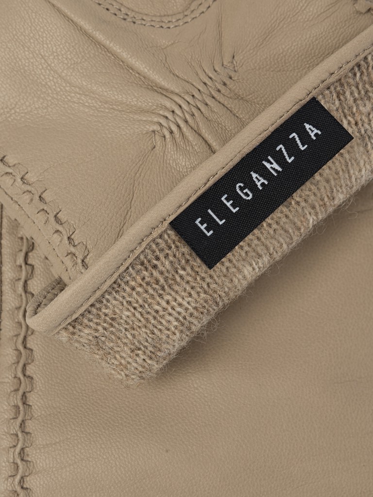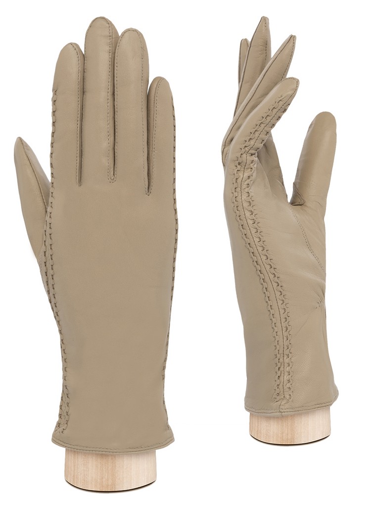 Перчатки женские торговой марки ELEGANZZA из натуральной кожи ягнёнка производства Италия. Подкладка: 85% шерсть + 15% кашемир. Отделка - два декоративных шва "метеор": вдоль указательного пальца и мизинца. Нижний край перчатки окантован. Длина манжеты от нижней точки большого пальца до края перчаток - 7,5 см. Длина пальцев - средняя.