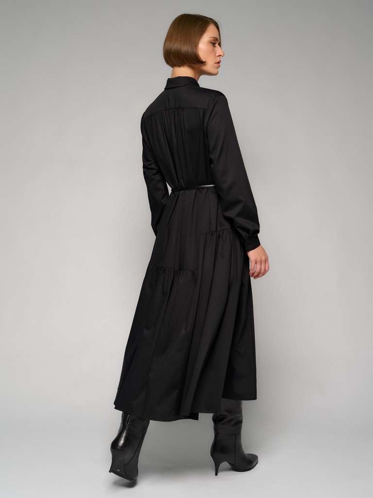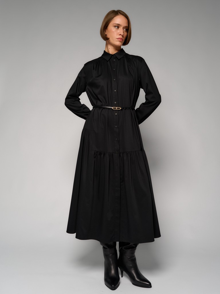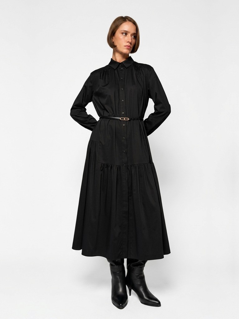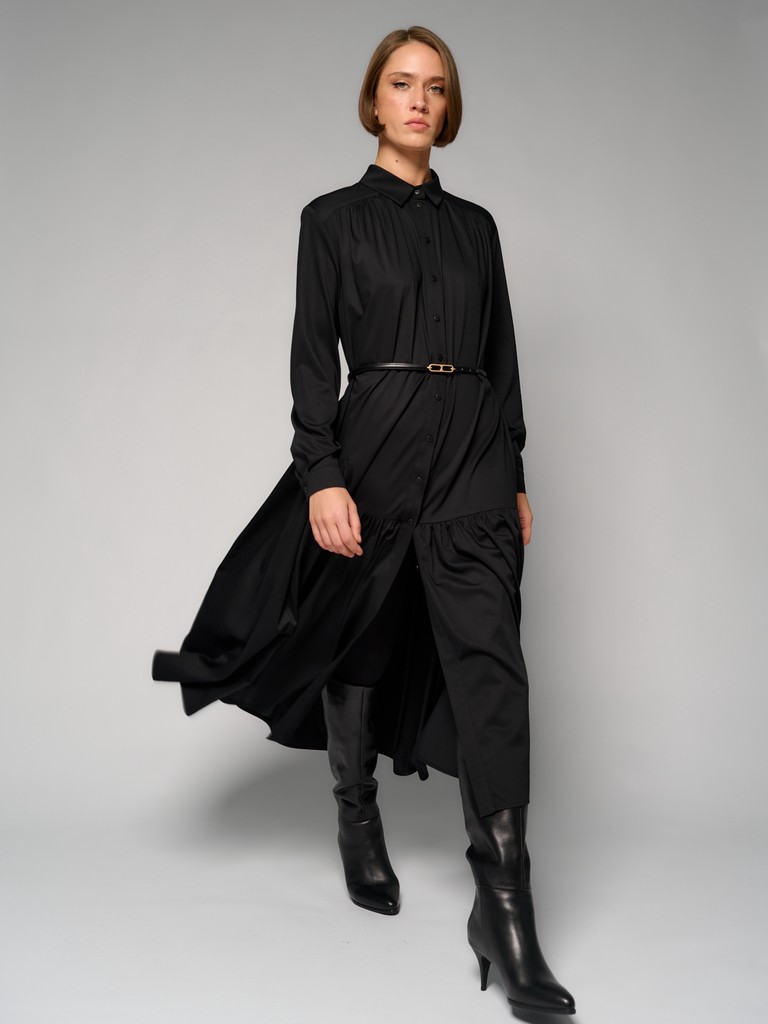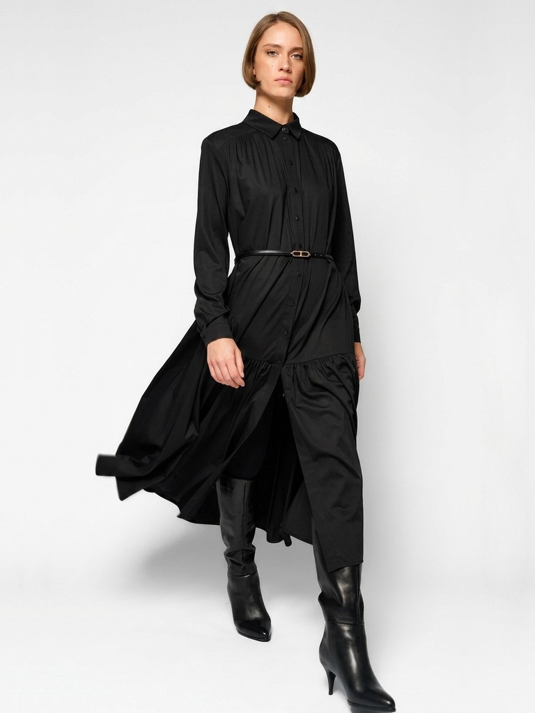 Женское платье-рубашка черного цвета. Модель с длинными рукавами, ассиметричной прострочкой юбки с воланами. В комплекте идет пояс из натуральной кожи для комфортной посадки по талии. Платье можно носить как с лодочками, босоножками, так и с кроссовками. Для усиления образа дополните платье аксессуарами от ELEGANZZA.