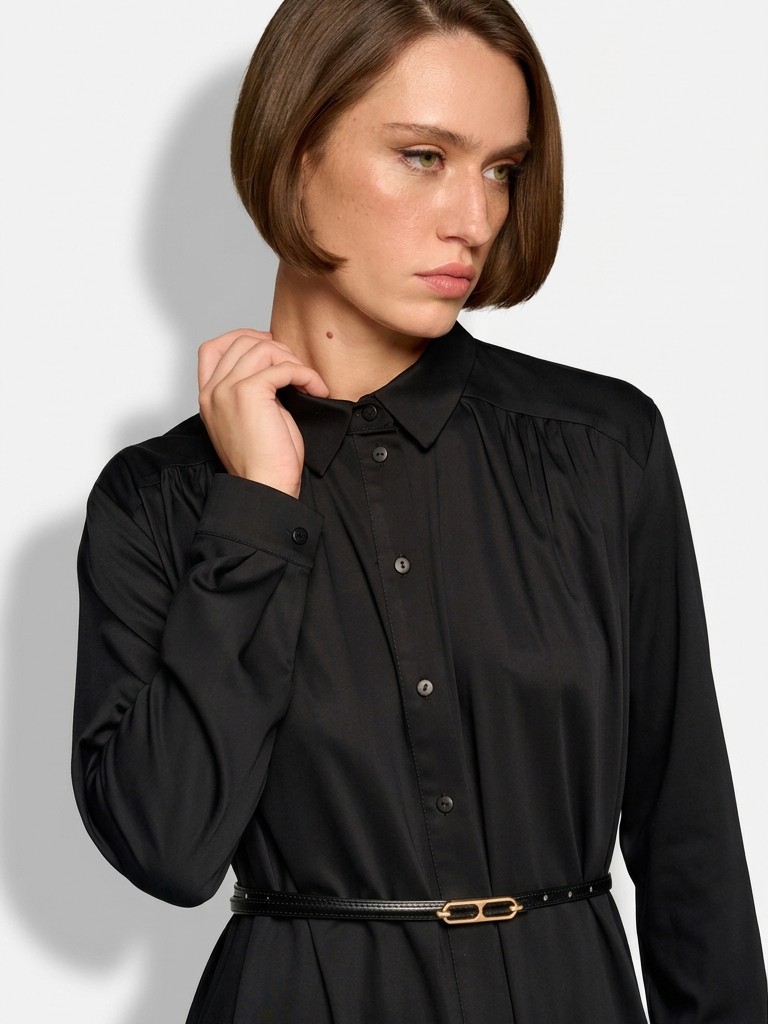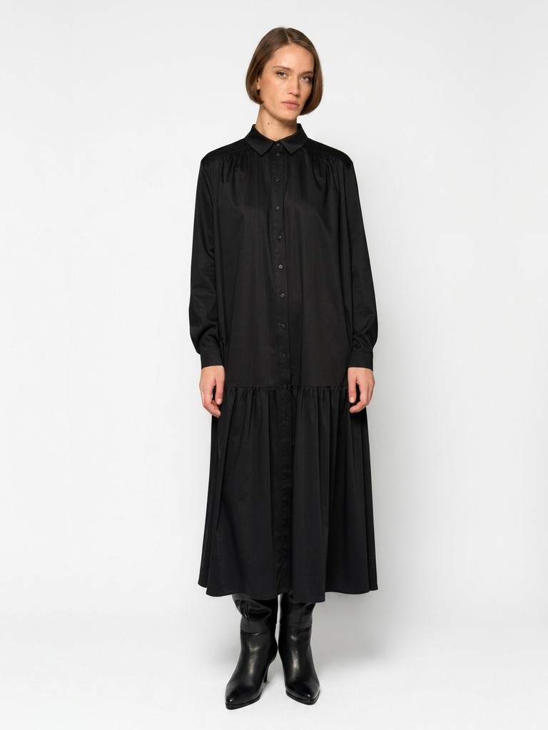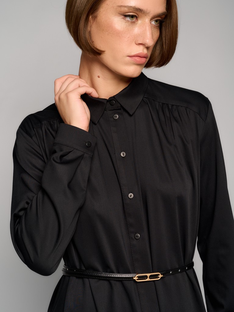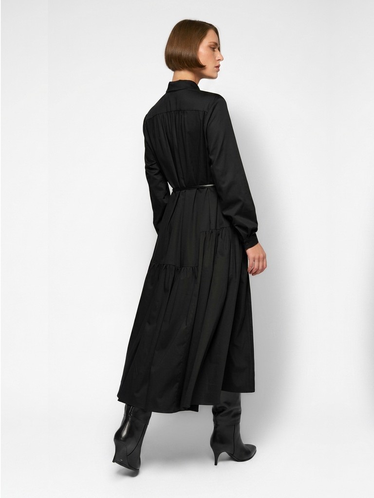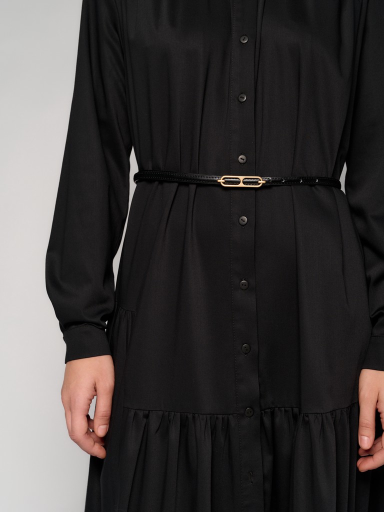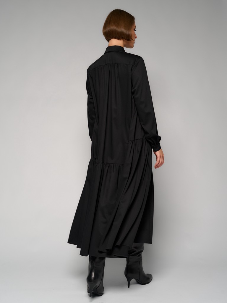 Женское платье-рубашка черного цвета. Модель с длинными рукавами, ассиметричной прострочкой юбки с воланами. В комплекте идет пояс из натуральной кожи для комфортной посадки по талии. Платье можно носить как с лодочками, босоножками, так и с кроссовками. Для усиления образа дополните платье аксессуарами от ELEGANZZA.