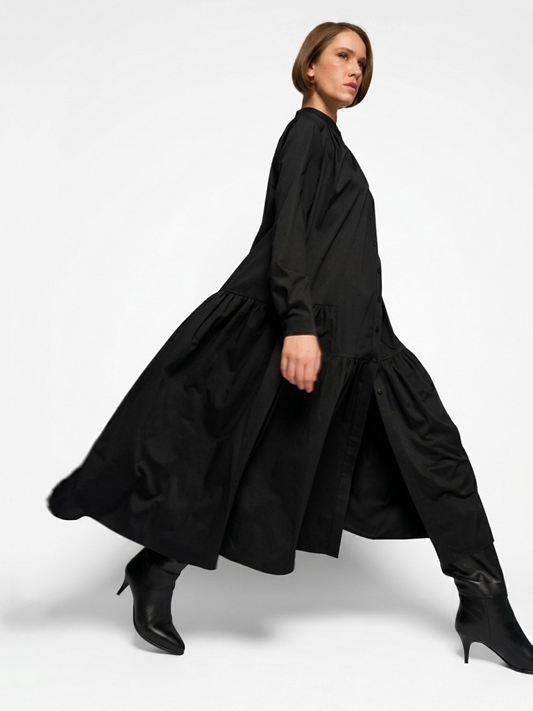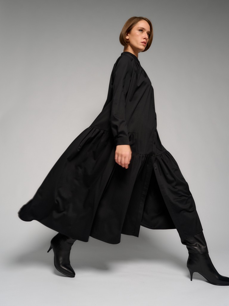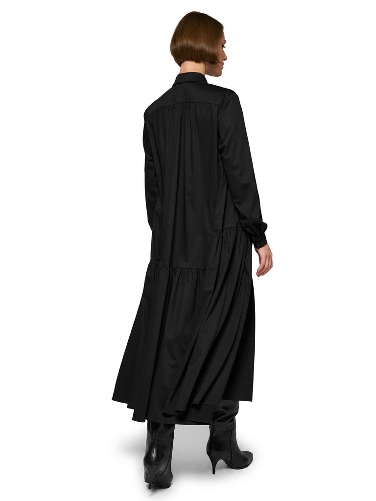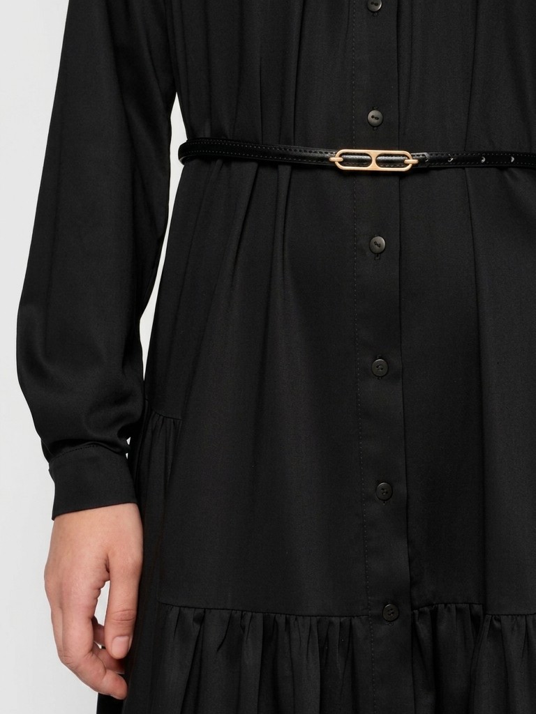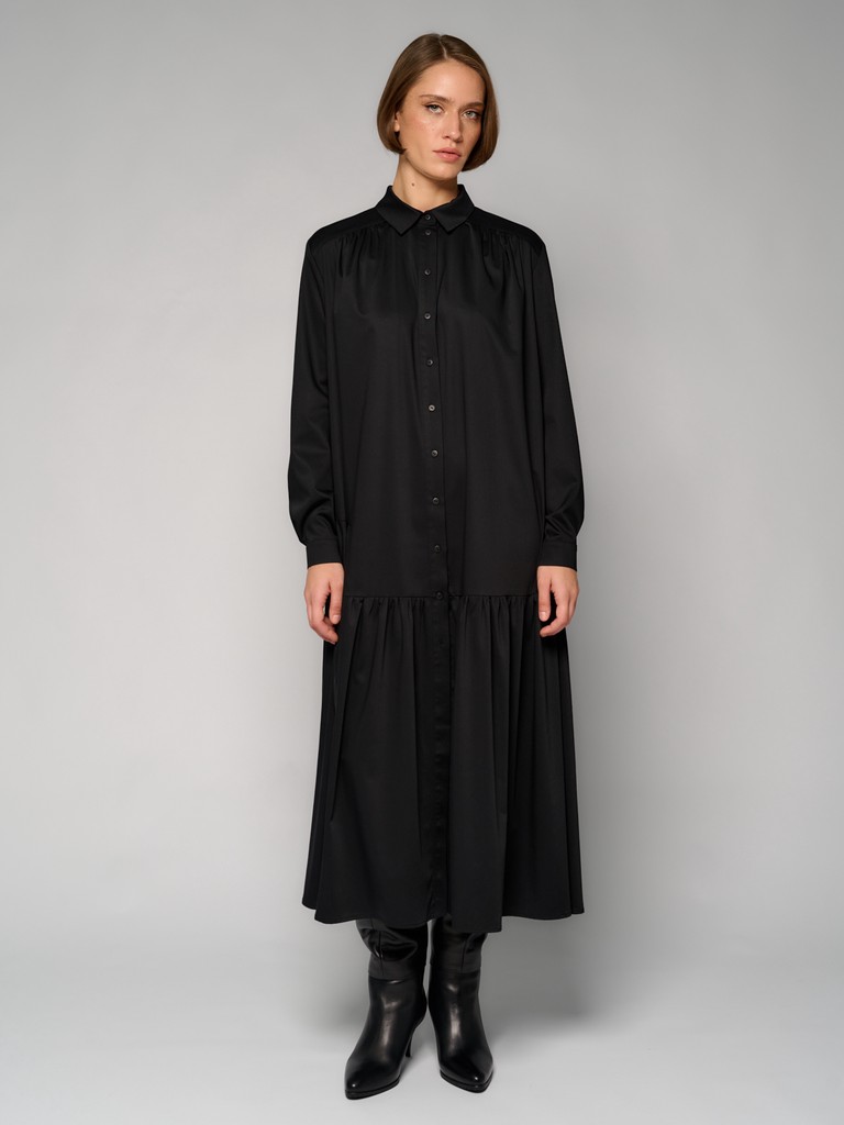 Женское платье-рубашка черного цвета. Модель с длинными рукавами, ассиметричной прострочкой юбки с воланами. В комплекте идет пояс из натуральной кожи для комфортной посадки по талии. Платье можно носить как с лодочками, босоножками, так и с кроссовками. Для усиления образа дополните платье аксессуарами от ELEGANZZA.