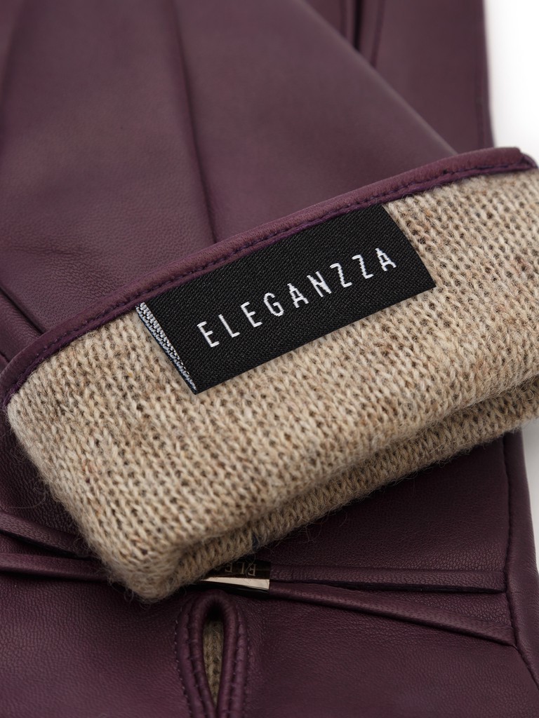 Перчатки торговой марки ELEGANZZA производства Китай выполнены из кожи ягнёнка темно-фиолетового цвета. Подкладка: 100% шерсть. Декоративные элементы - фирменная фурнитура на узких кожаных ремнях. Нижний край перчатки и разрез на лицевой стороне окантованы. Длина манжеты от нижней точки большого пальца до края перчаток - 6 см.
