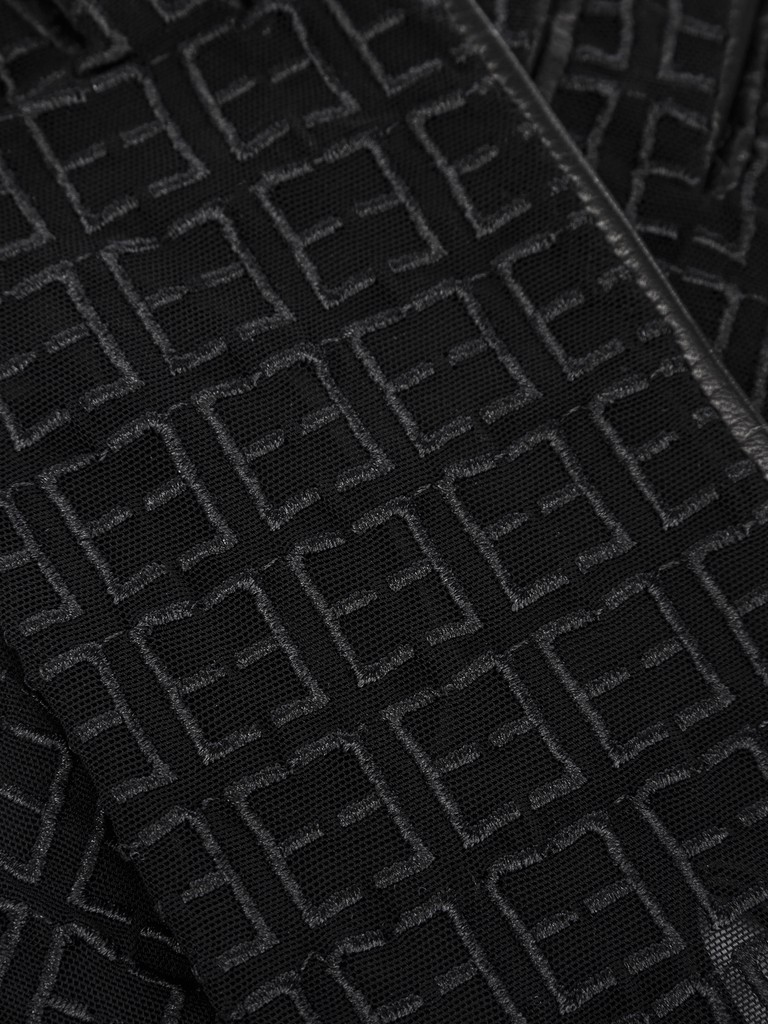 Перчатки женские торговой марки ELEGANZZA черного цвета из натуральной кожи ягненка. Производство Италия. Без подкладки. Лицевая поверхность - трикотажное полотно декорированное гипюром с серебристой фирменной символикой. Длина манжета от нижней точки большого пальца до края перчаток составляет 6,5 см. Длина пальцев - средняя.
