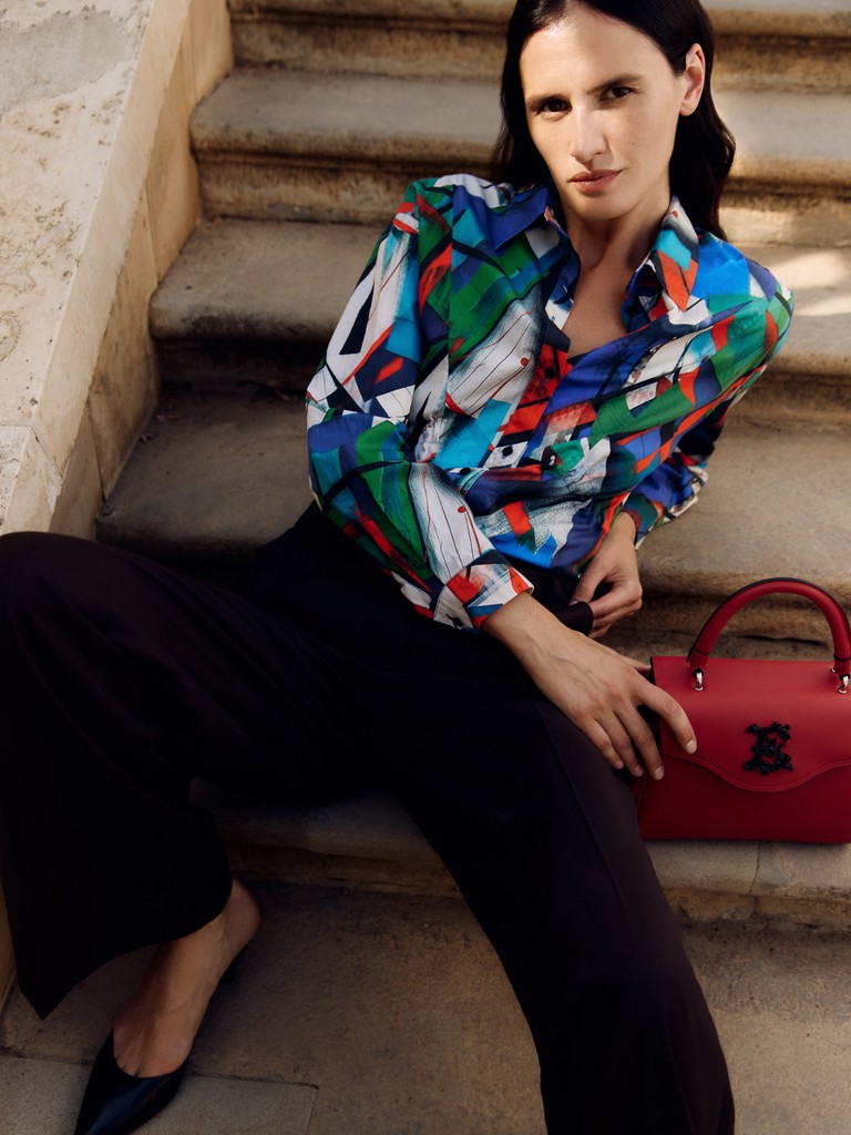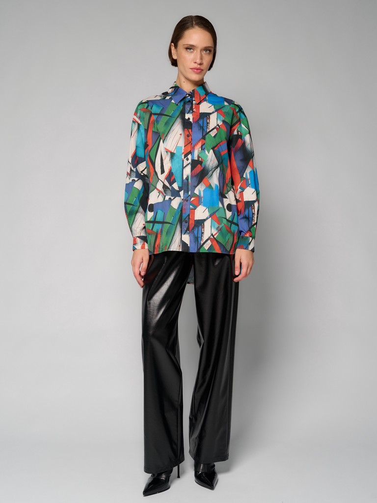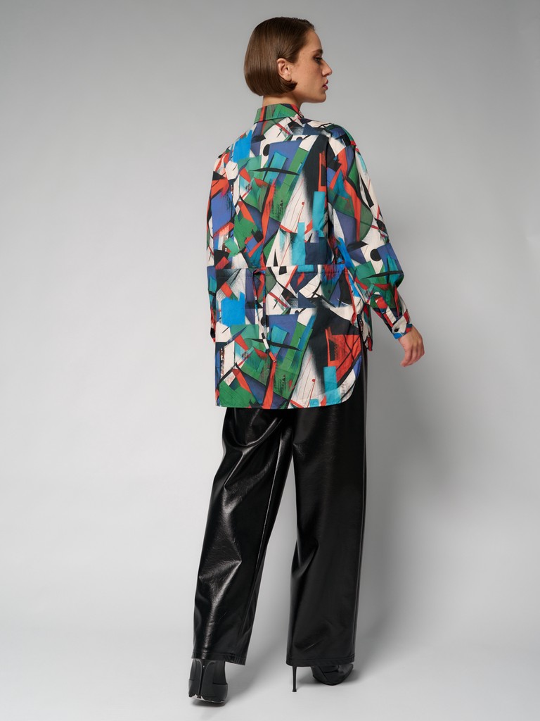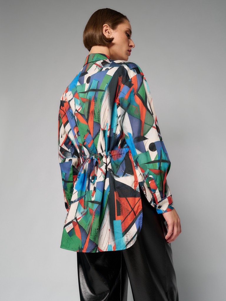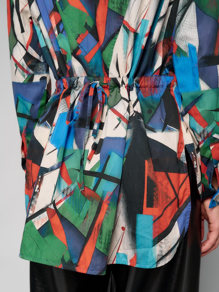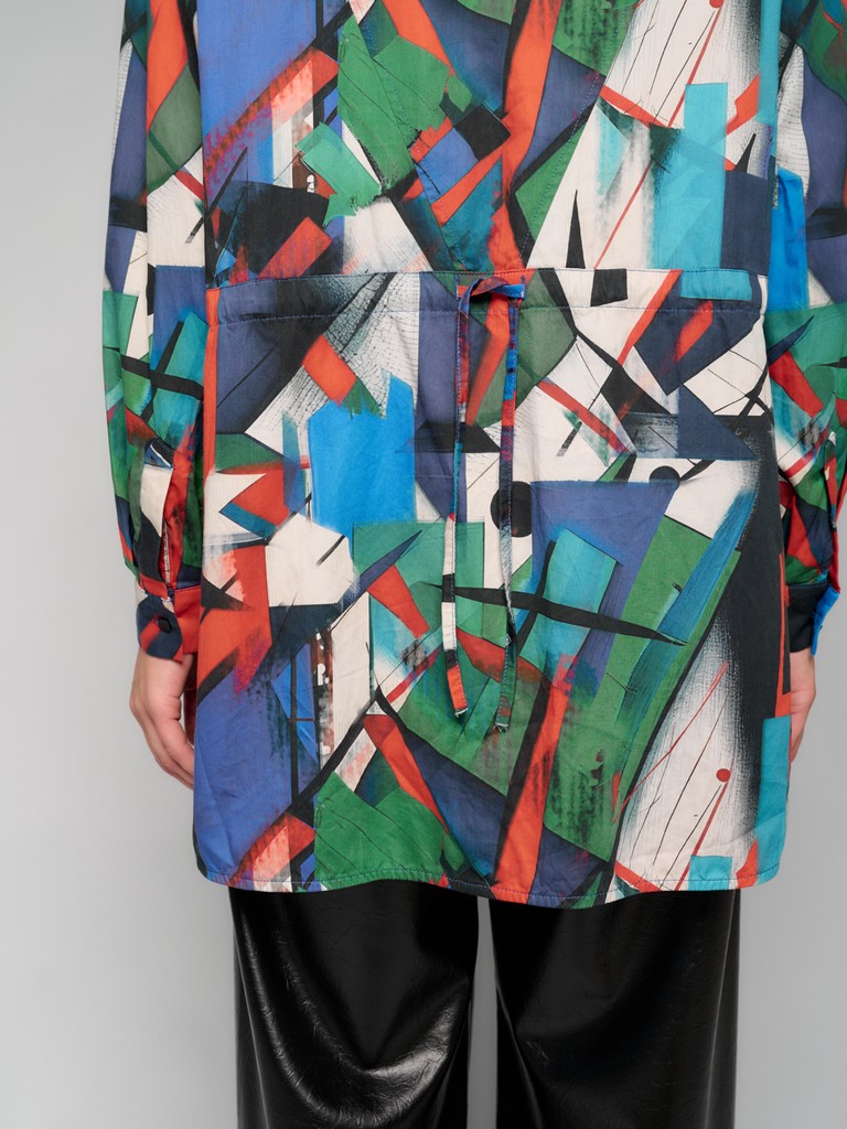 Женская блузка из 100% хлопка на пуговицах из лимитированной коллекции KANDINSKIY с оригинальным принтом от ELEGANZZA. Блузка оверсайз силуэта со вставленным шнурком-завязкой по линии кулиски по переду и спинке, который позволяет регулировать объем блузки, создавая приталенный силуэт и обеспечивая комфортную посадку по любому типу фигуры. Классический воротник и объемный рукав придают изделию строгий, но в то же время женственный вид.