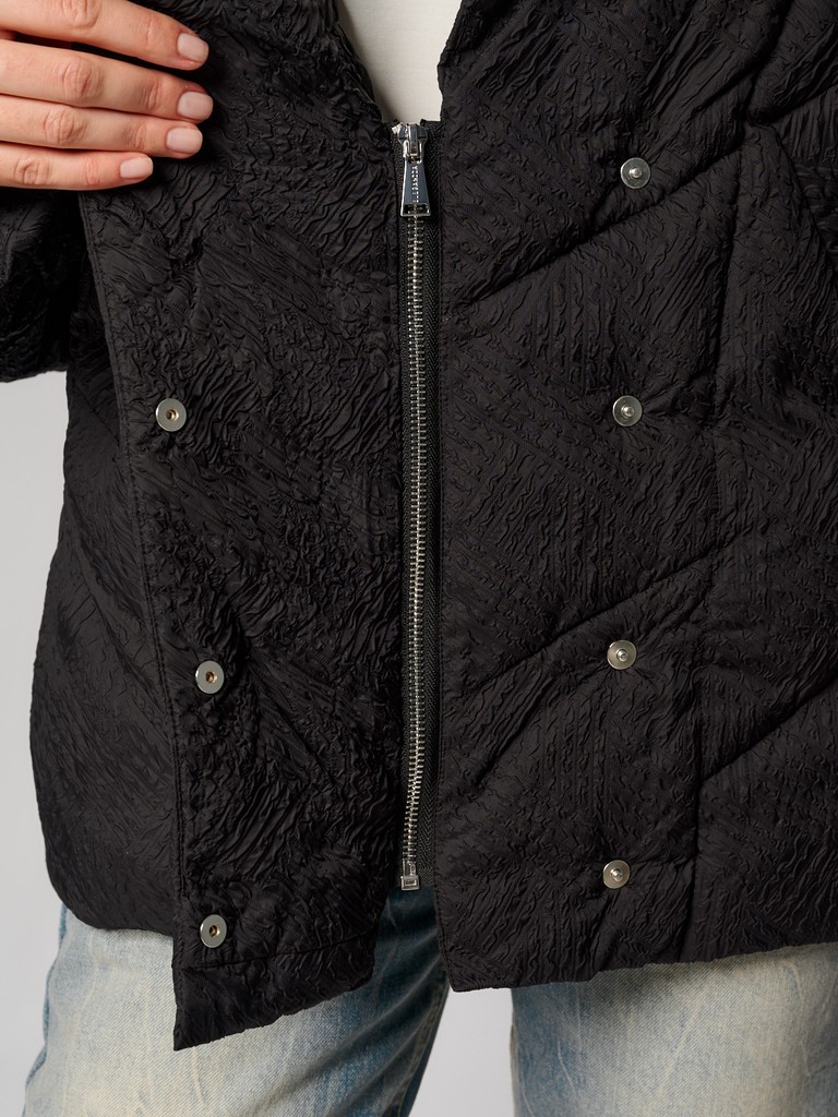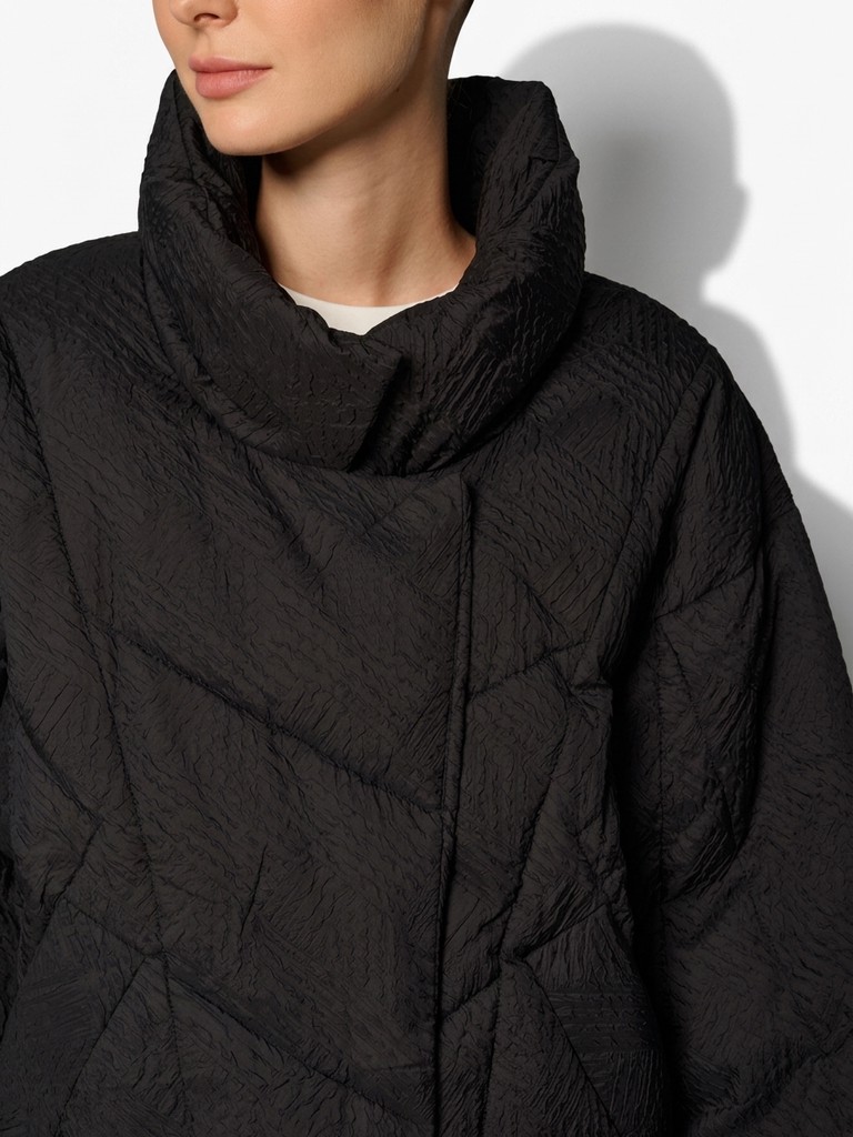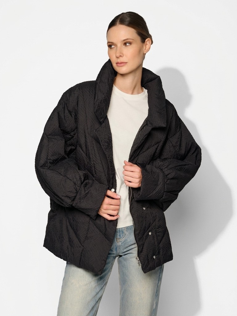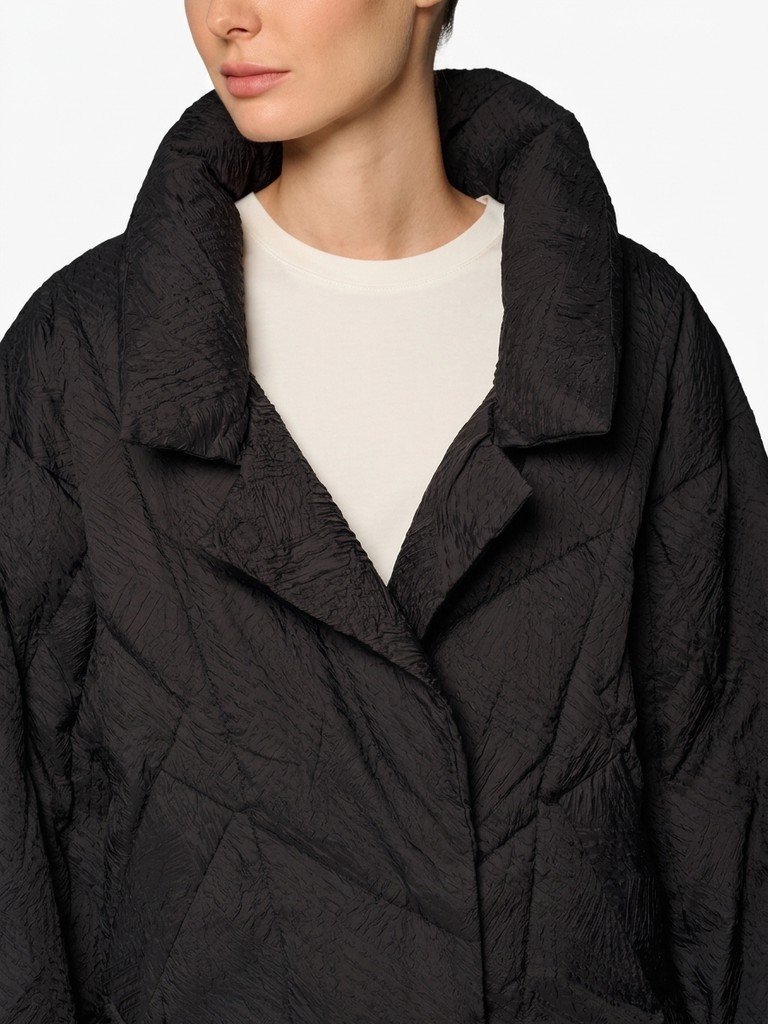 Стеганая черная женская куртка оверсайз с рукавами "летучая мышь". Модель выполнена из сжатой ткани с наполнителем из 100% полиэстера, застегивается на скрытые кнопки. Куртка с широким воротом на магнитах, рукава украшают манжеты из фактурной ткани. Идеально подходит для носки в межсезонье, осенью и весной.