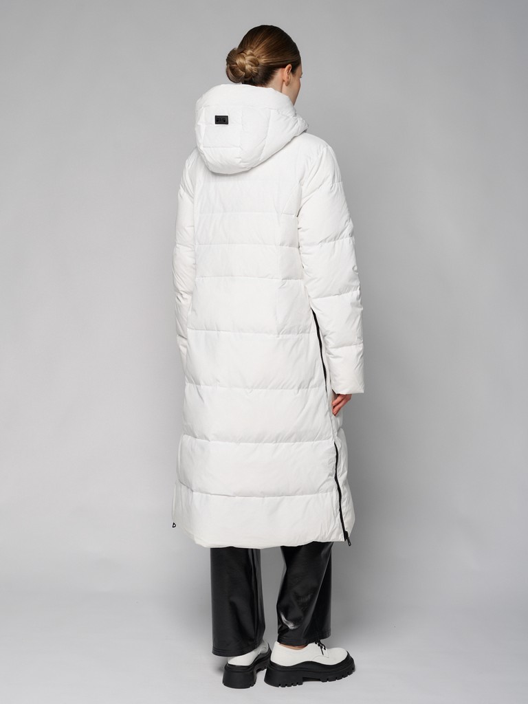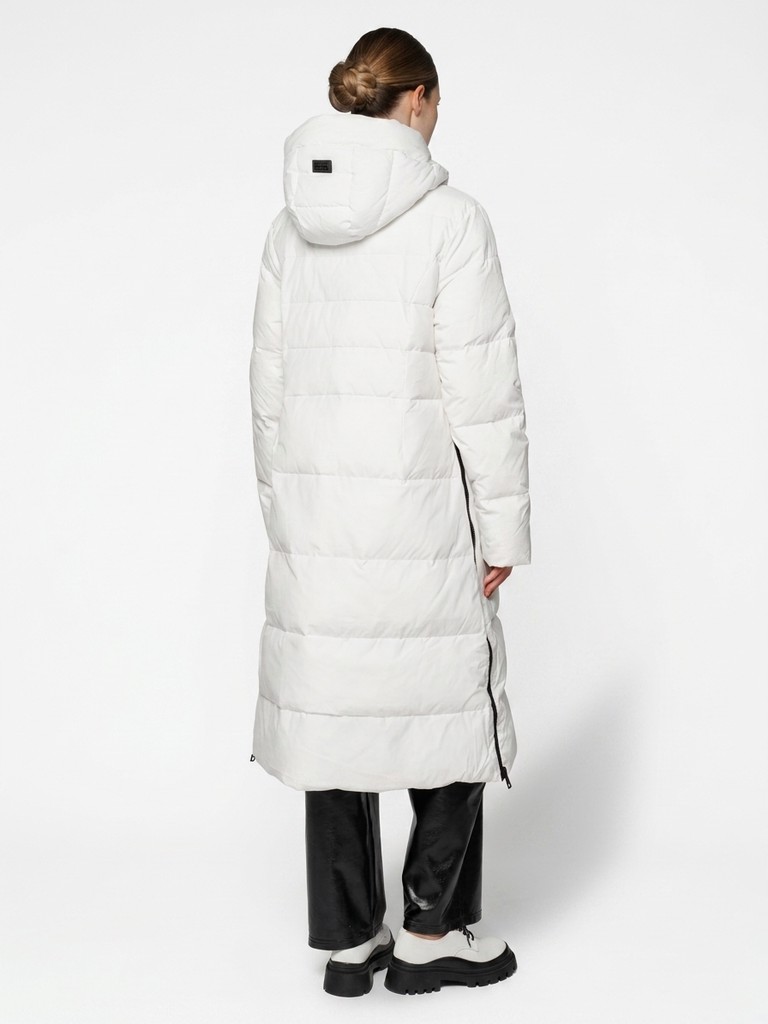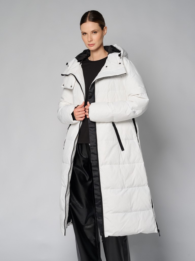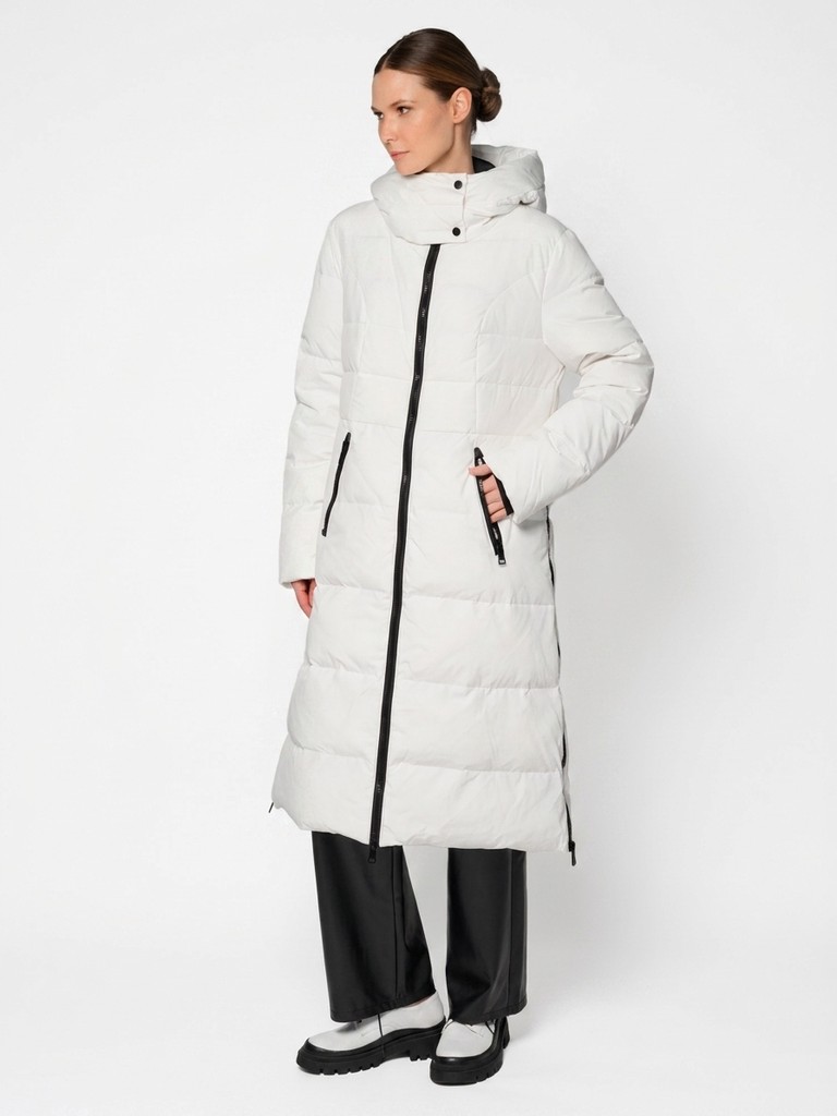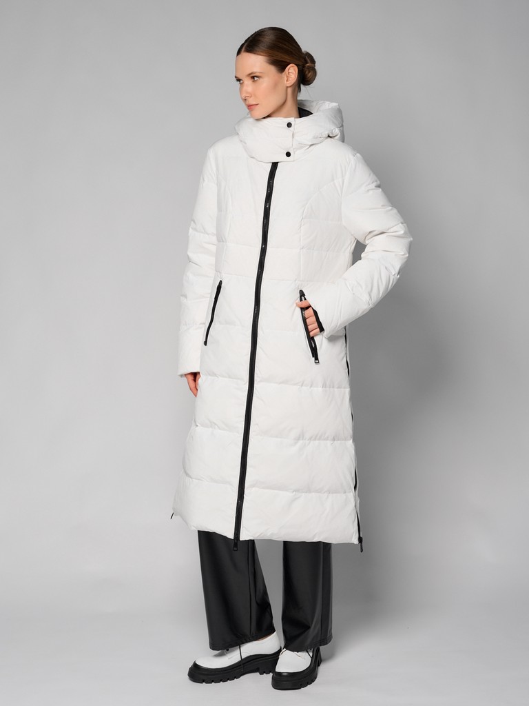 Удлиненное женское стеганое пальто с наполнителем из пуха и пера. Зимнее пальто выполнено из стеганой ткани. Модель с капюшоном и воротником-стойкой на кнопках, двумя прорезными карманами и разрезами на молнии в боковых швах. Данная куртка обеспечит комфортные прогулки в морозную погоду, а так же послужит стильной деталью любого образа.