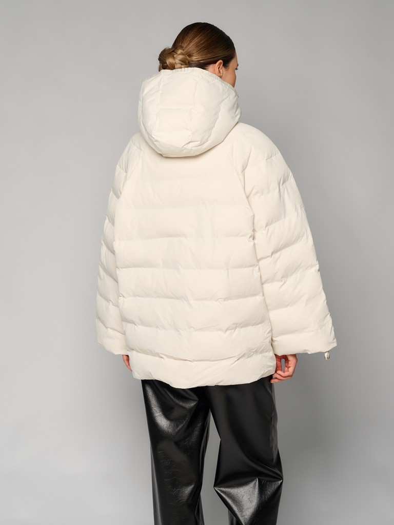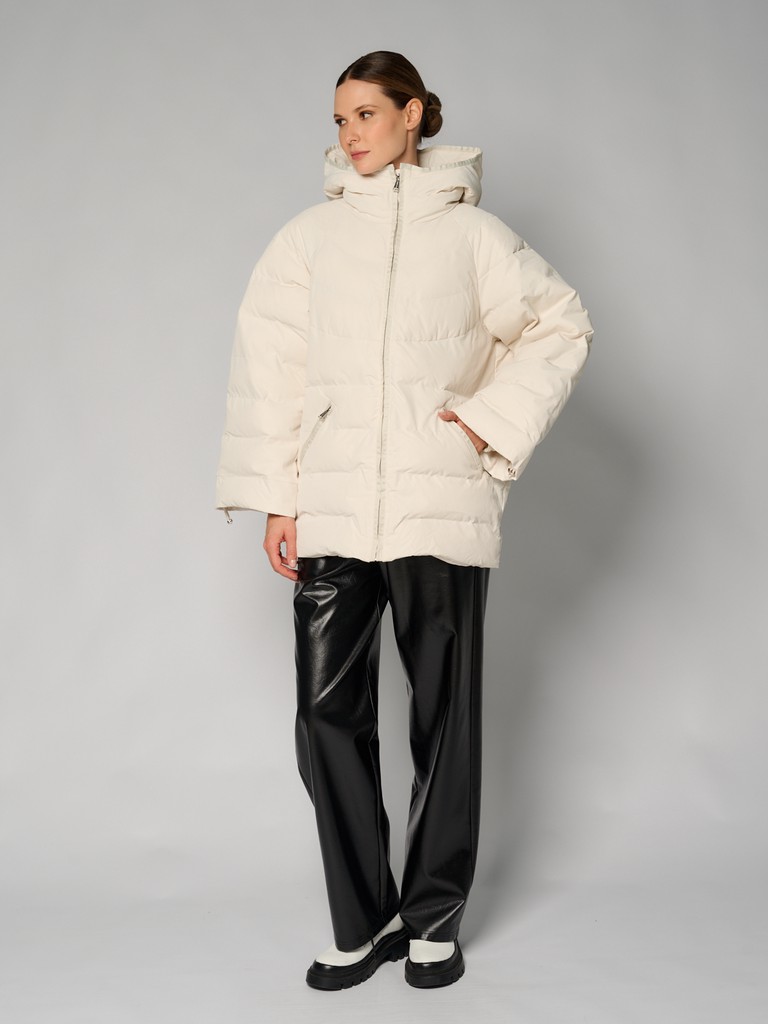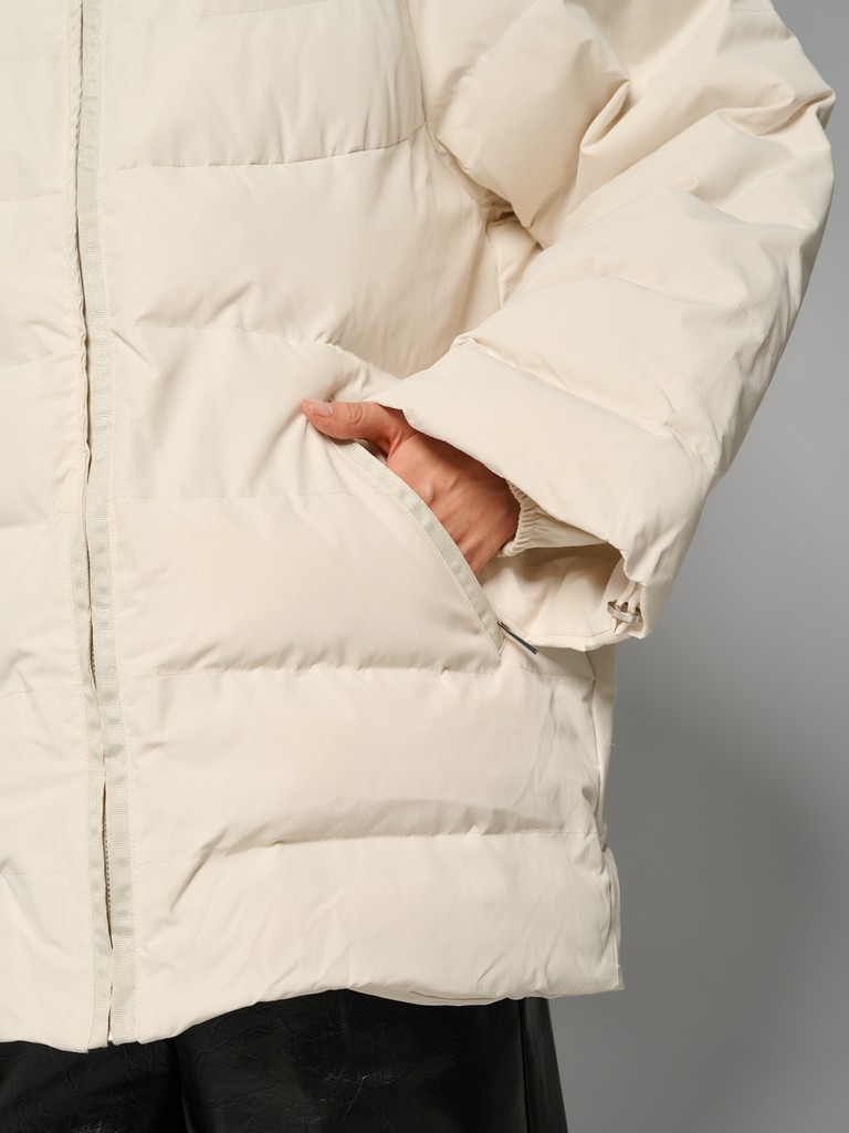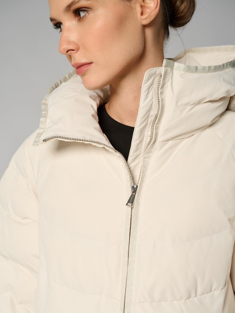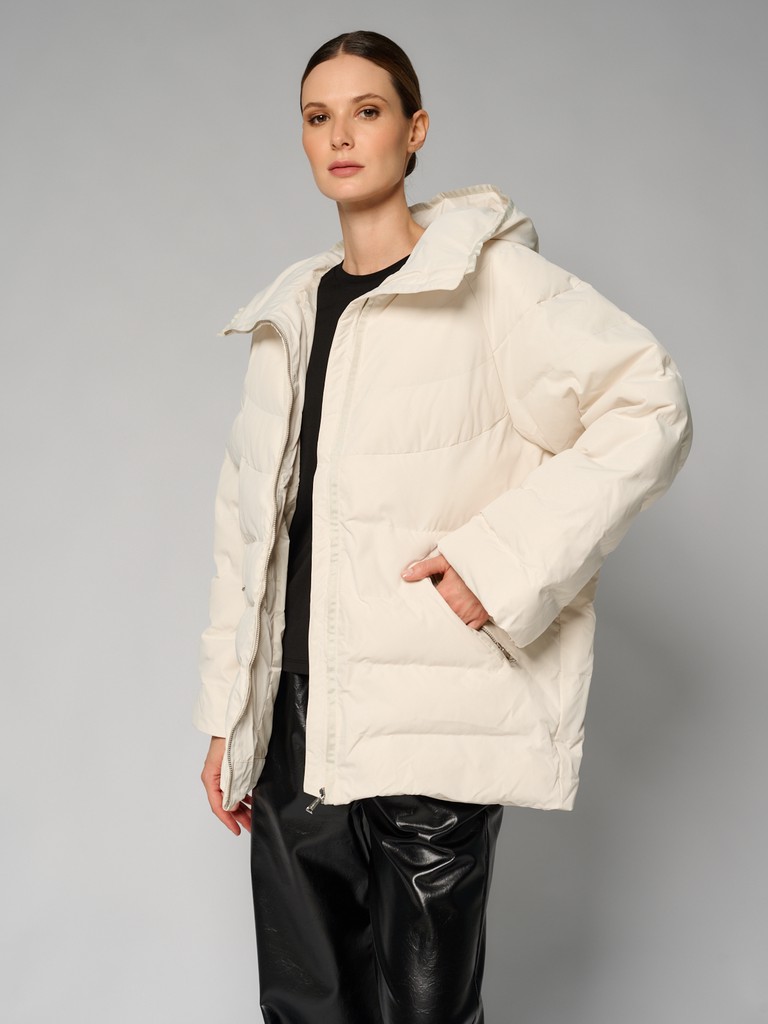 Удлиненная женская куртка белого цвета с красивой матовой поверхностью и застежкой на молнию. Классическая модель стеганой куртки с широким воротом и глубоким капюшоном идеально подойдет для носки зимой и в период холодного межсезонья.