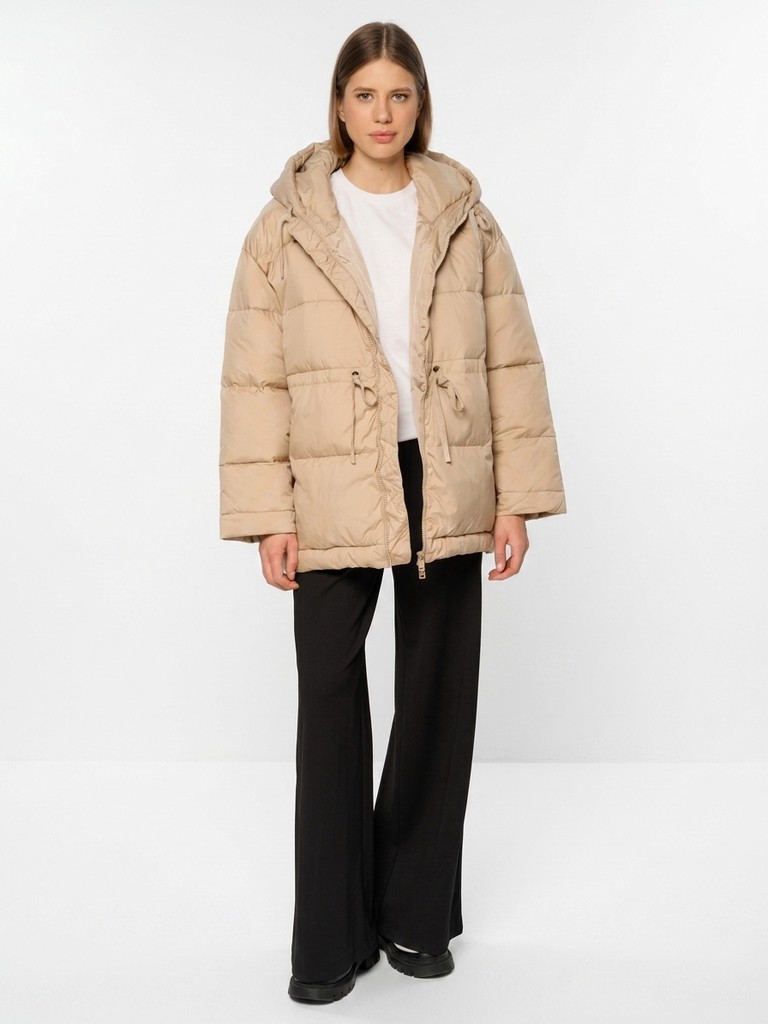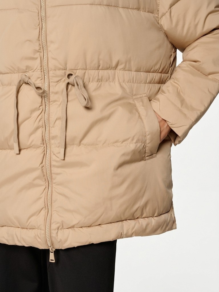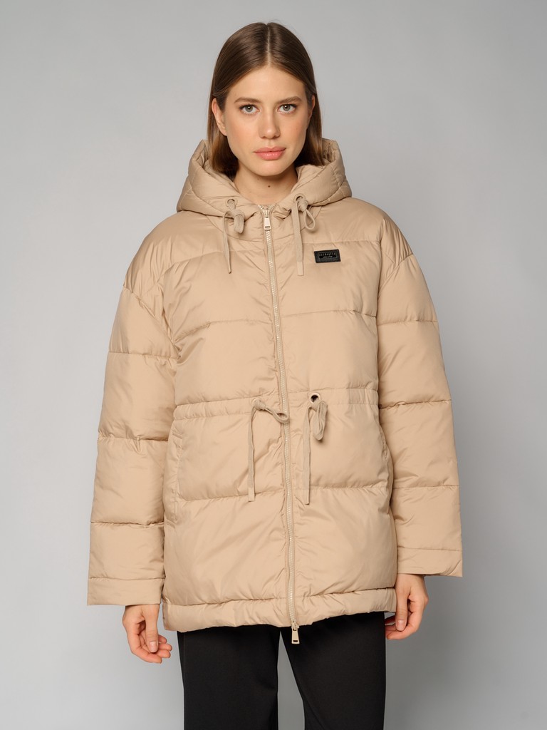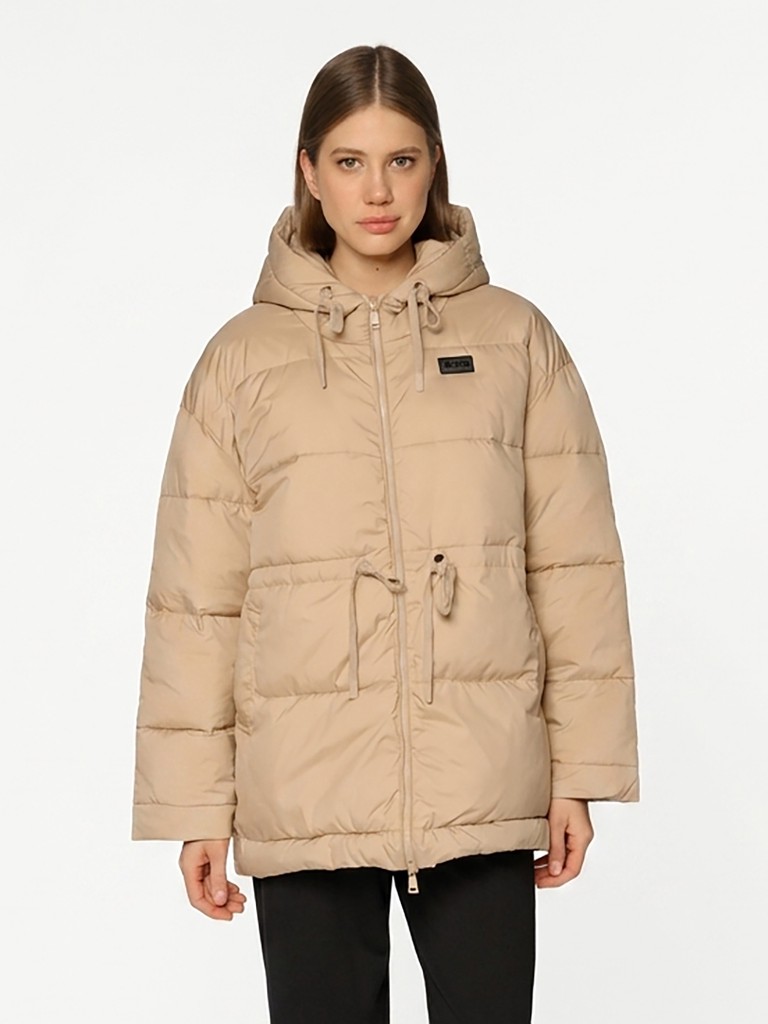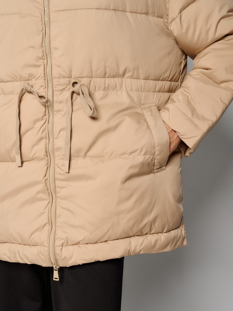 Удлиненная женская куртка бежевого цвета с застежкой на молнию. Модель прямого кроя с трикотажным шнуром по линии талии для комфортной посадки, а также с широким воротом и глубоким капюшоном идеально подойдет для носки зимой и в период холодного межсезонья.