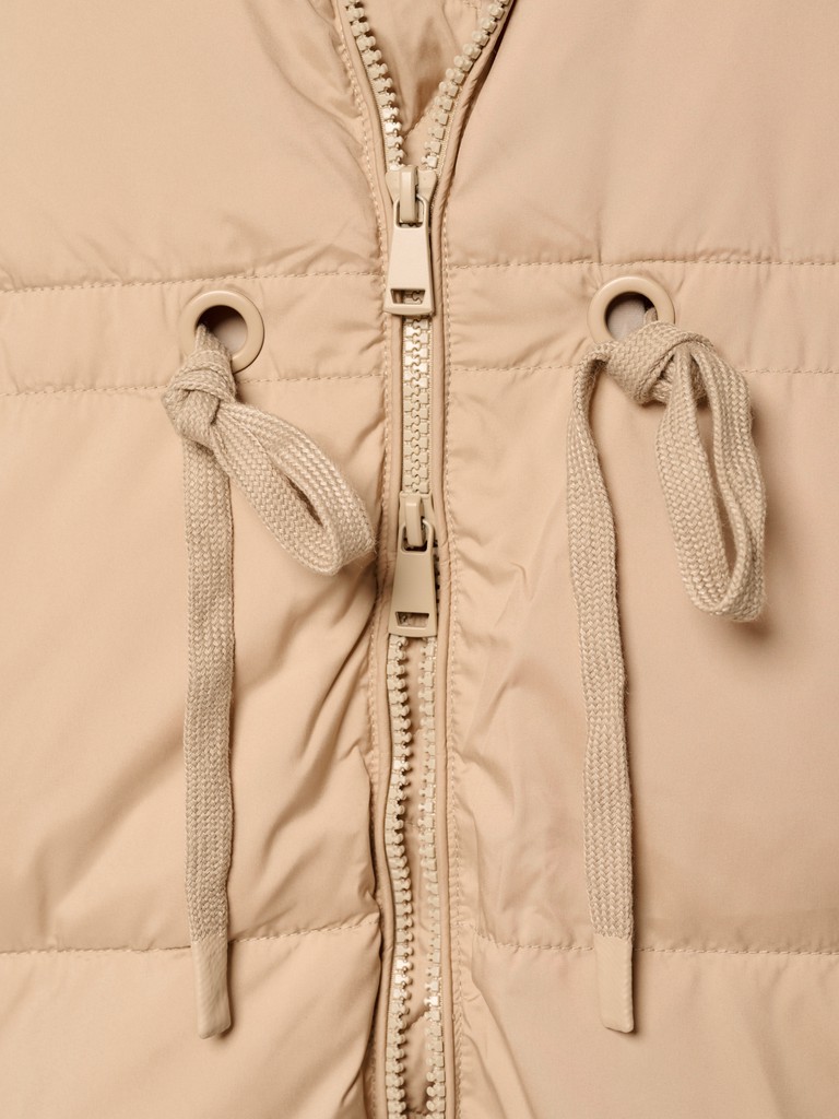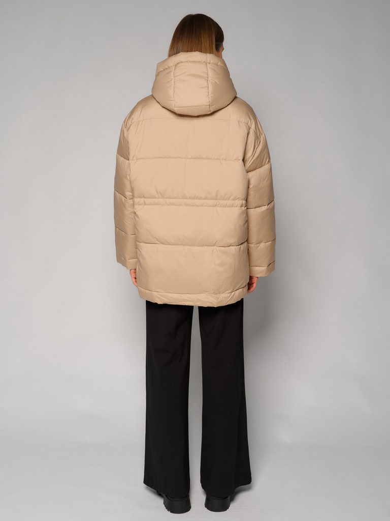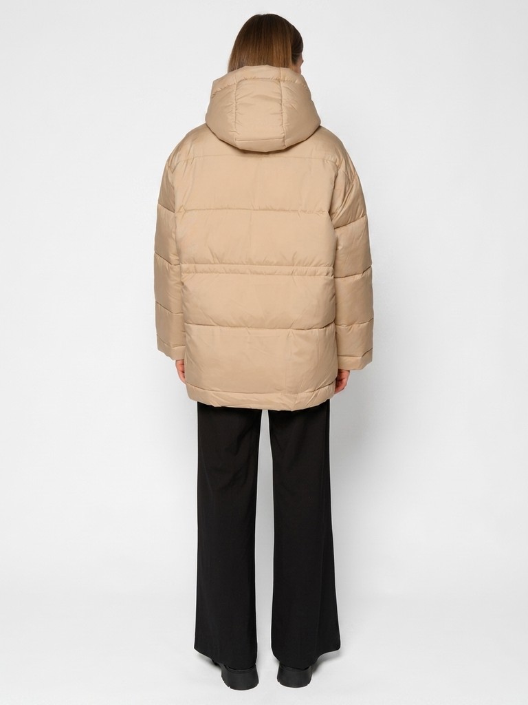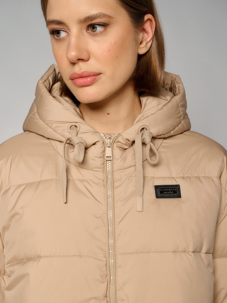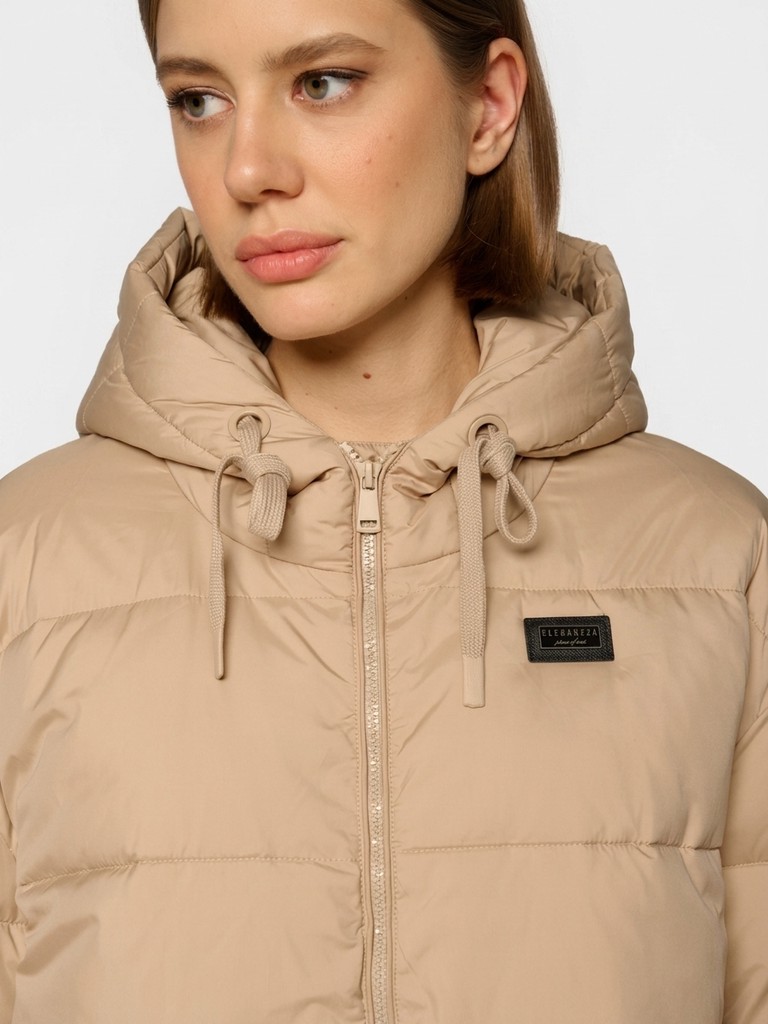 Удлиненная женская куртка бежевого цвета с застежкой на молнию. Модель прямого кроя с трикотажным шнуром по линии талии для комфортной посадки, а также с широким воротом и глубоким капюшоном идеально подойдет для носки зимой и в период холодного межсезонья.