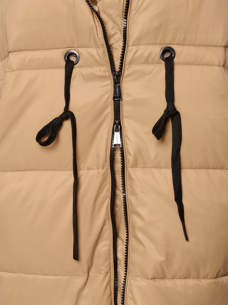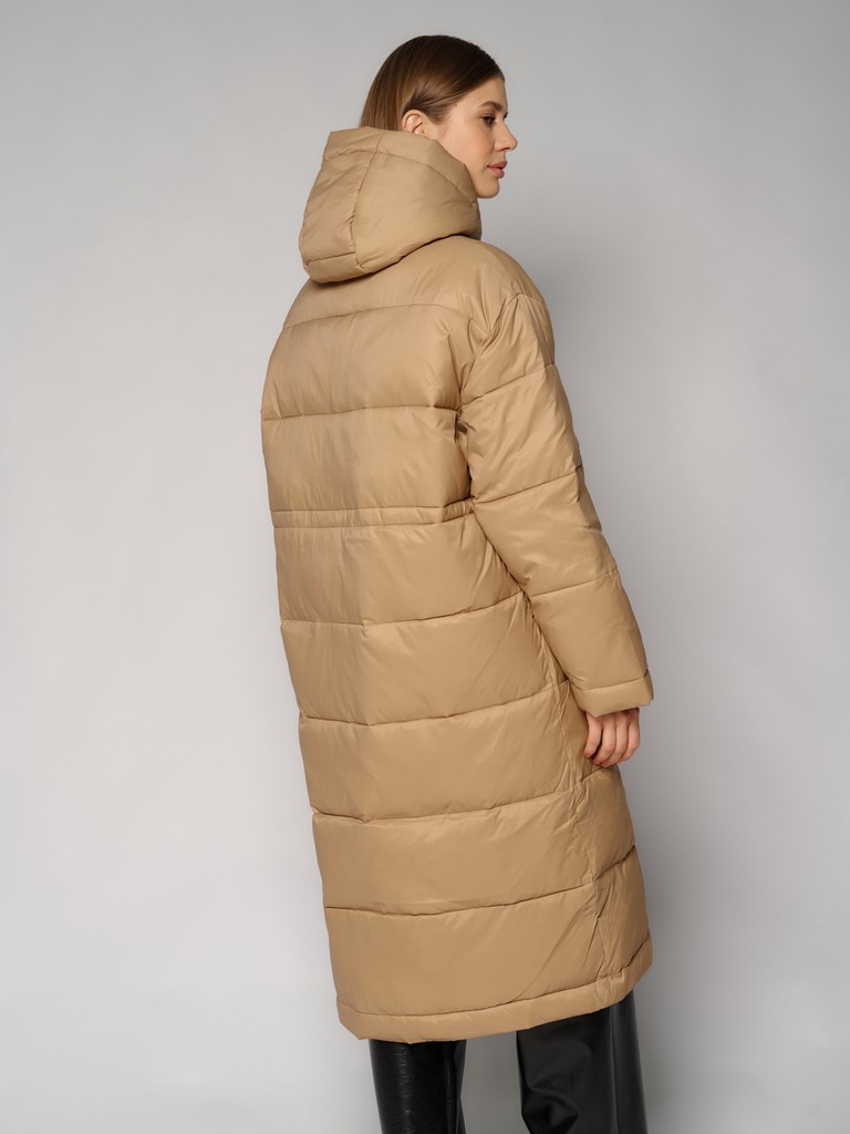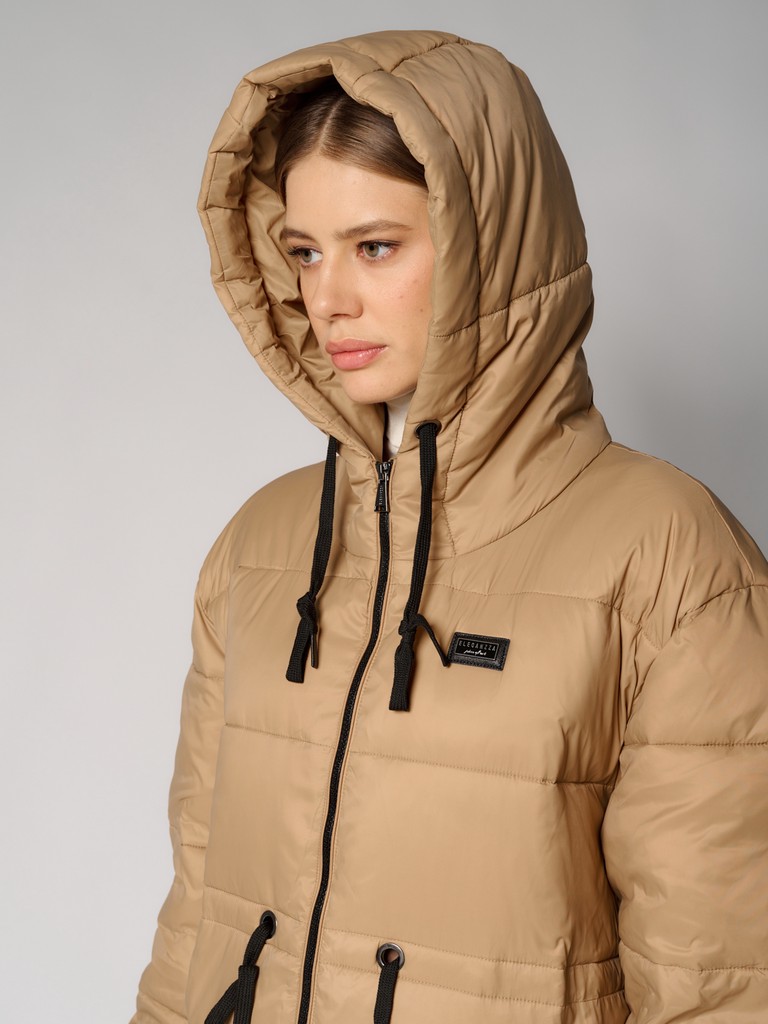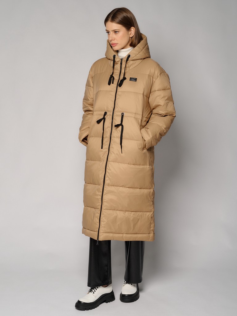 Стеганое удлиненное теплое зимнее пальто. Модель с вортником-стойкой, регулируемыми завязками на капюшоне и по линии талии, позволяющими выделить талию или создать более свободный образ. Данная куртка обеспечит комфортные прогулки в морозную погоду, а также послужит стильной деталью любого образа.