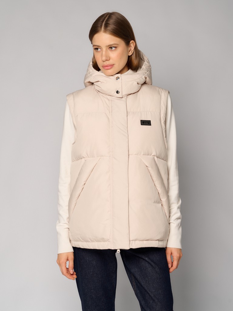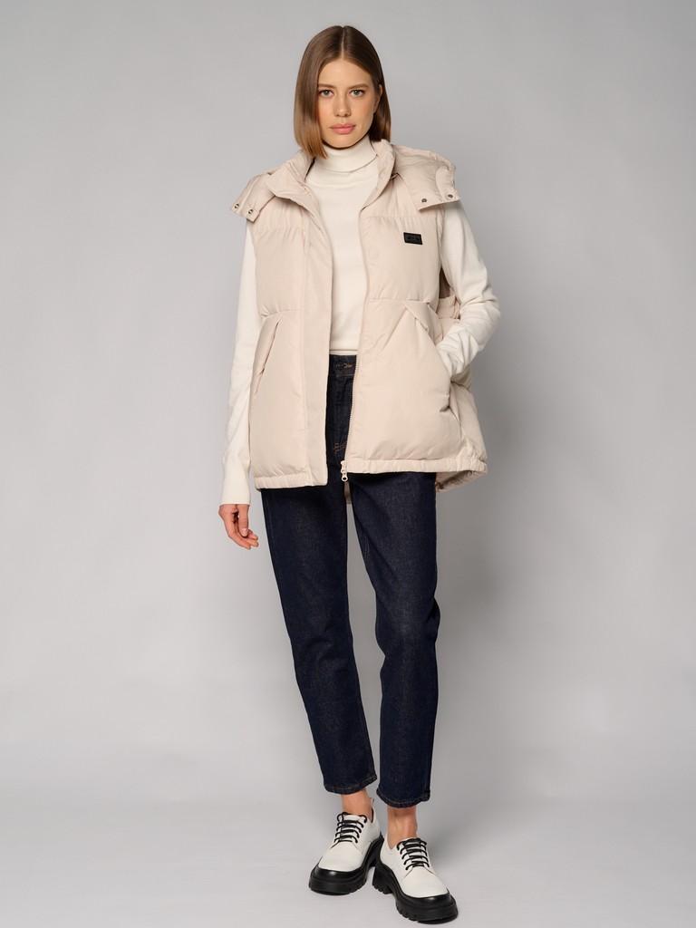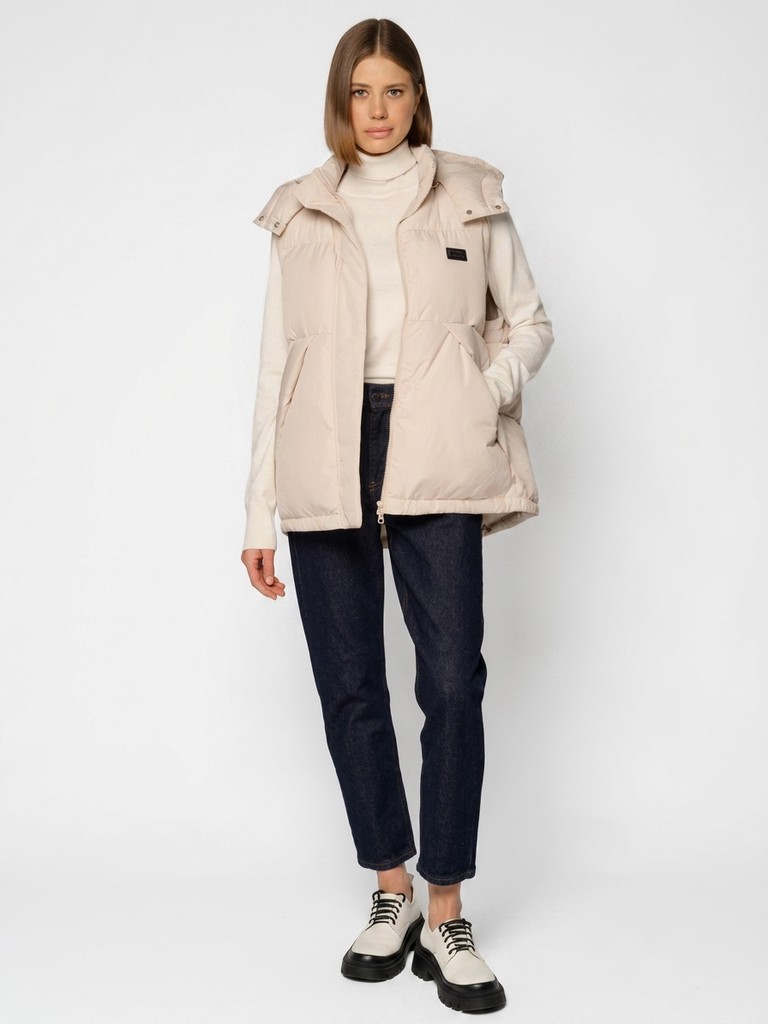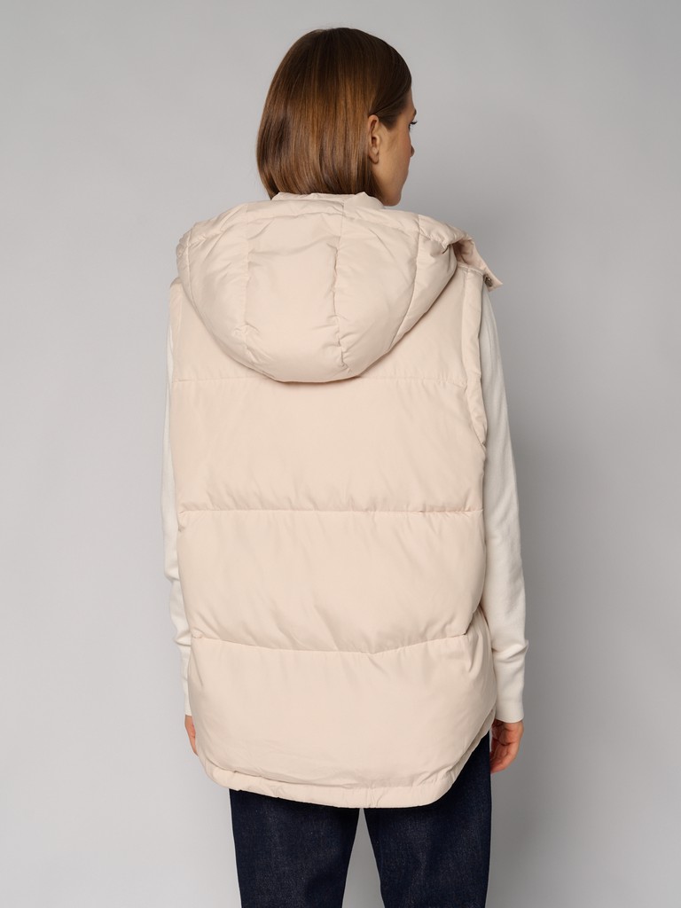 Легкий и теплый стеганый женский жилет бежевого цвета с воротником-стойкой и капюшоном. Осенний жилет сделан из высококачественных материалов: болоньевая ткань и утеплитель.Благодаря длине и оверсайз фасону, жилет становится идеальным вариантом на осень.