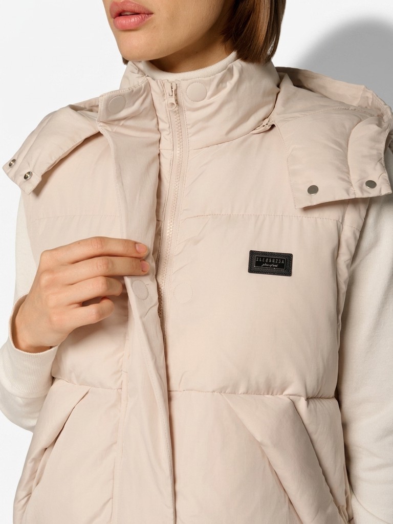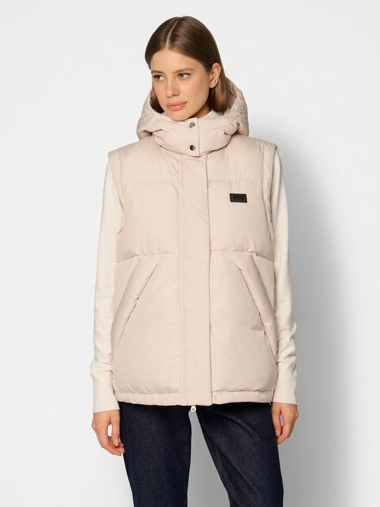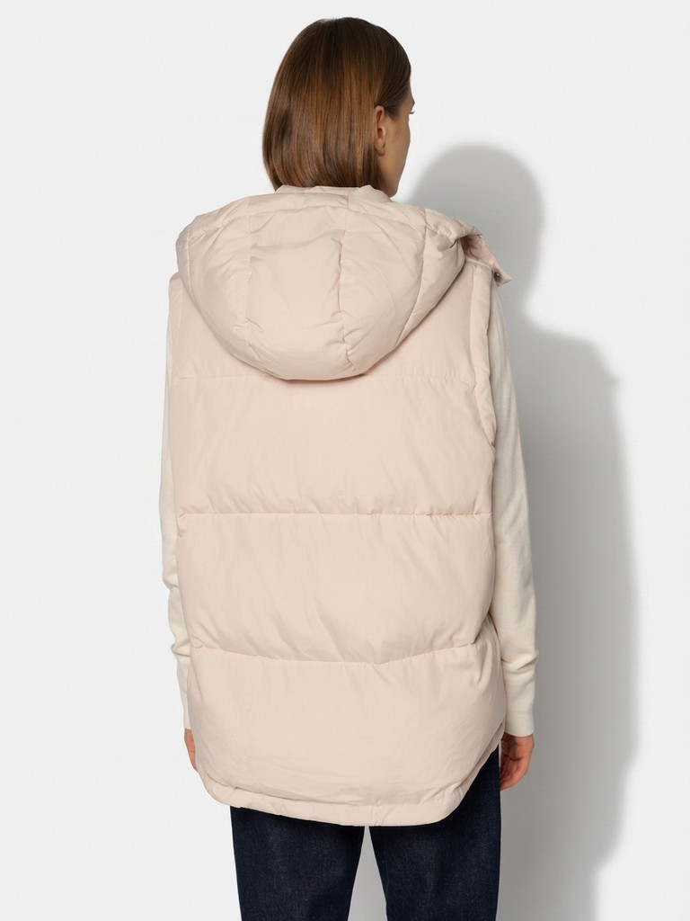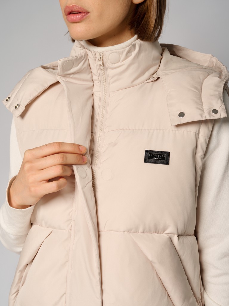 Легкий и теплый стеганый женский жилет бежевого цвета с воротником-стойкой и капюшоном. Осенний жилет сделан из высококачественных материалов: болоньевая ткань и утеплитель.Благодаря длине и оверсайз фасону, жилет становится идеальным вариантом на осень.