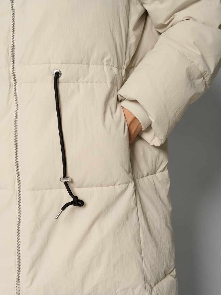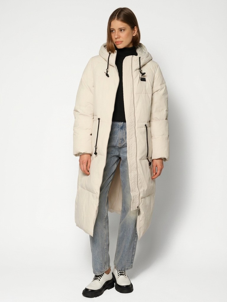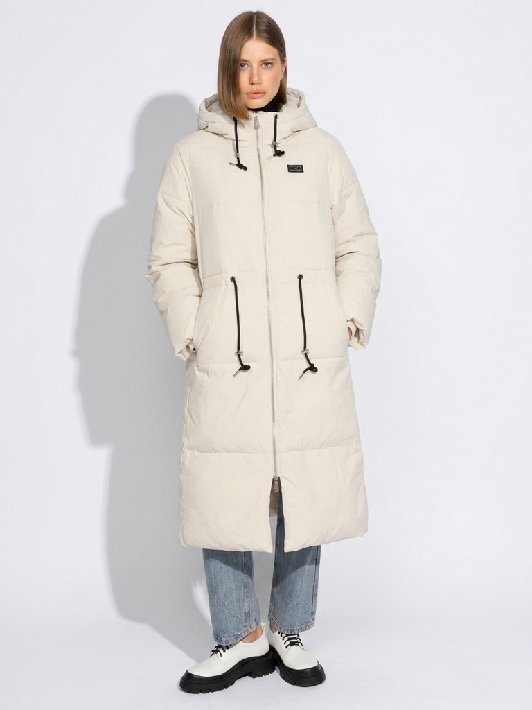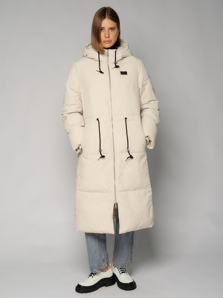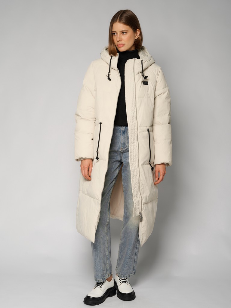 Длинное женское пальто прямого силуэта ниже колена.Модель с высоким воротником, глубоким капюшоном на трикотажных затяжках. Пальто застегивается на молнию. По линии талии утяжки. Удлиненная модель выглядит как оверсайз, по бокам два функциональных кармана с застежкой на кнопки.