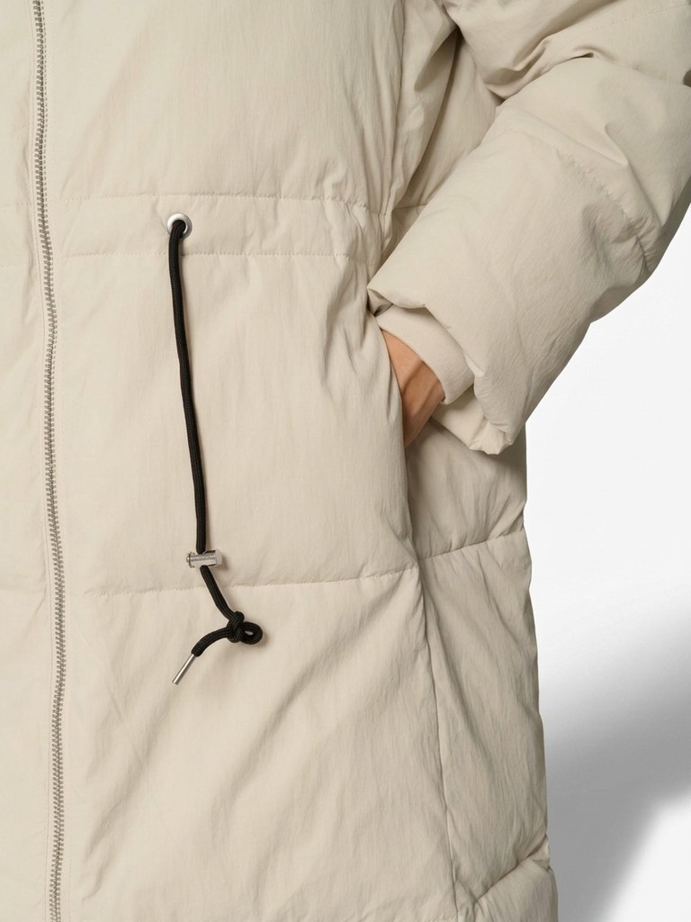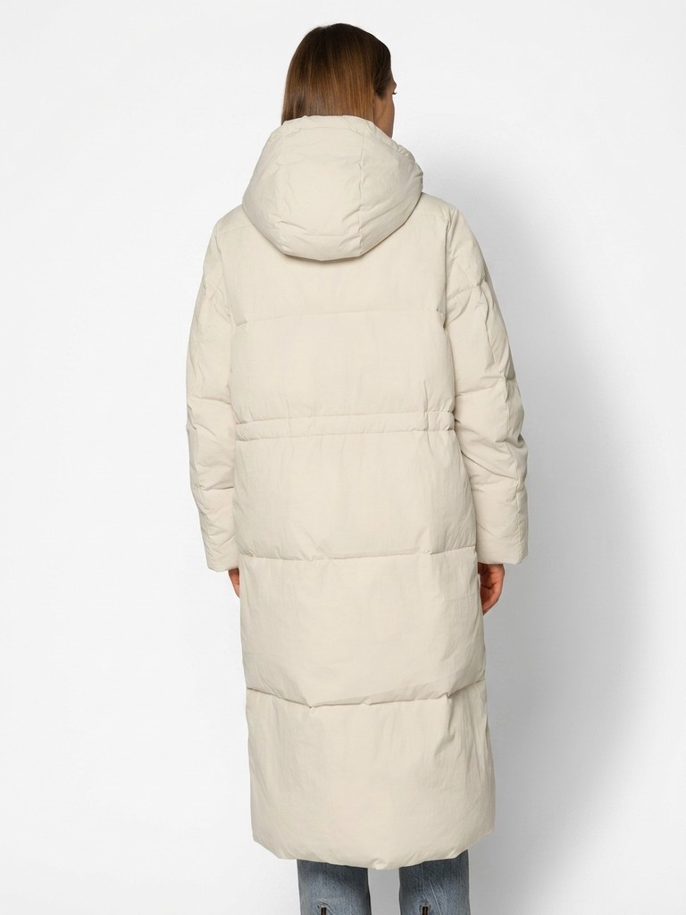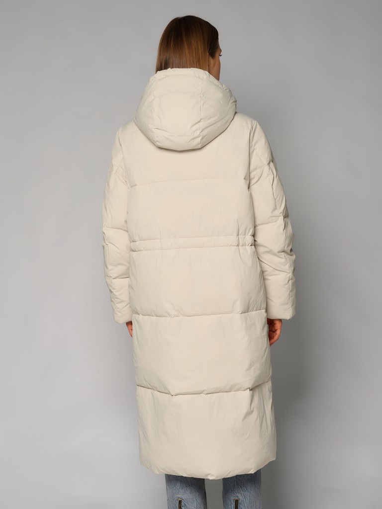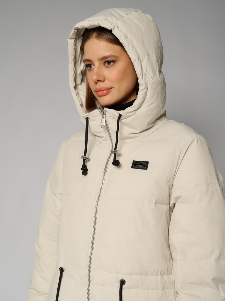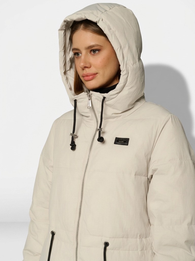 Длинное женское пальто прямого силуэта ниже колена.Модель с высоким воротником, глубоким капюшоном на трикотажных затяжках. Пальто застегивается на молнию. По линии талии утяжки. Удлиненная модель выглядит как оверсайз, по бокам два функциональных кармана с застежкой на кнопки.