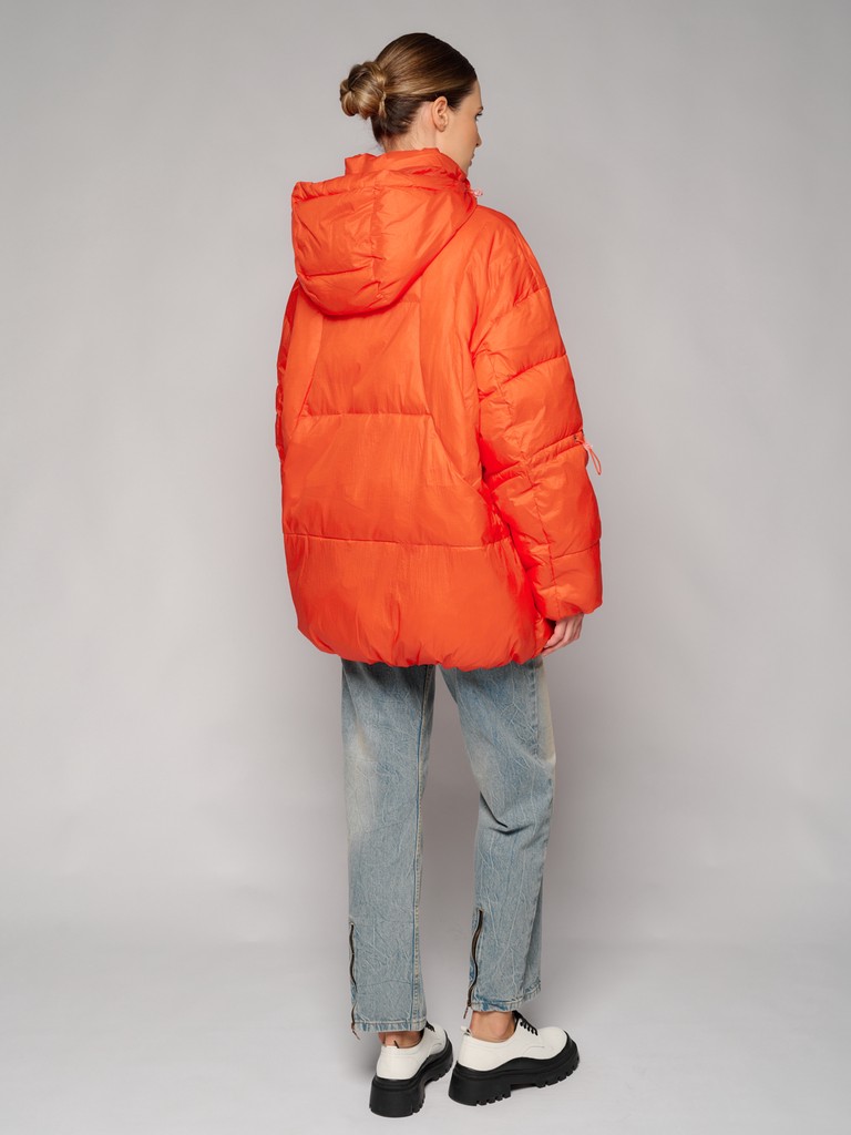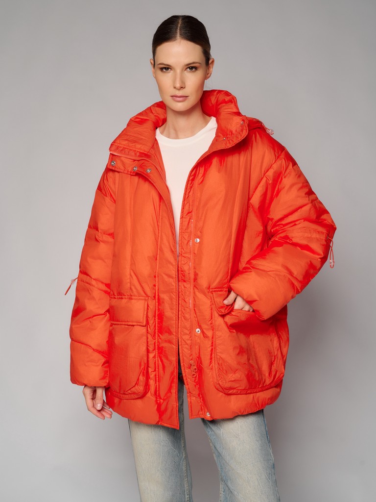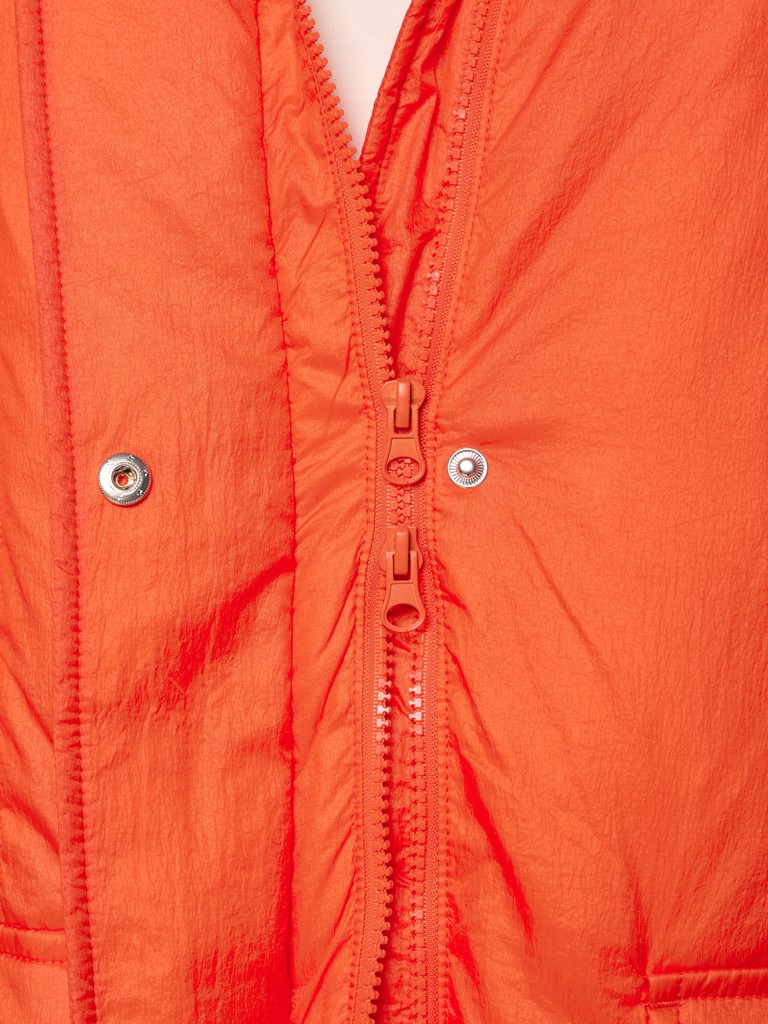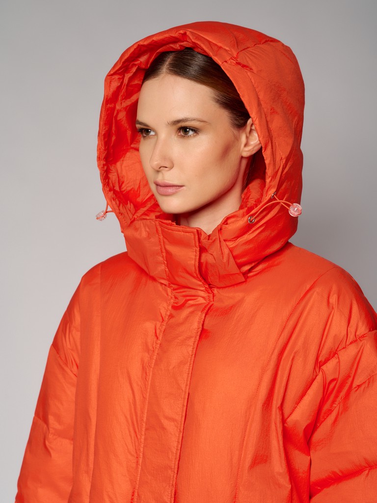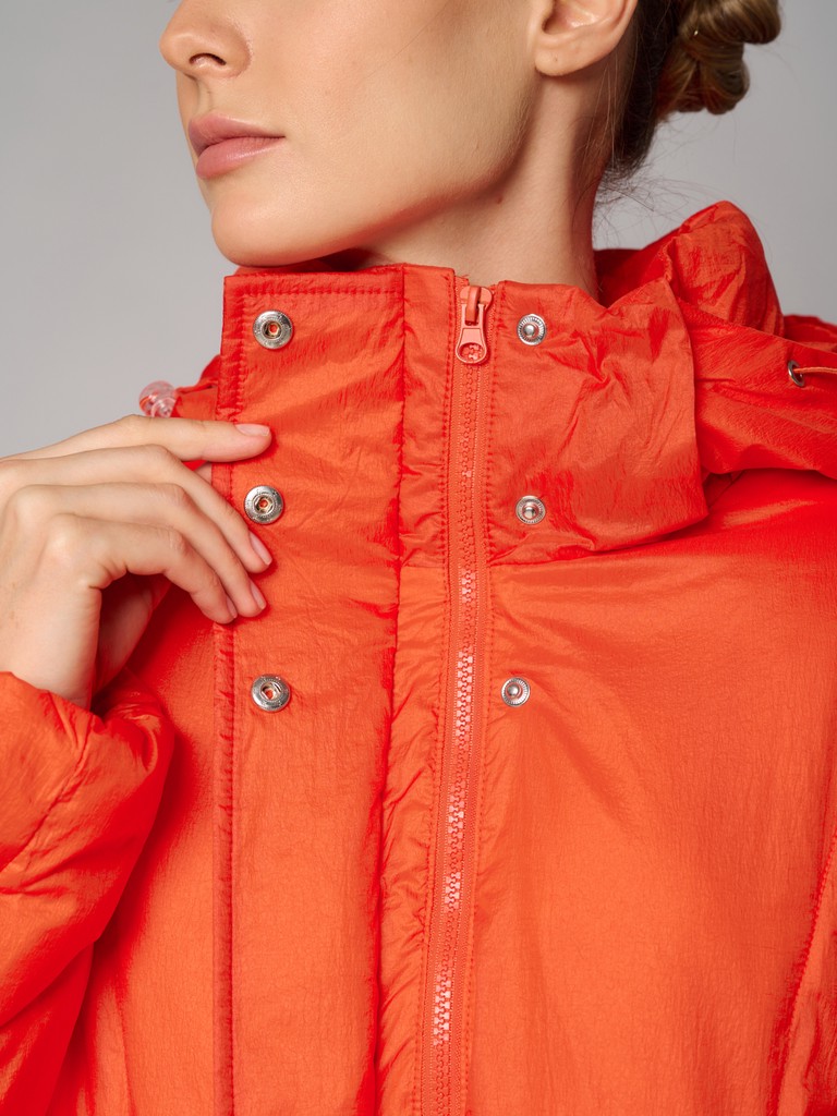 Женская куртка прямого кроя оранжевого цвета. Модель выполнена из глянцевой ткани с наполнителем из 100% полиэстера, застегивается на скрытые кнопки. Куртка с широким воротом на скрытых кнопках и капюшоном с утяжками. Идеально подходит для носки в межсезонье, осенью и весной.