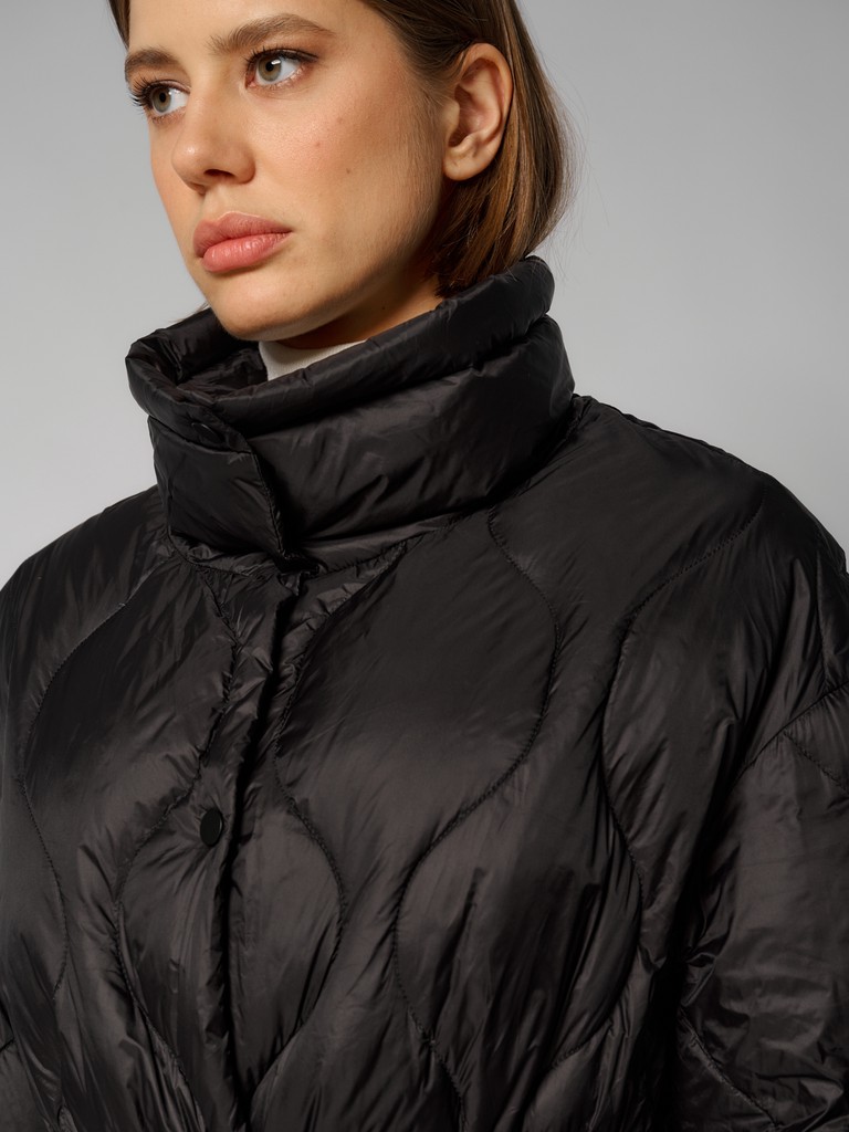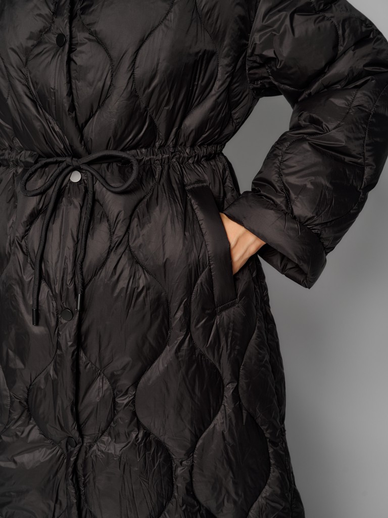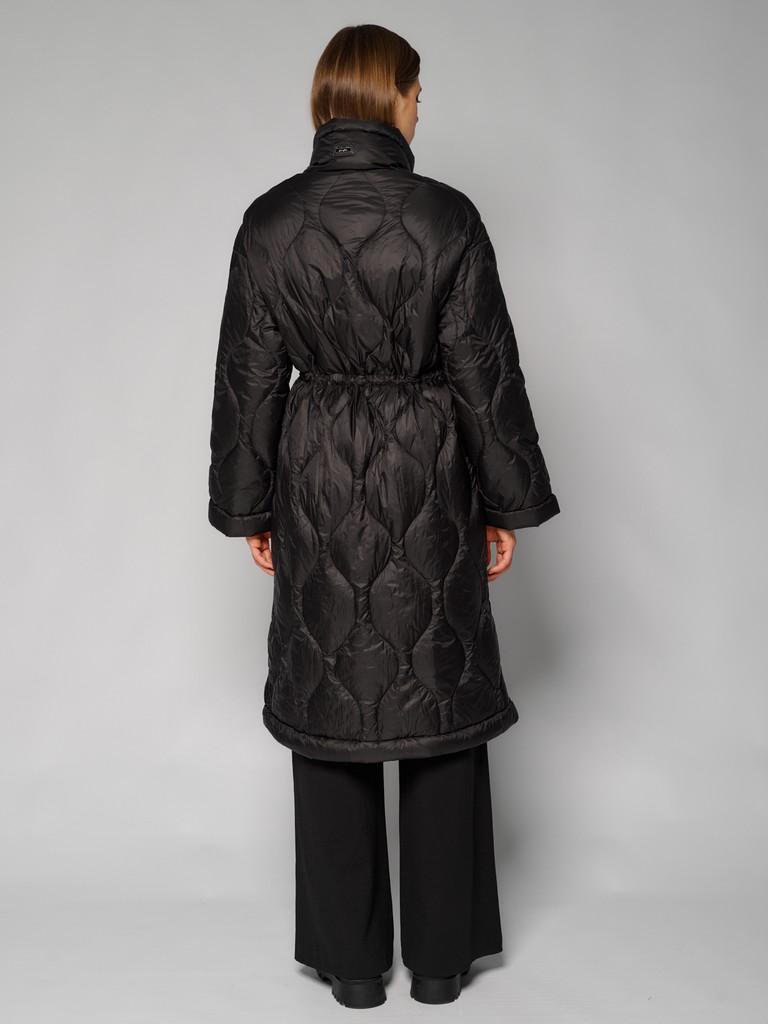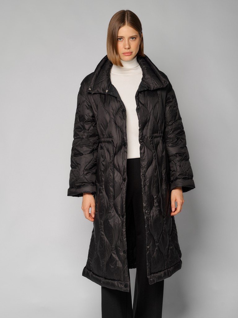 Женское стеганое пальто черного цвета. Модель с воротником-стойкой на скрытых кнопках и с утяжками по линии талии для комфортной посадки. Стильная куртка идеальна для межсезонья. Дополните образ сумкой от ELEGANZZA.