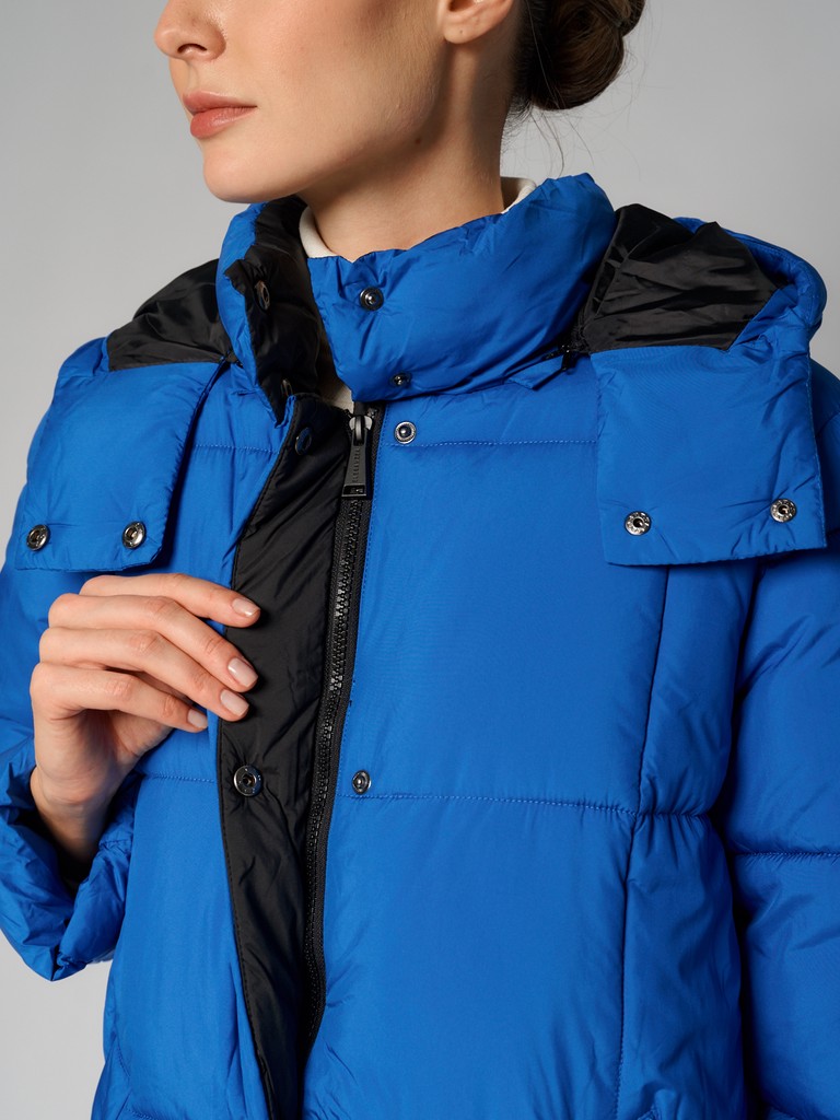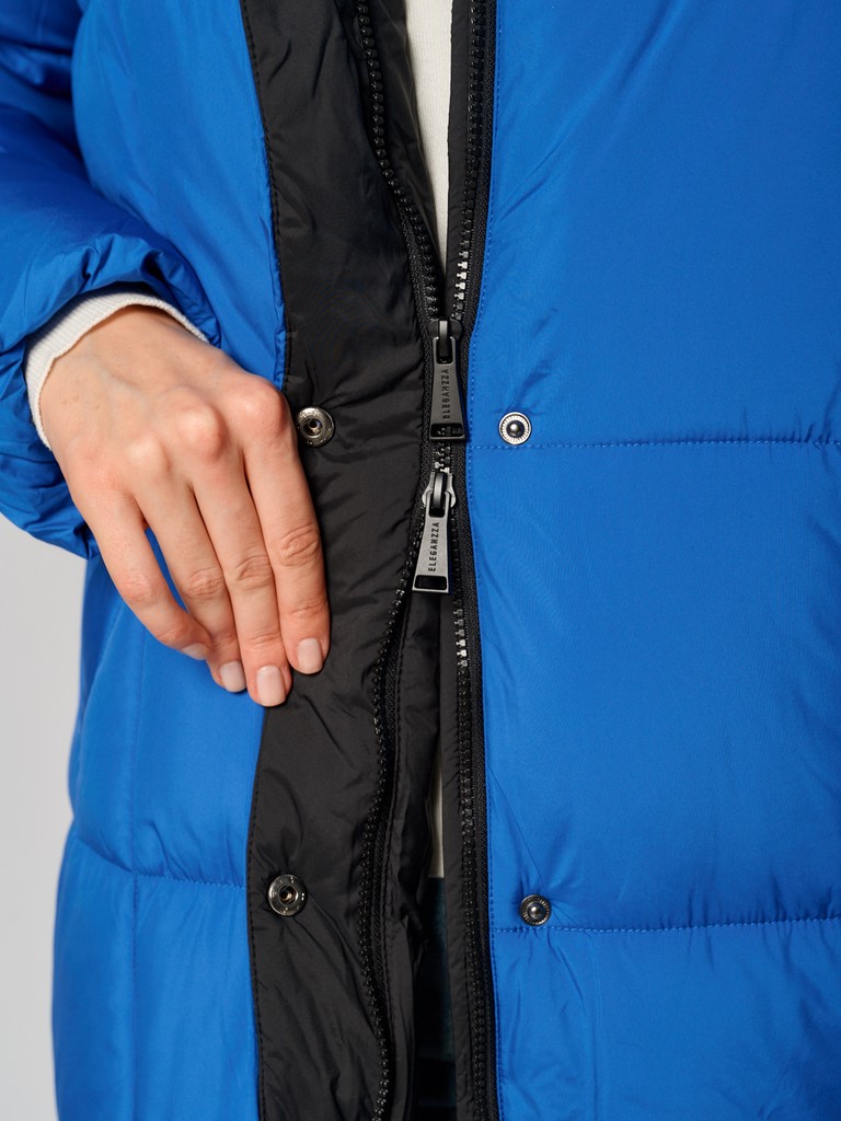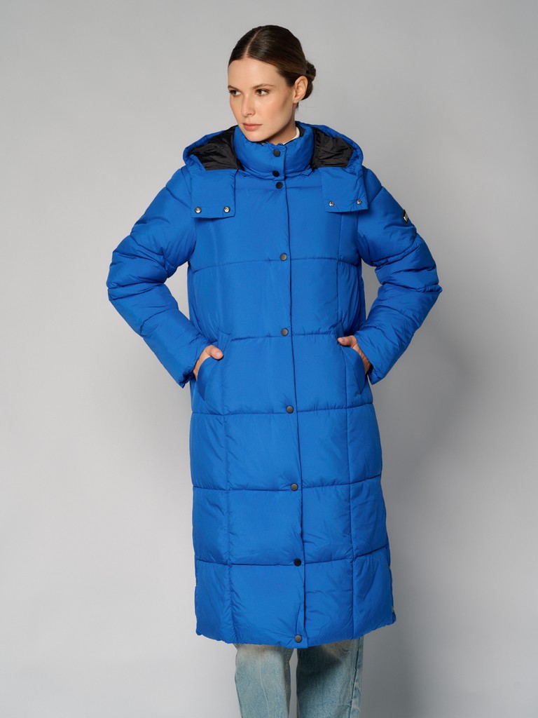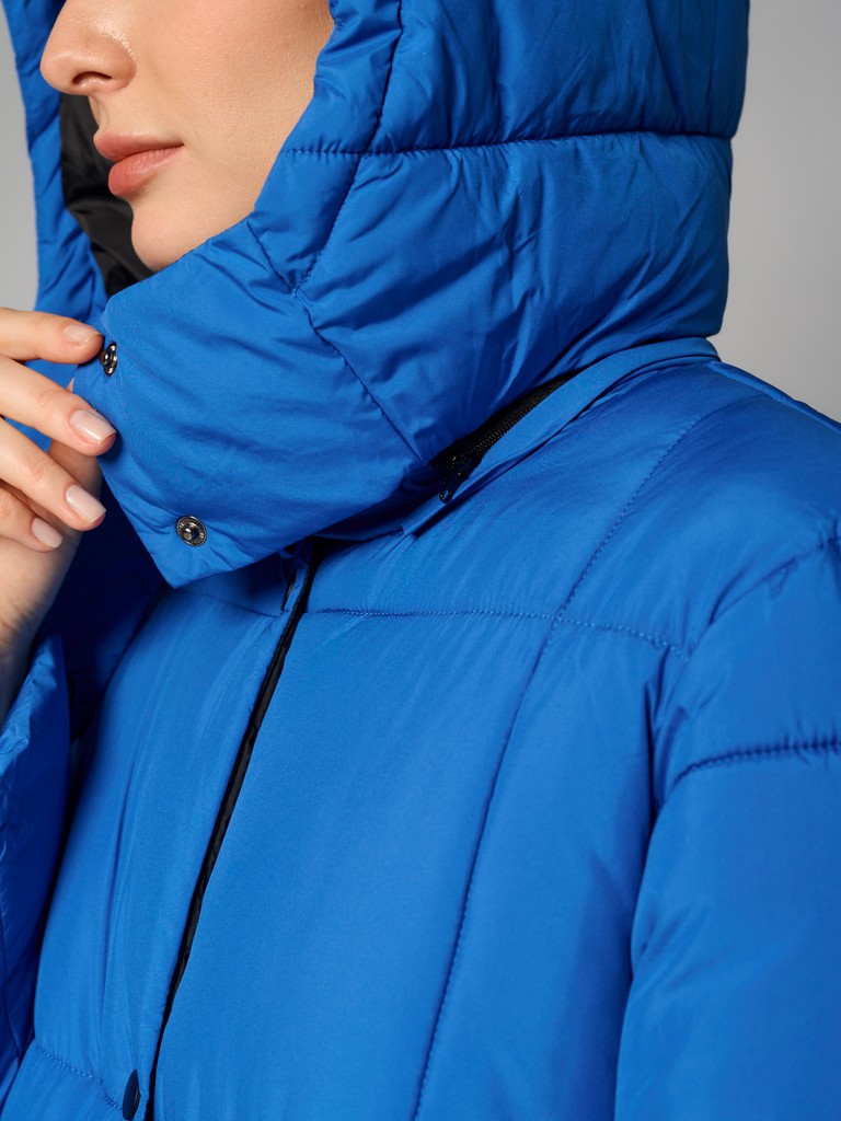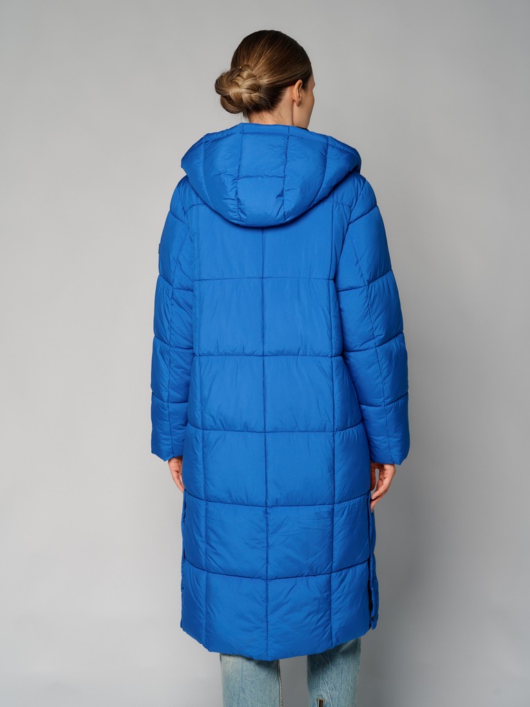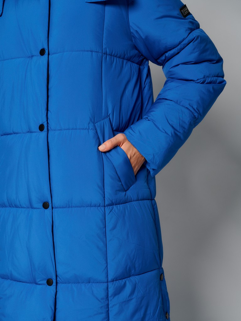 Женское стеганое пальто синего цвета. Модель с воротником-стойкой на кнопках и глубоким капюшоном на кнопках, кнопками по центру изделия, с врезными карманами. Стильная теплая модель для зимы и холодного межсезонья.