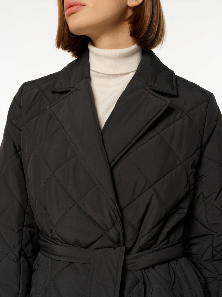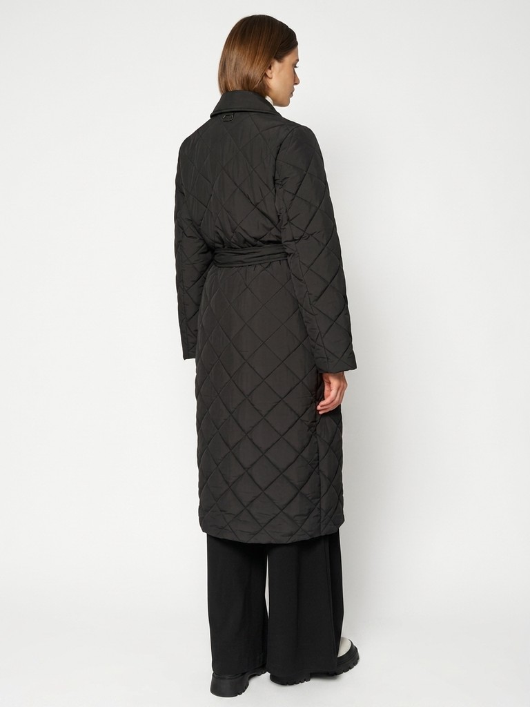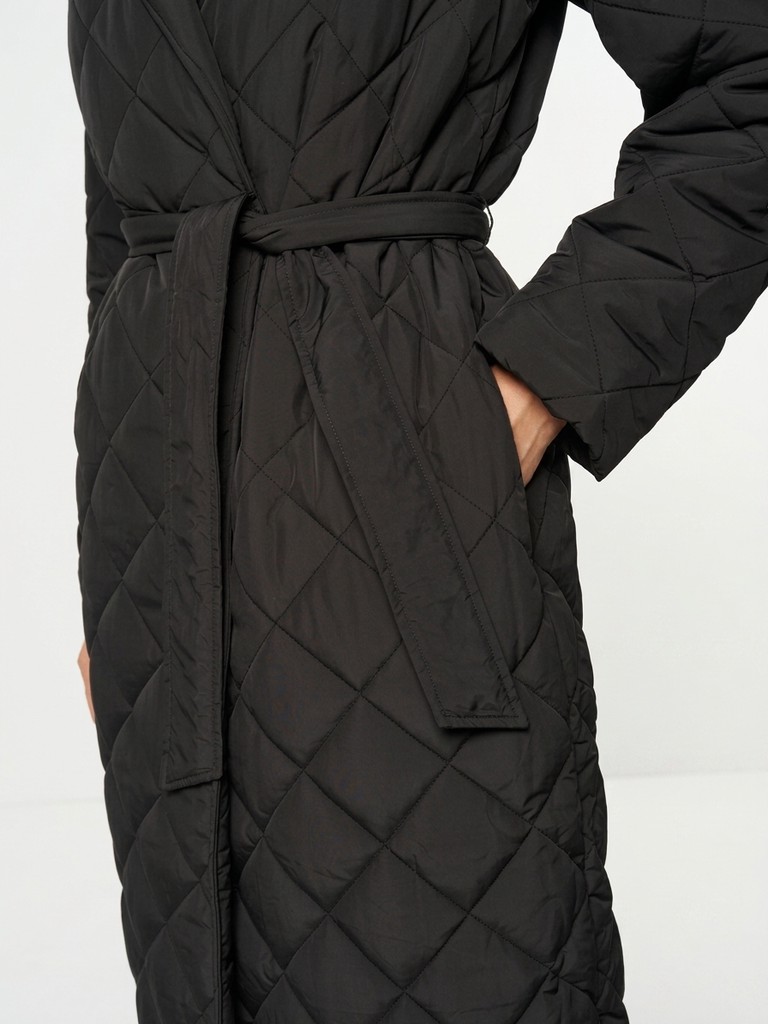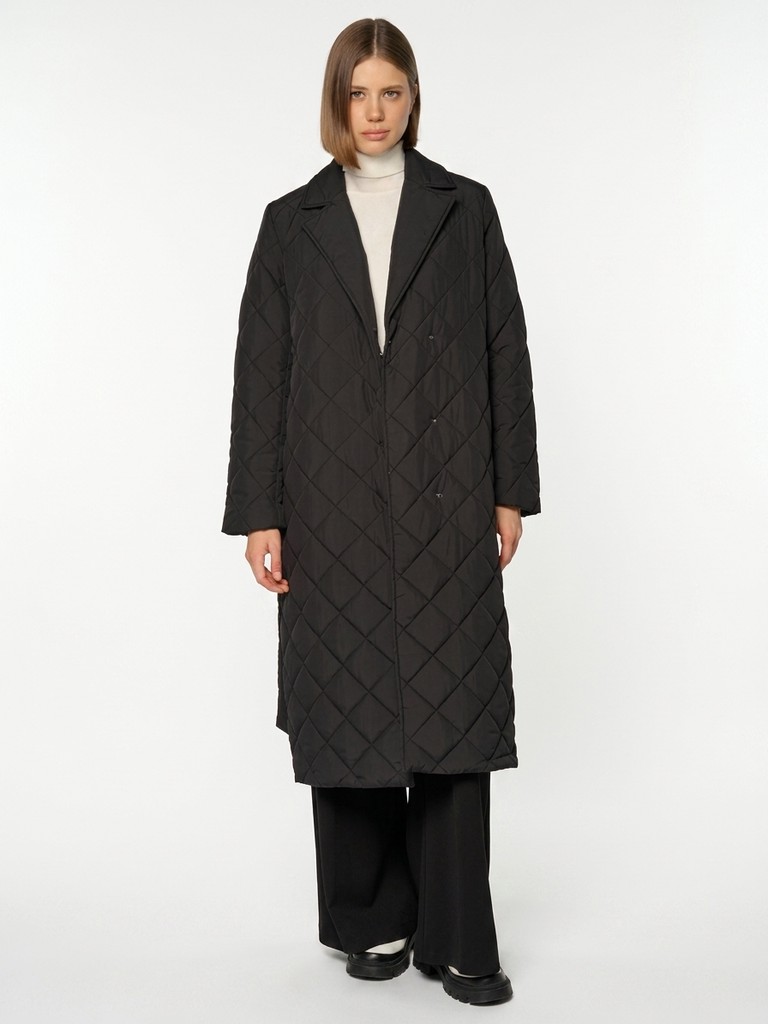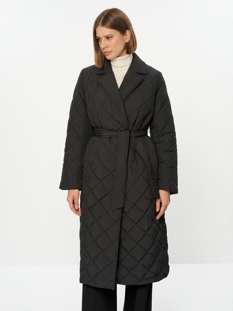 Длинное стеганое женское пальто черного цвета. Модель с отложным воротником и поясом. Лаконичное и стильное пальто подойдет для прогулок и выхода в свет. Для усиления образа дополните его сумочкой и очками от ELEGANZZA.