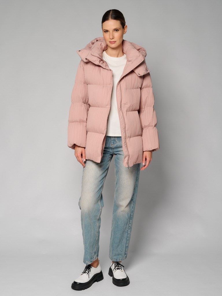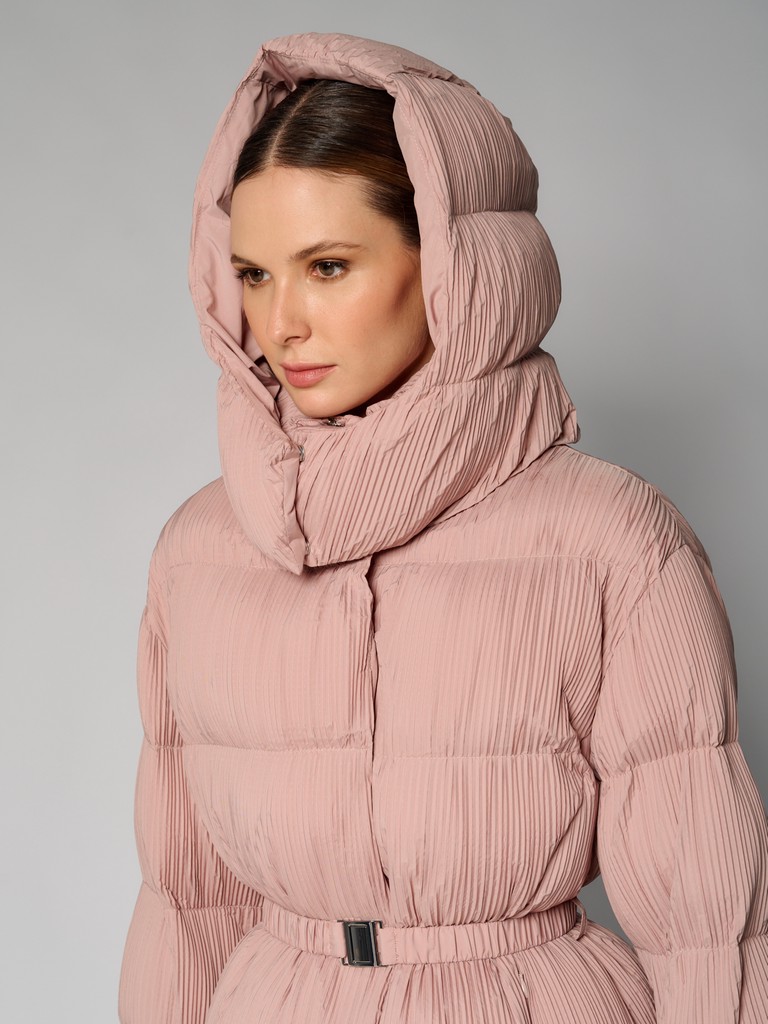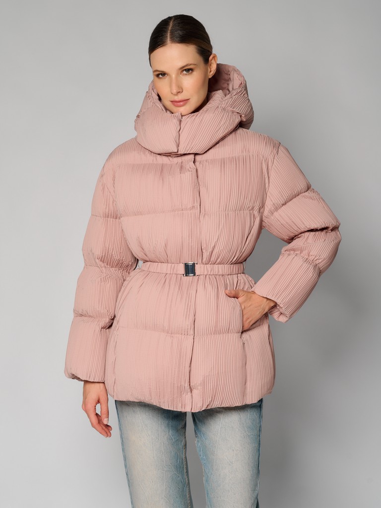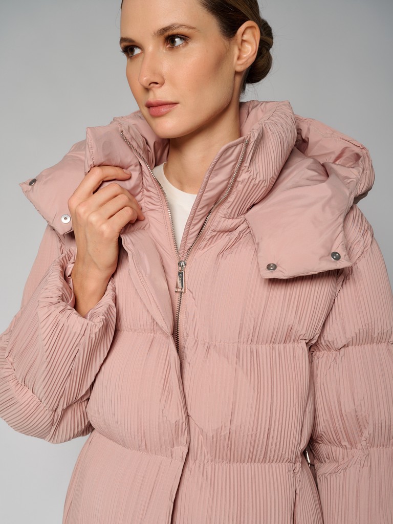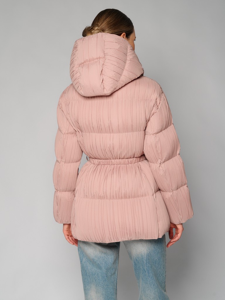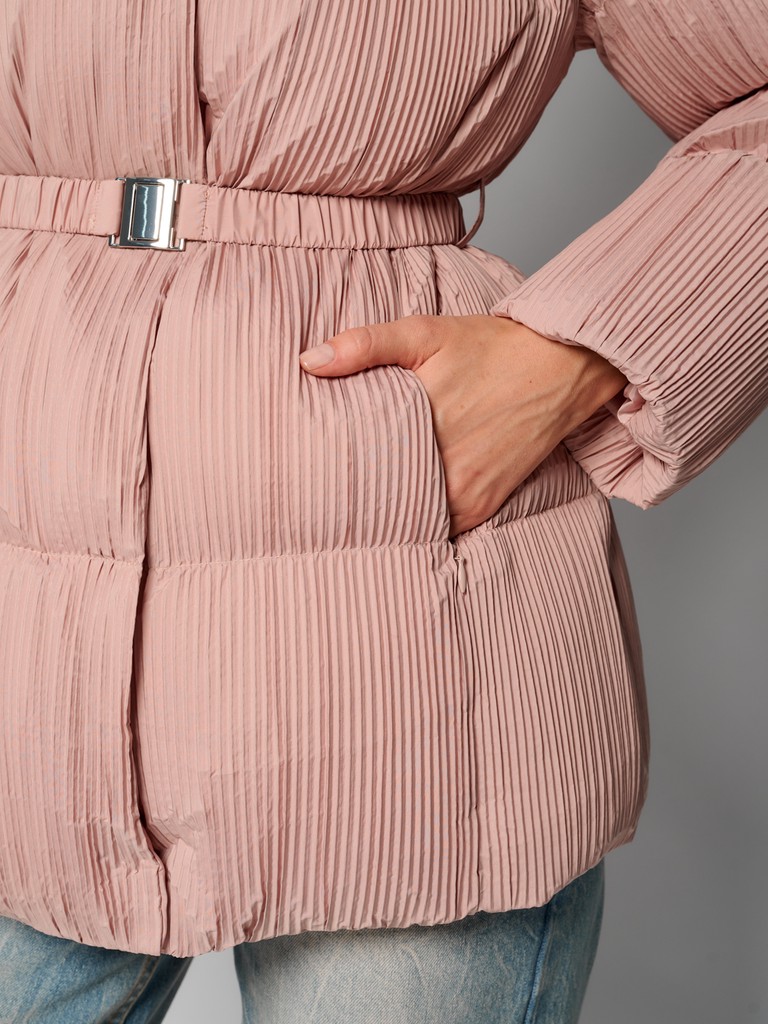 Куртка женская цвета пепла розы из плиссированной ткани. Модель на скрытой молнии, с воротником-стойкой на скрытых кнопках, с глубоким капюшоном и врезными карманами. На талии раположен пояс. Можно носить как с ним, так и без него. Куртка идеально подходит для носки зимой и в период холодного межсезонья.