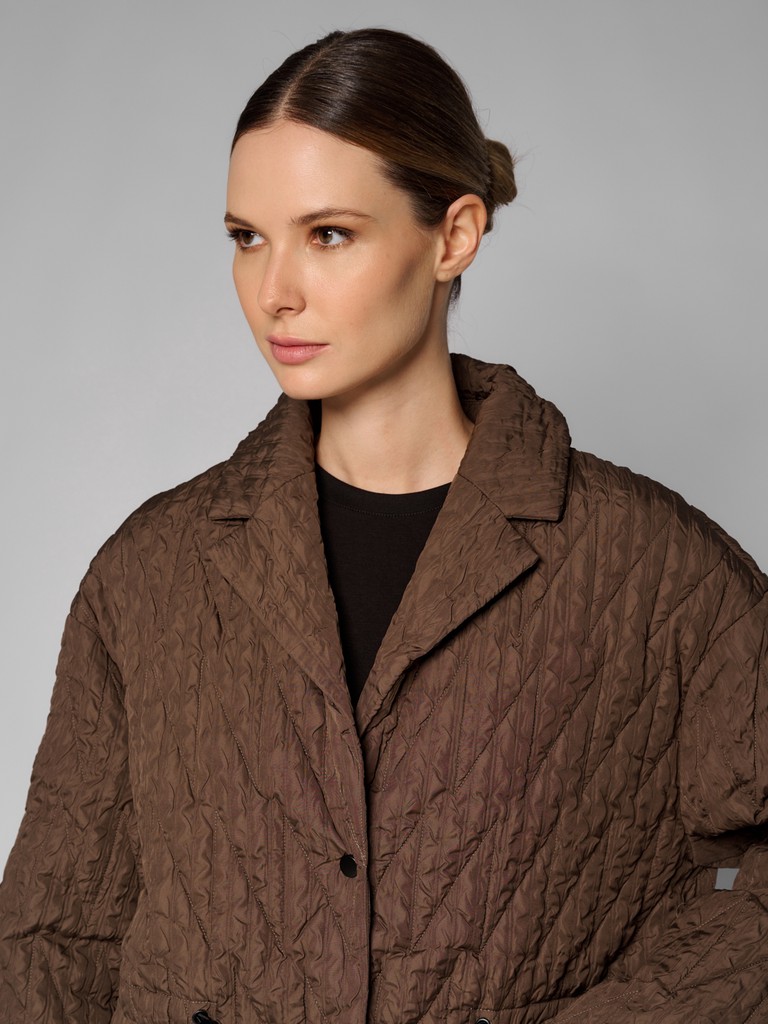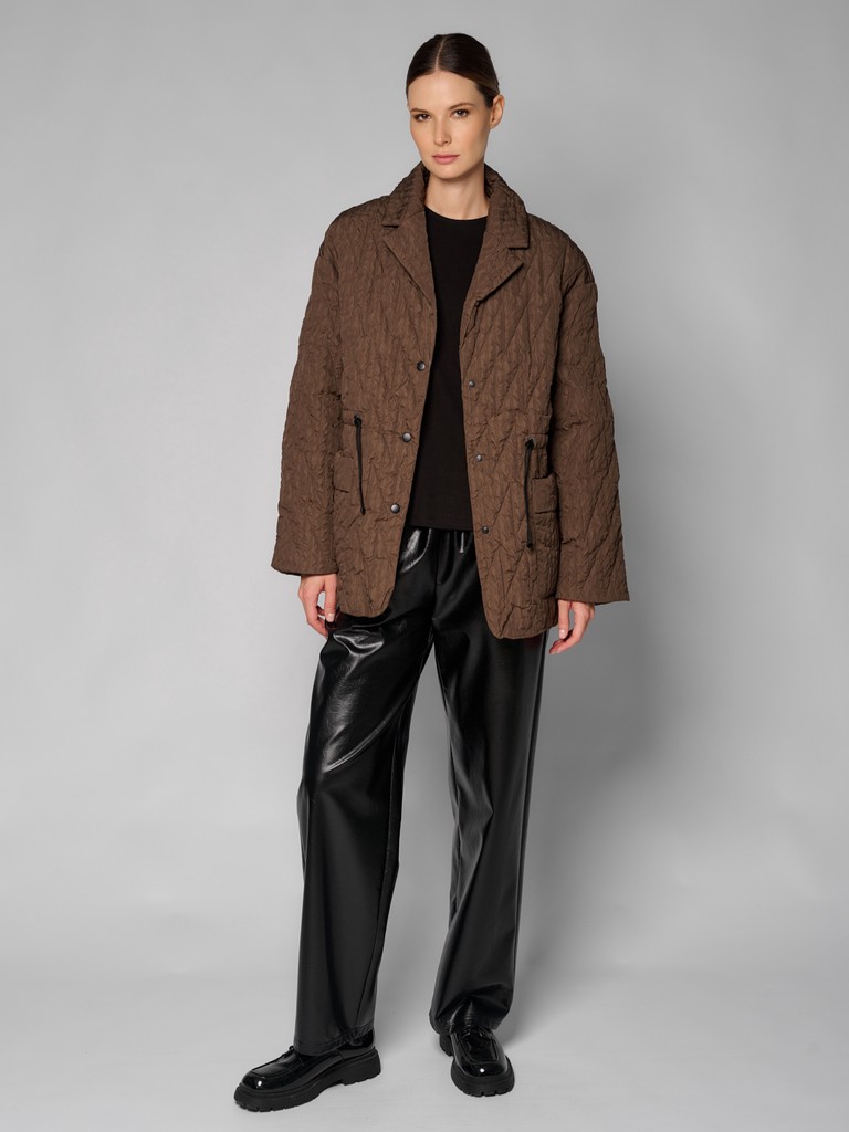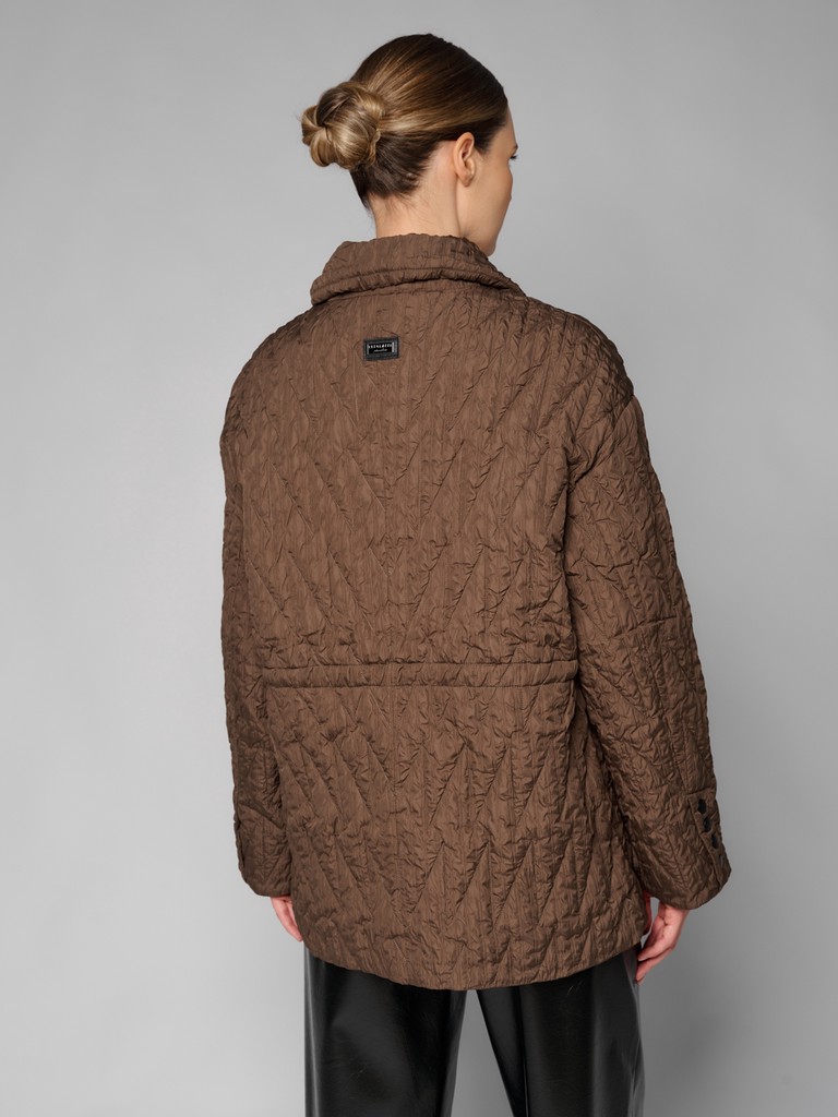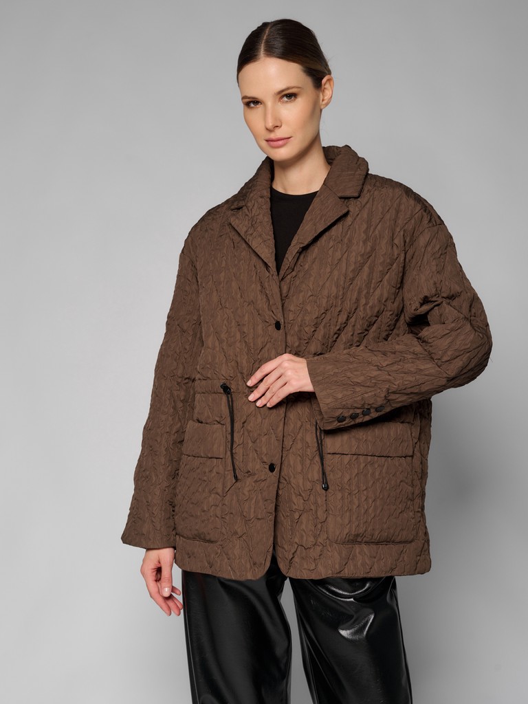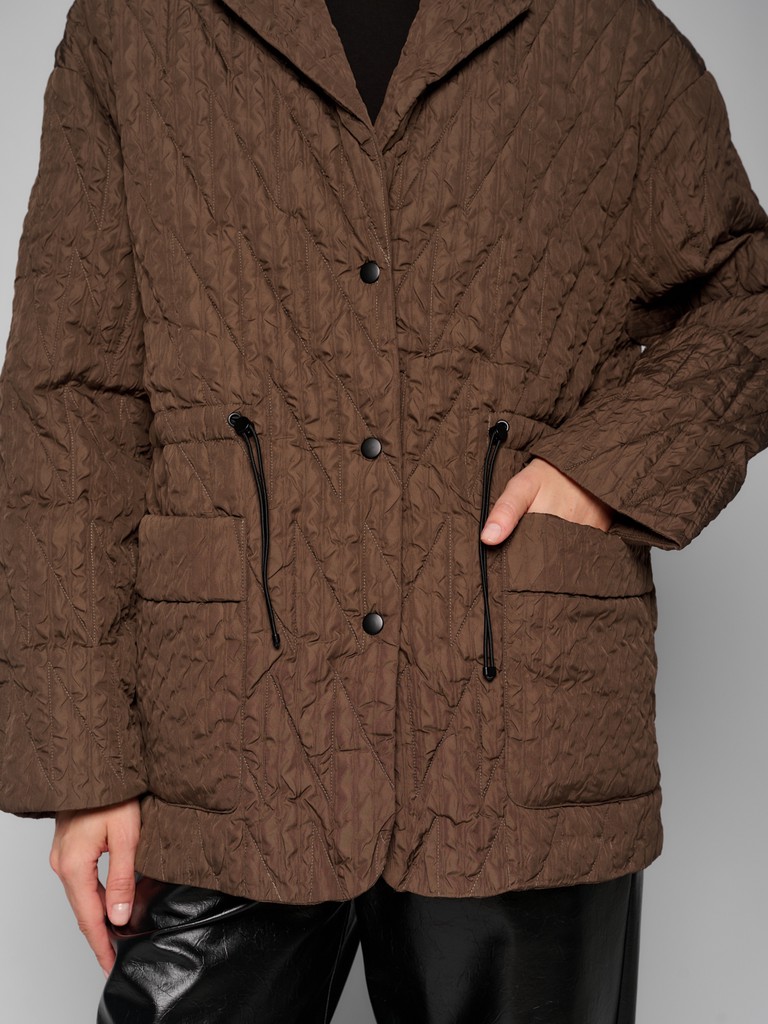 Стильная стеганая куртка-пиджак цвета хаки и застежкой на кнопки. Модель выполнена из сжатой ткани с наполнителем из 100% полиэстера. Для комфортной посадки по линии талии расположены утяжки. Куртка идеально подходит для создания повседневных и элегантных образов.
