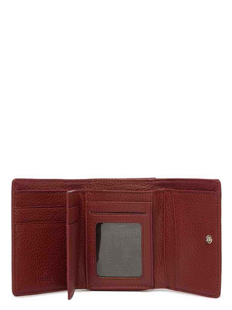 Женский кошелёк торговой марки LABBRA из натуральной кожи. В кошельке есть одно складывающееся отделения для купюр и 12 различных карманов для кредитных и дисконтных карт, эти отделения закрываются клапаном с кнопкой. Объемное отделение для мелочи расположено снаружи и закрывается на молнию, внутри имеет перегородку.