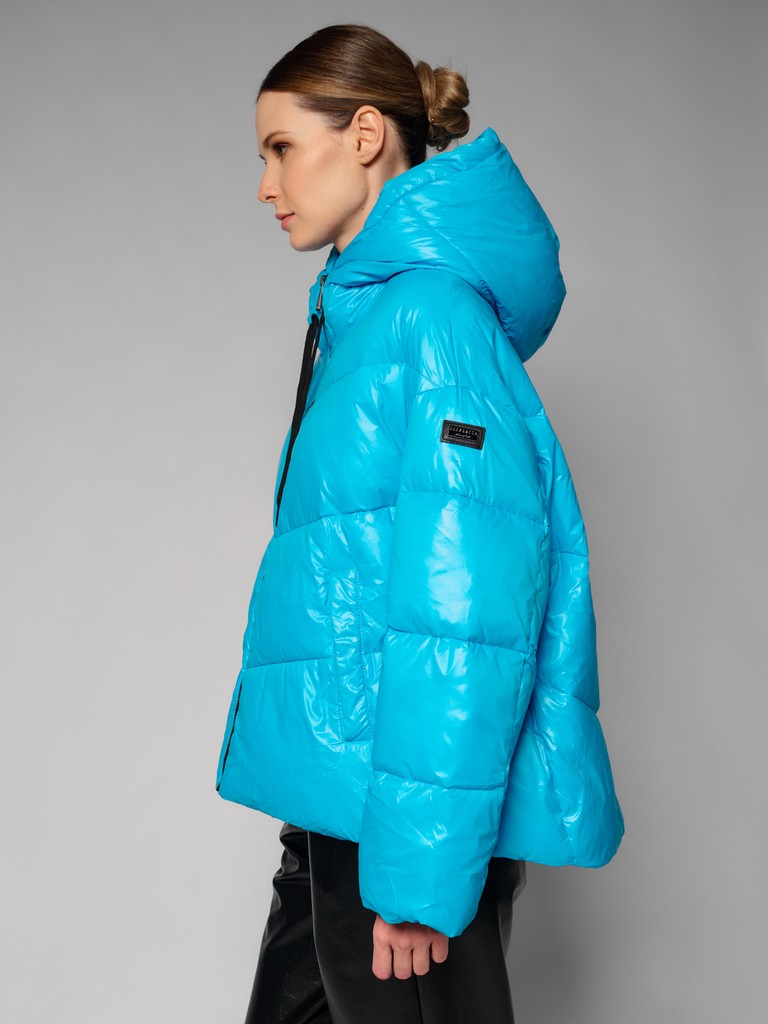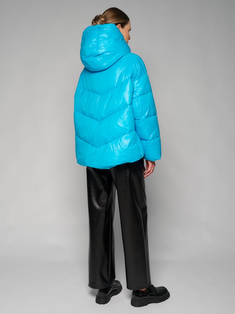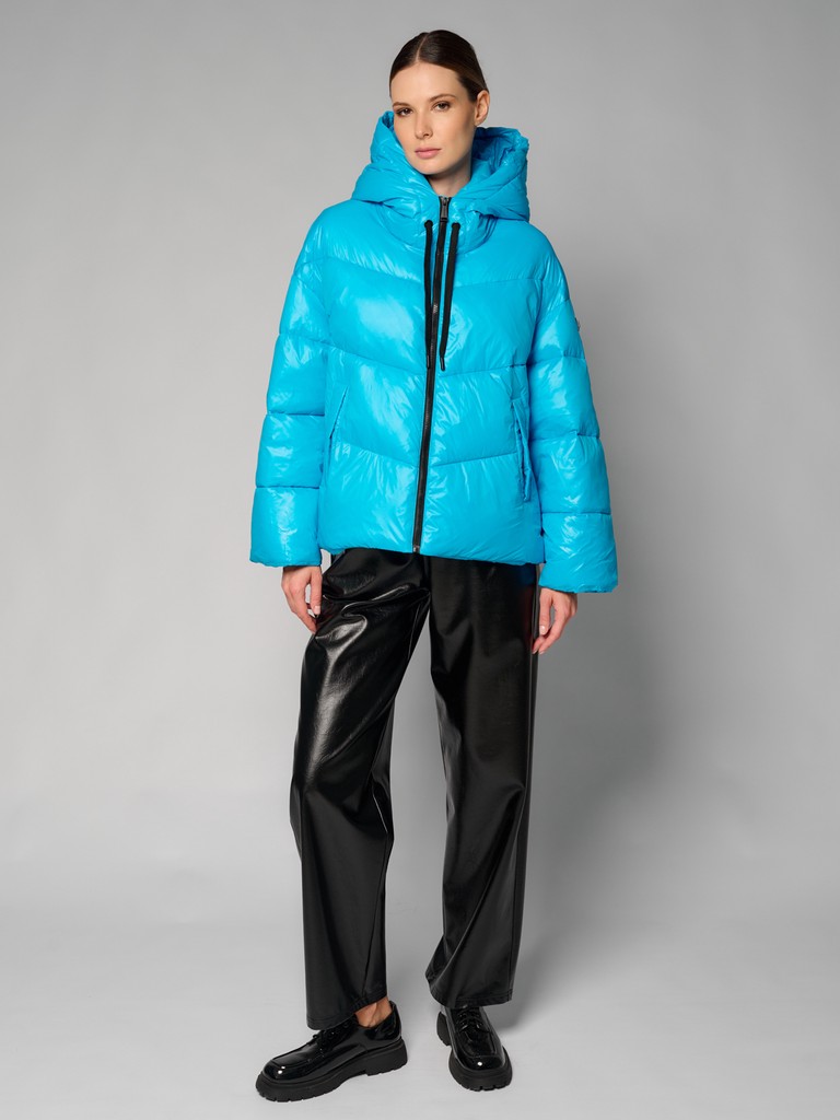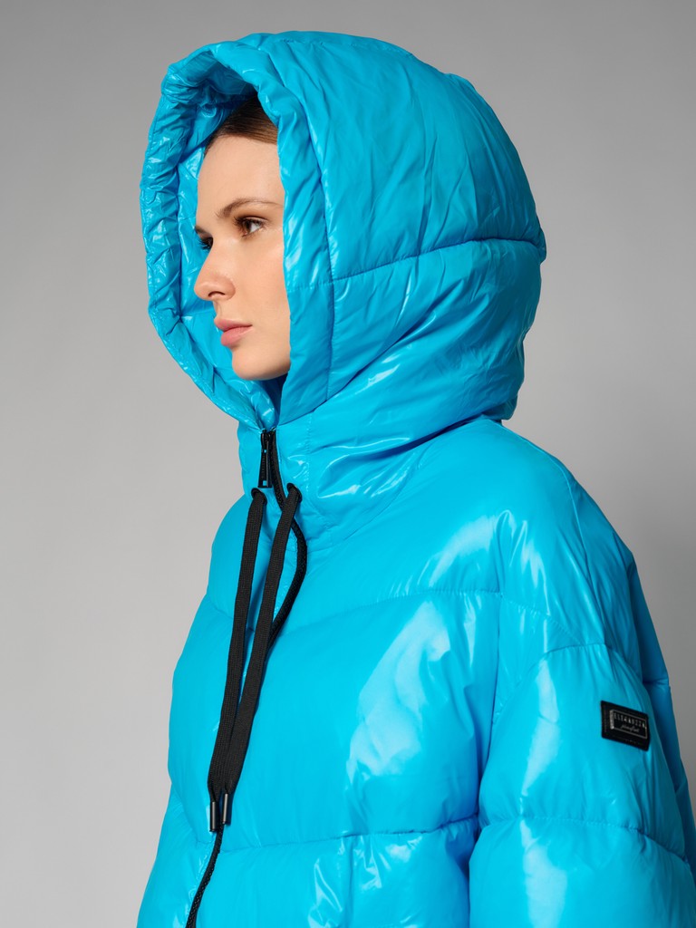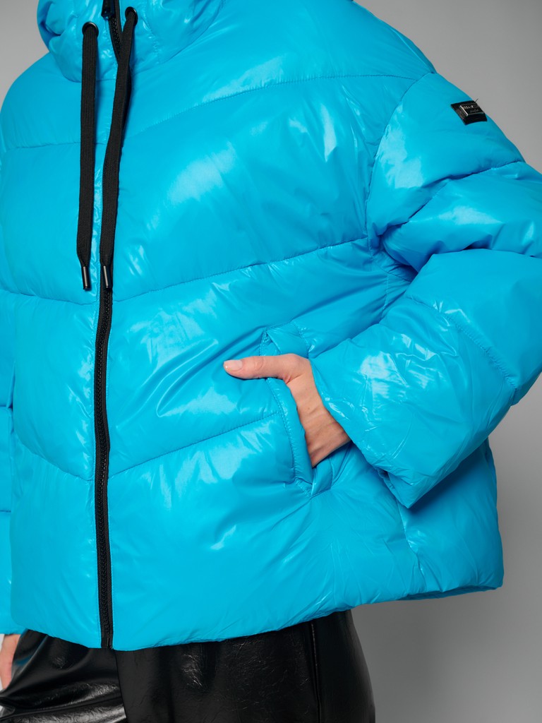 Женская куртка прямого кроя яркого голубого цвета. Модель выполнена из глянцевой ткани с наполнителем из 100% полиэстера, с воротником-стойкой с трикотажными утяжками, застегивается на контрастную молнию черного цвета. Куртка идеально подходит для носки зимой и в период холодного межсезонья.
