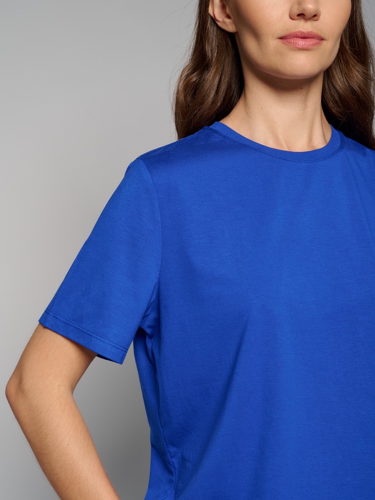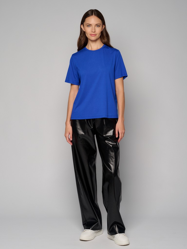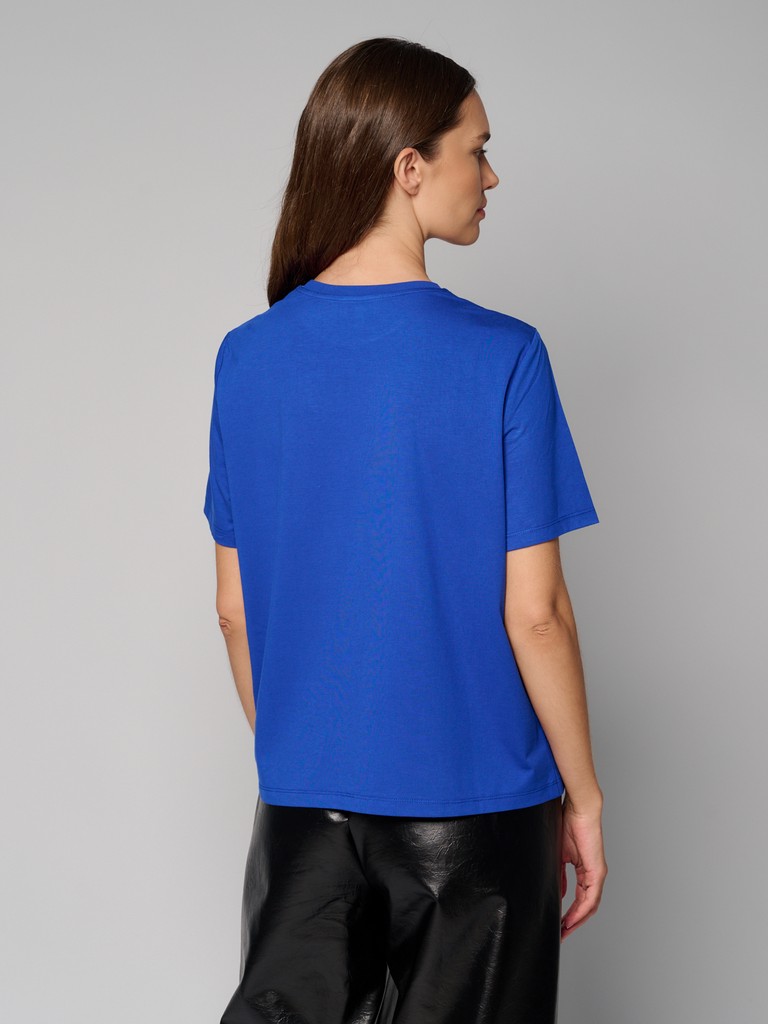 Базовая женская футболка синего цвета с коротким рукавом. Смесовый материал с основой из вискозы - тактильно приятный и дышащий, обеспечивает комфорт во время носки. В составе используется современный материал сорона на основе волокон кукурузы. Материал добавляют в состав изделий, чтобы сделать одежду более прочной и устойчивой к истиранию.