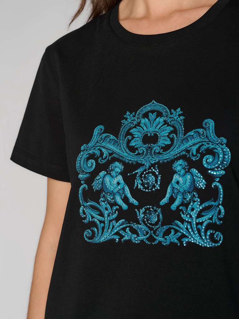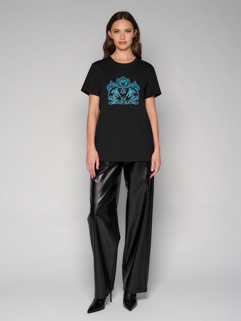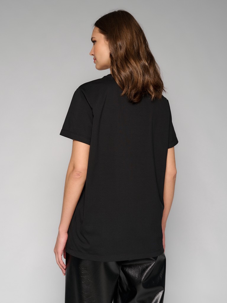 Стильная женская футболка черного цвета с элегантным узором от ELEGANZZA, украшенным стразами. Смесовый материал с основой из хлопка - тактильно приятный и дышащий, обеспечивает комфорт во время носки. Футболка прекрасно дополнит любой образ.