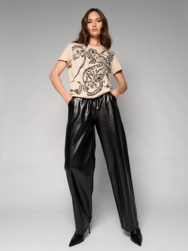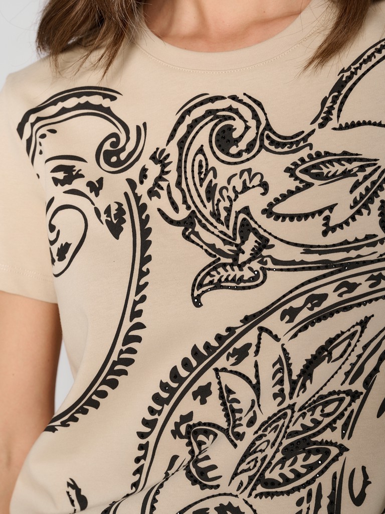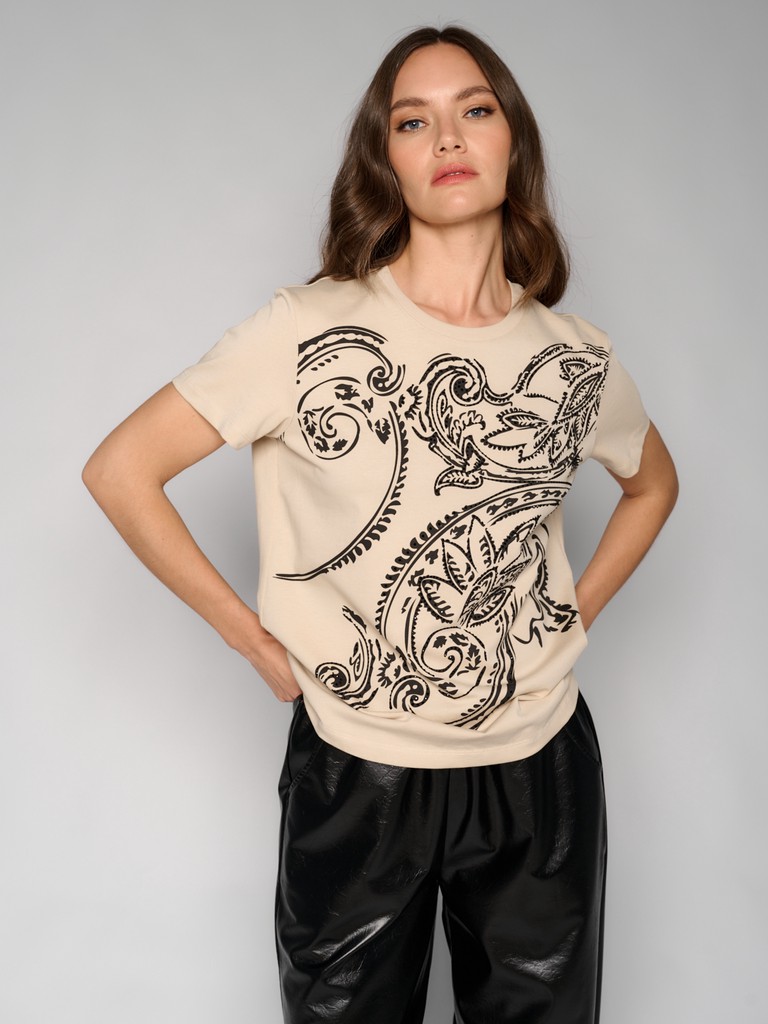 Стильная женская футболка молочного цвета с элегантным узором Paisley от ELEGANZZA. Смесовый материал с основой из хлопка - тактильно приятный и дышащий, обеспечивает комфорт во время носки. Футболка прекрасно дополнит любой образ.