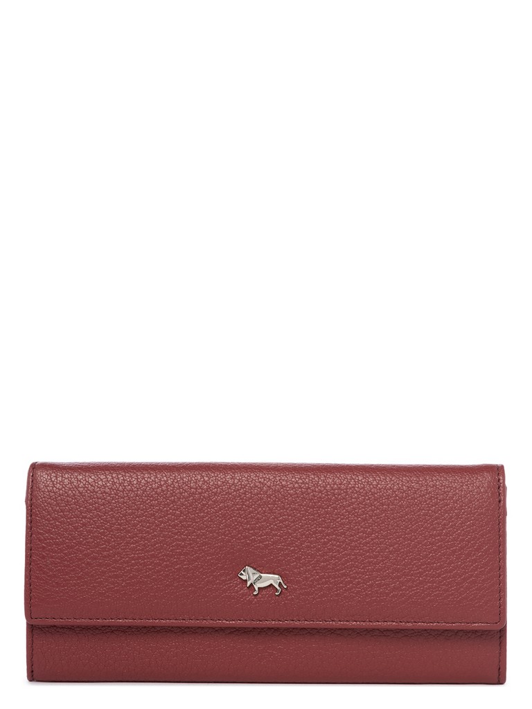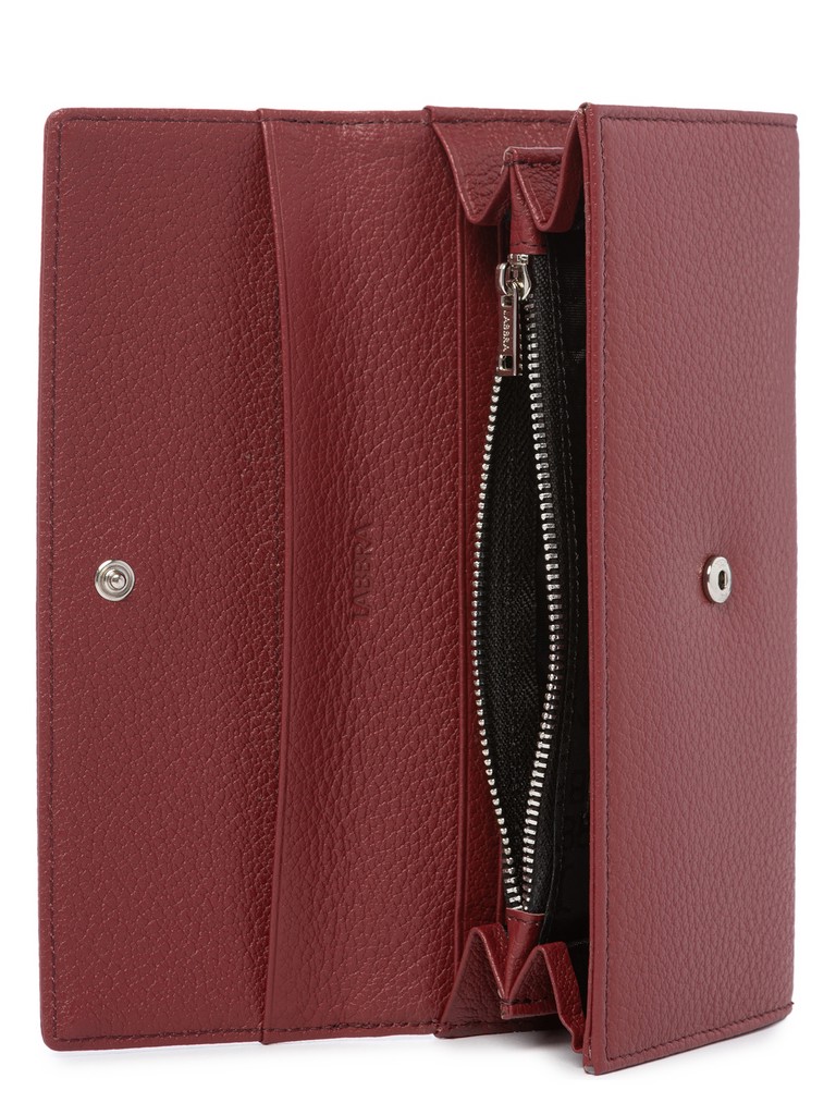 Женский кошелёк торговой марки LABBRA из натуральной кожи. Модель закрывается на клапан с кнопкой. Внутри кошелька есть 2 не складывающихся отделения для купюр и два дополнительных плоских кармана для купюр, . отделение для мелочи, которое закрывается на молнию, 14 карманов для карт и один плоский складывающийся карман для документов. На задней стенке кошелька есть открытый плоский карман.