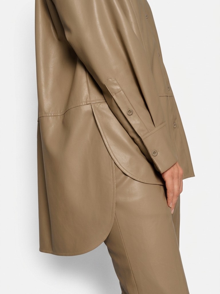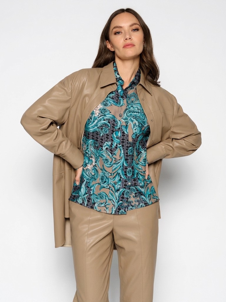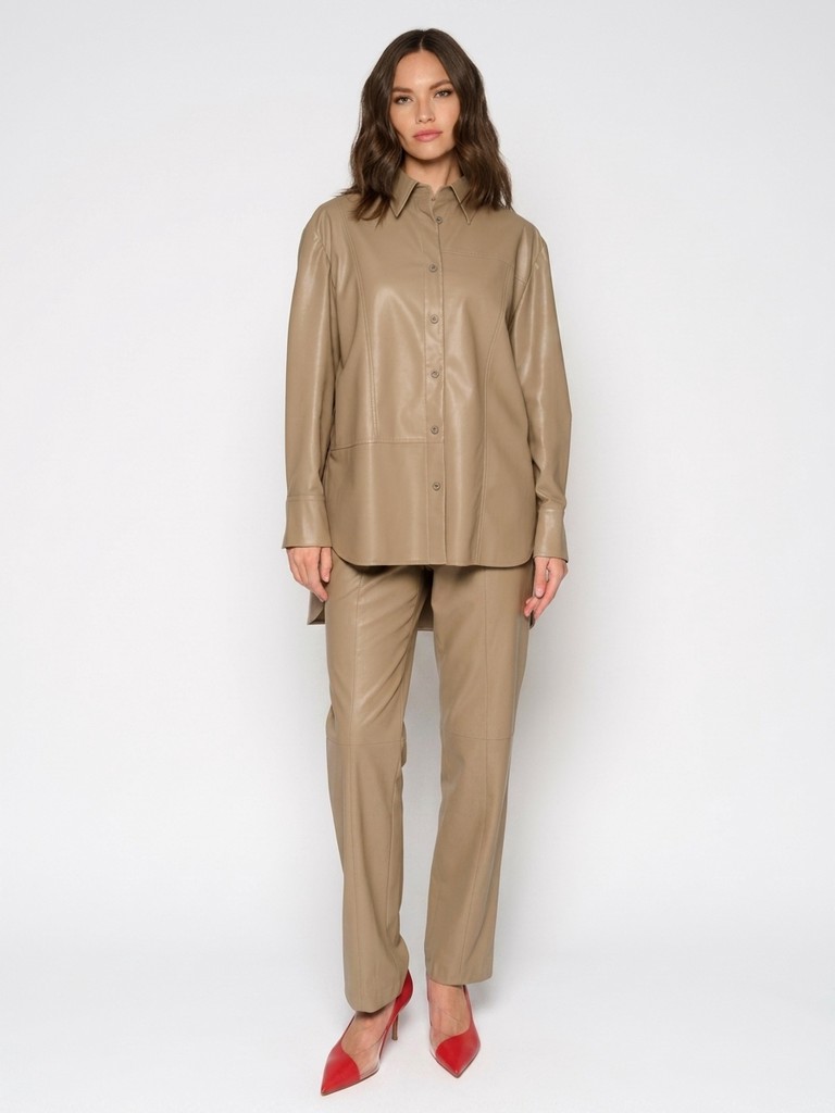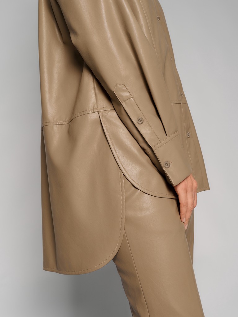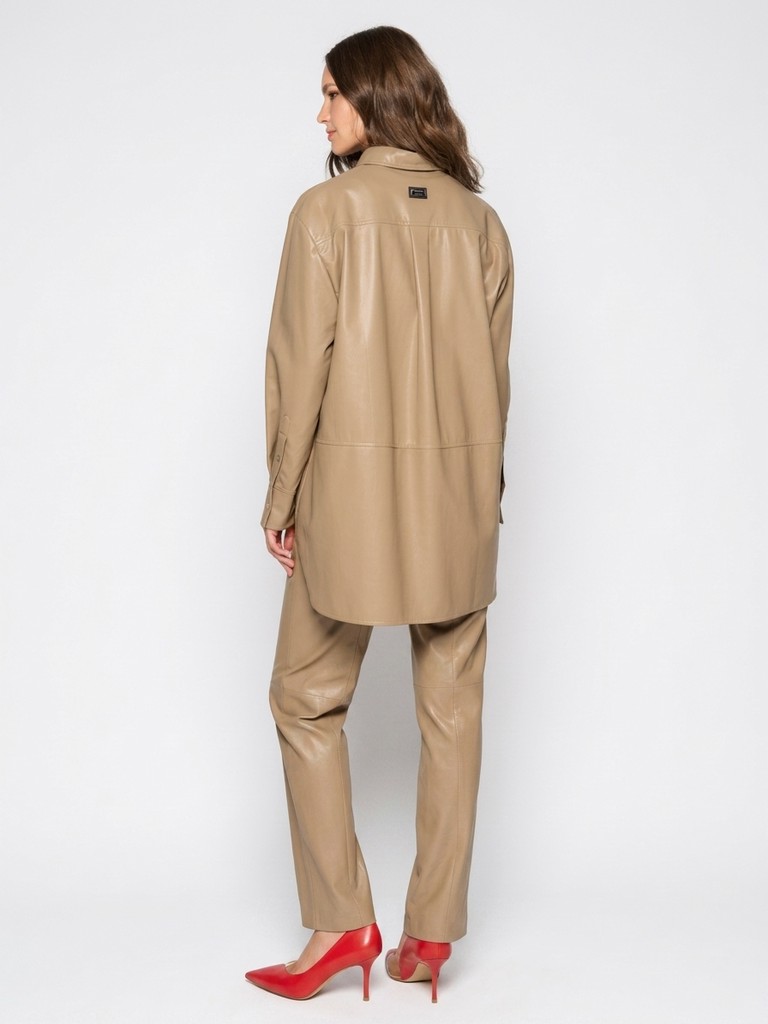 Женская бежевая рубашка из искусственной кожи. Модель прямого кроя с удлиненной спинкой, на кнопках, с длинным втачным рукавом и манжетой на пуговицах, ассиметричными вышитыми линиями на лицевой стороне. Данная рубашка - стильный и универсальный предмет гардероба. Для усиления образа рекомендуем носить в комплекте с брюками из искусственной кожи от ELEGANZZA.