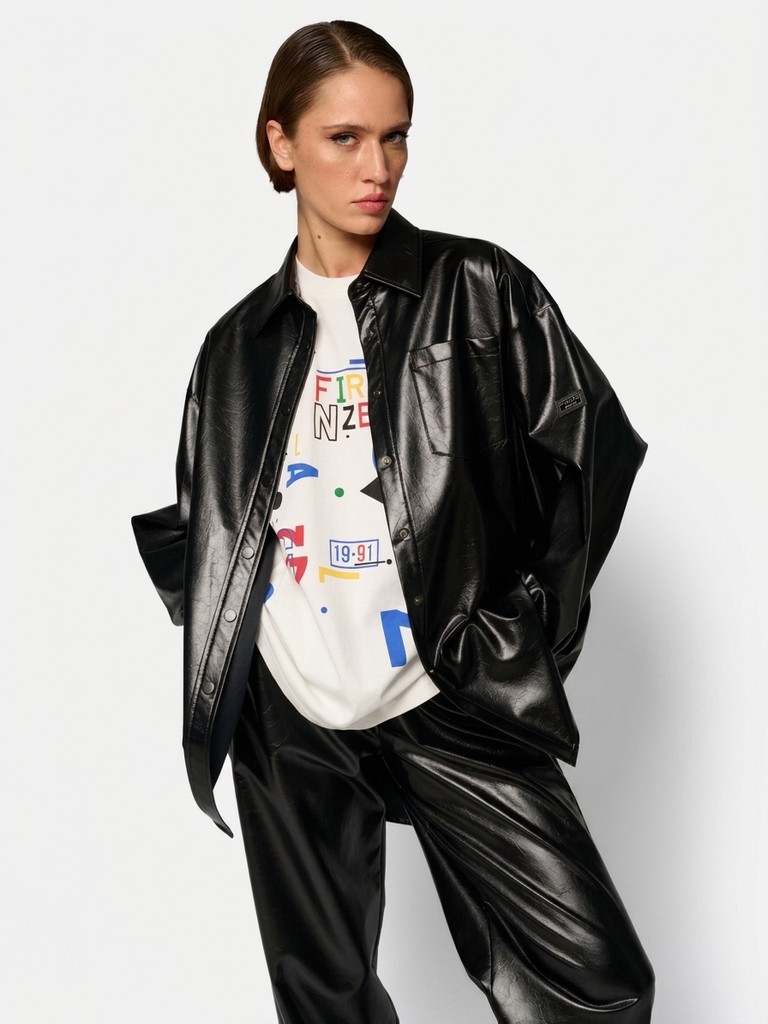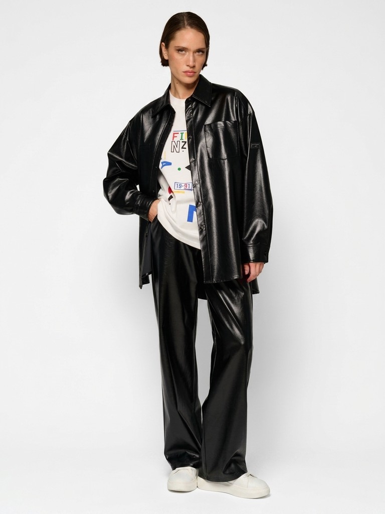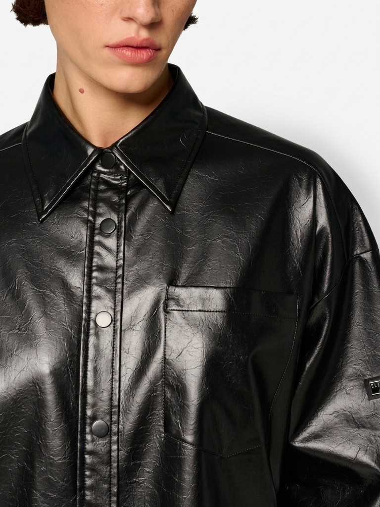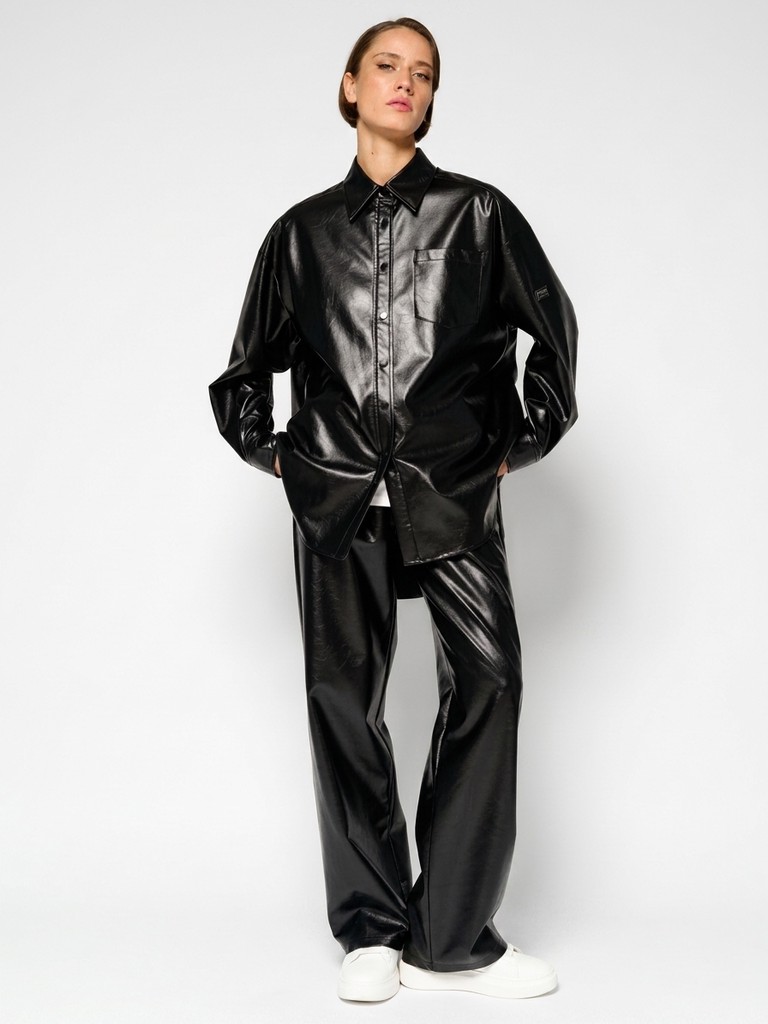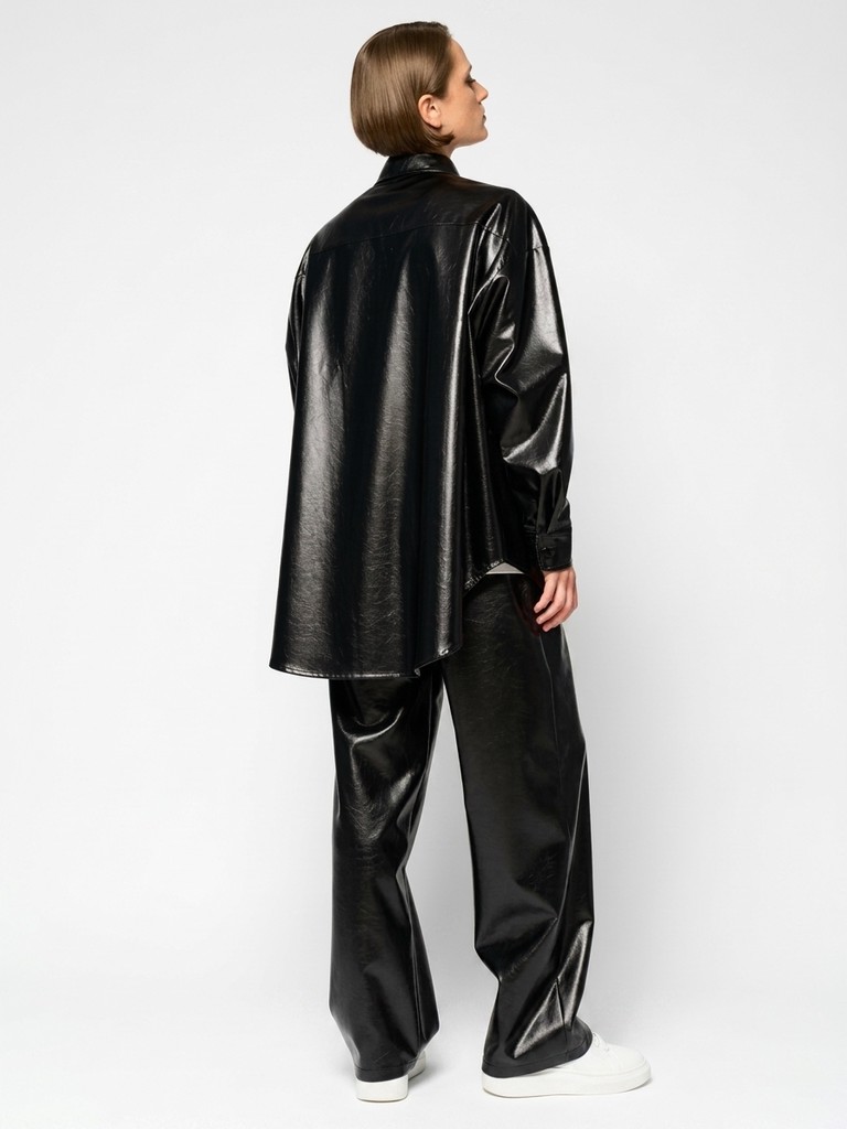 Женская черная рубашка из искусственной кожи. Модель прямого кроя с удлиненной спинкой, на кнопках, с длинным спущенным втачным рукавом и манжетой на кнопке, накладным карманом на груди. Данная рубашка - стильный и универсальный предмет гардероба. Для усиления образа рекомендуем носить в комплекте с брюками из искусственной кожи от ELEGANZZA.