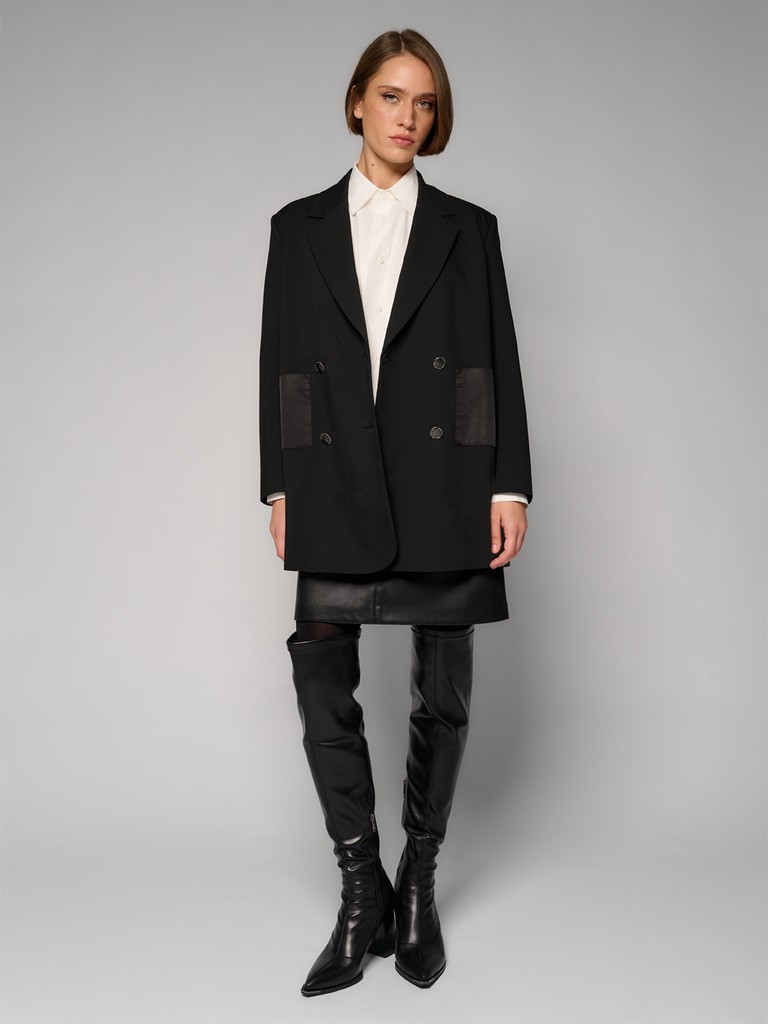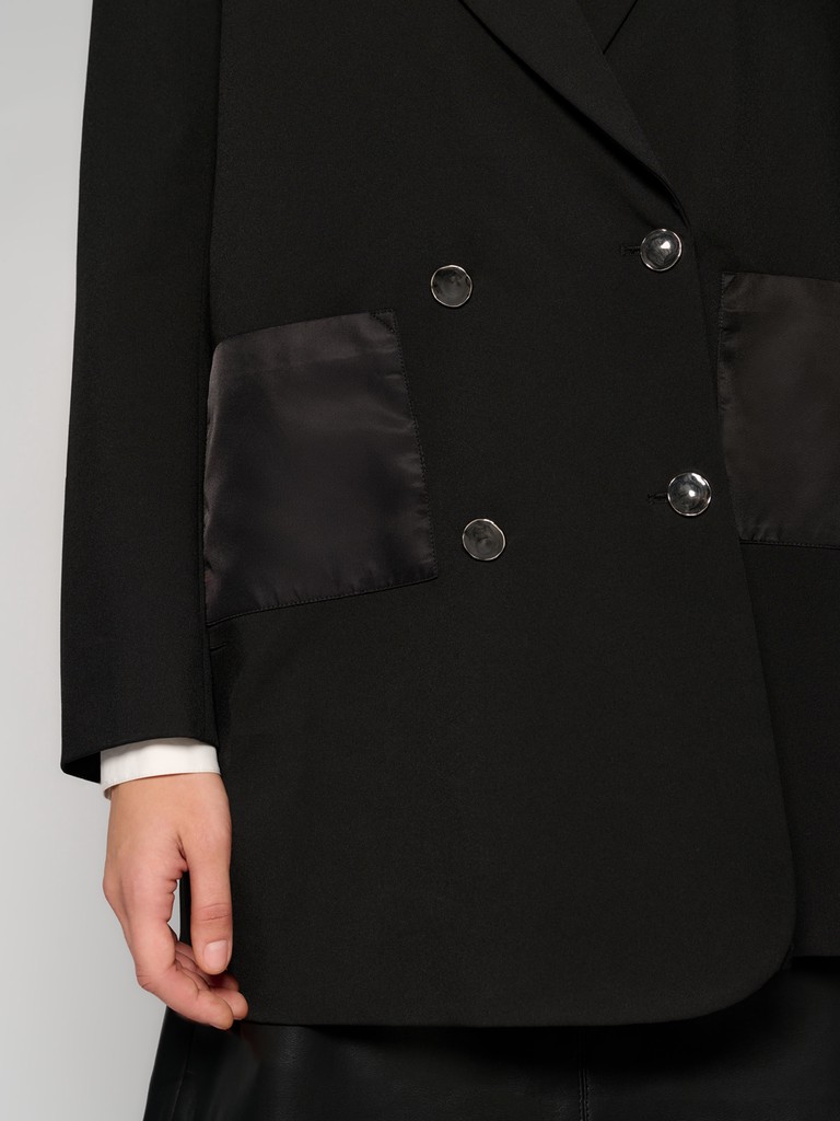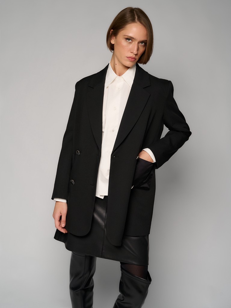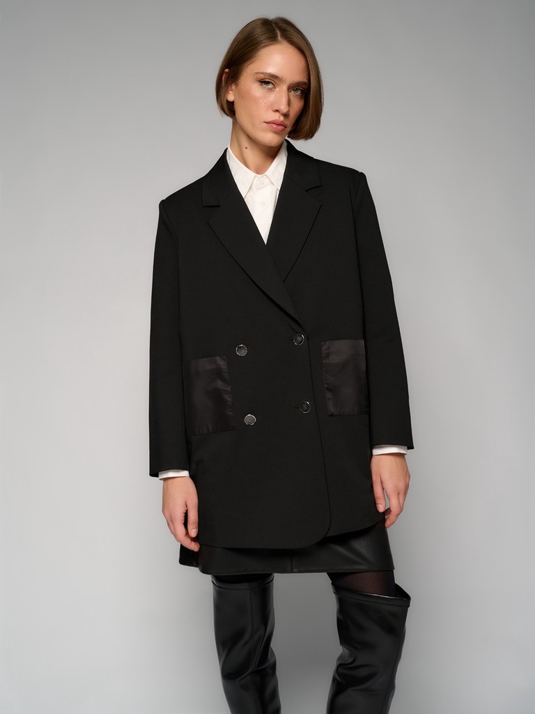 Женский двубортный пиджак черного цвета. Модель из костюмной ткани на четырех пуговицах с симметрично расположенными карманами из атласной ткани, с пуговицами на манжетах. Рекомендуем сочетать с брюками и платьями из коллекции ARABESQUE GLOW от ELEGANZZA.