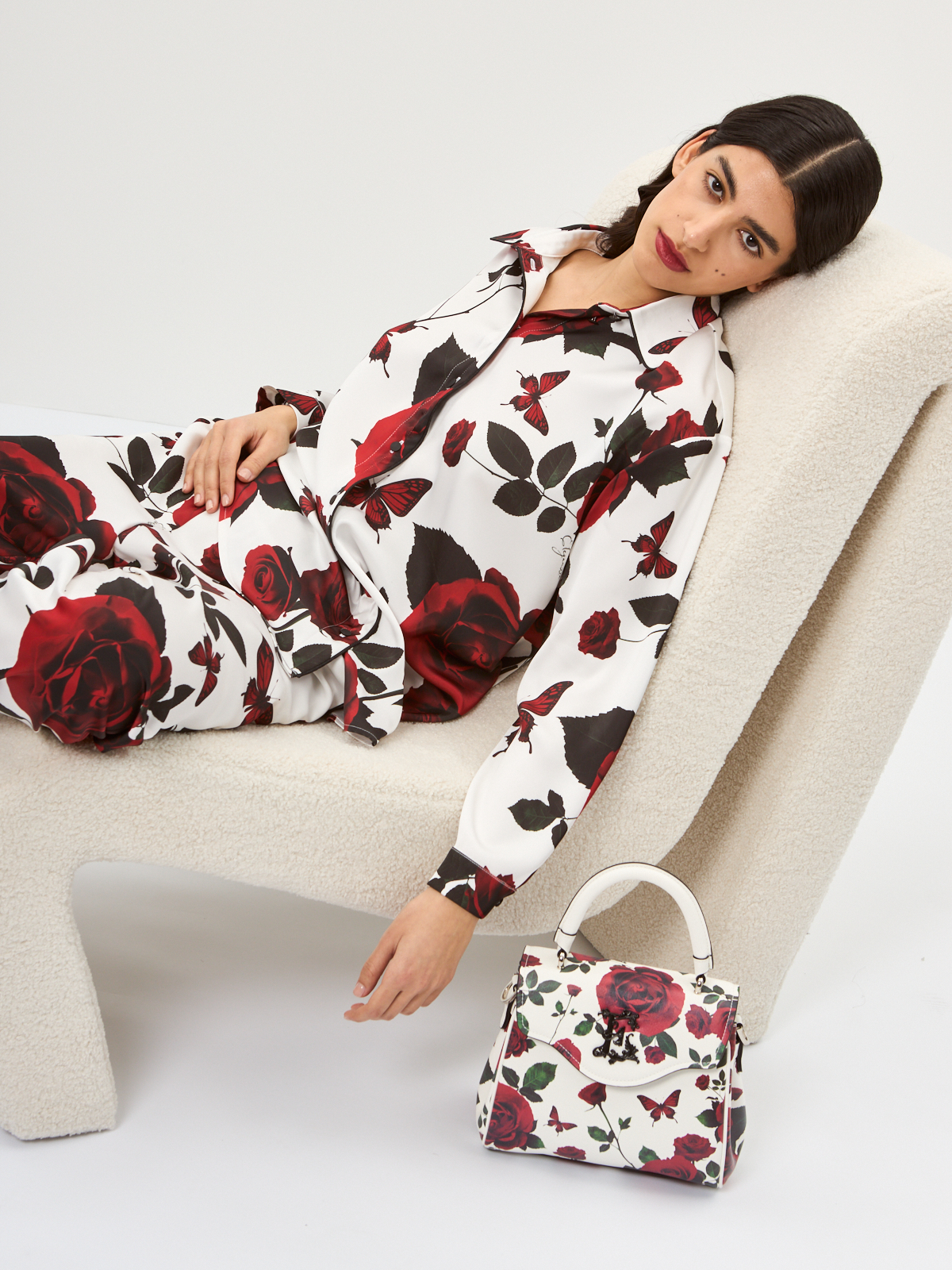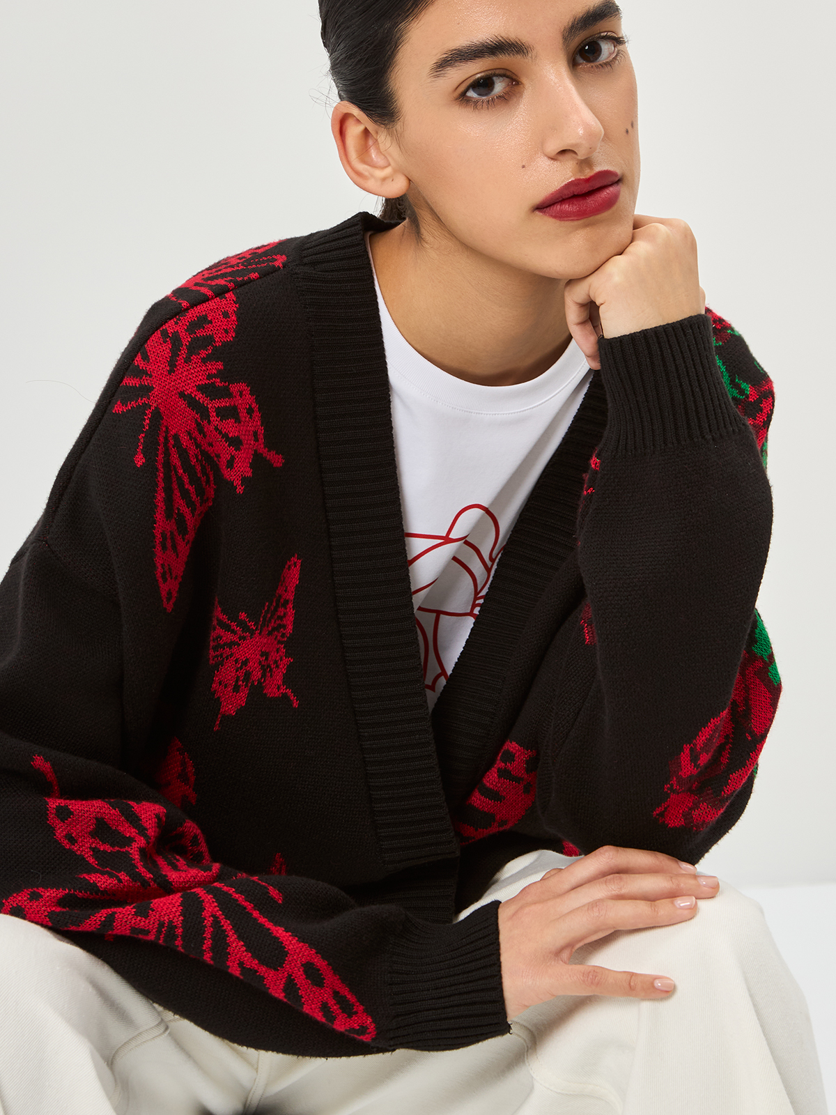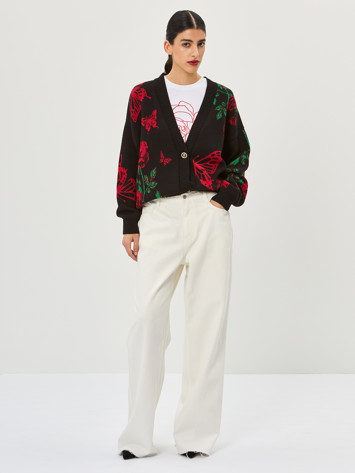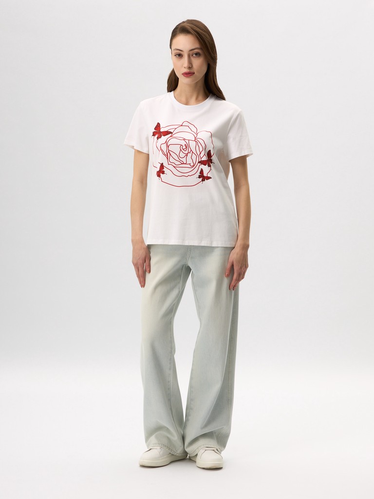 Классическая футболка – основа стильного образа. Прямой силуэт дарит комфорт и свободу движений, идеально подходя для любой фигуры. Круглый вырез делает ее универсальной базой гардероба. Очаровательный принт - роза, украшенная бабочками из мерцающих страз, добавляет нежности и изысканности. Подчеркните свою женственность и добавьте немного сияния в повседневный стиль.