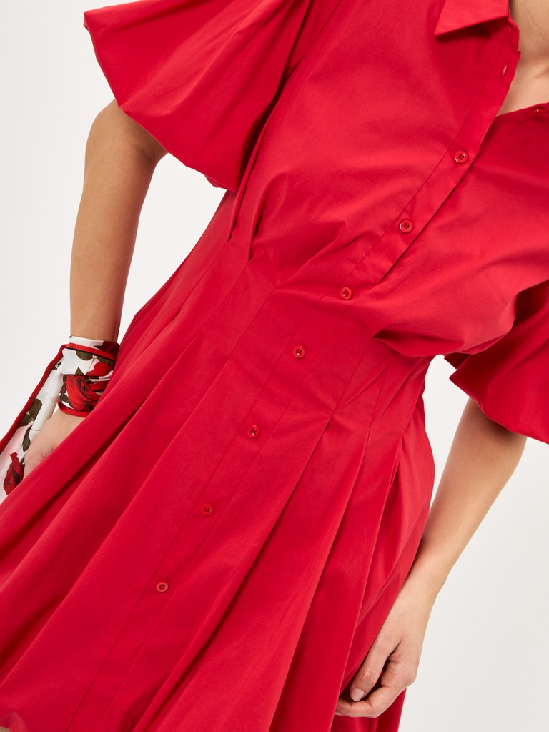 Хлопковое платье А-силуэта - ваш секрет безупречного стиля. Мини-длина создает легкий и кокетливый образ, а застежка на пуговицы и складки на талии - женственный силуэт. Удобные карманы и потайная молния добавляют комфорта. Рукава-баллоны и рубашечный воротник привносят нотку элегантности. Сочетание комфорта и утонченности для любого случая.