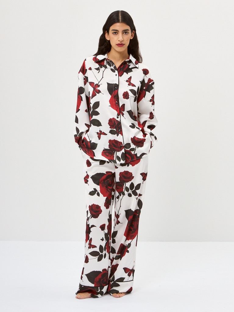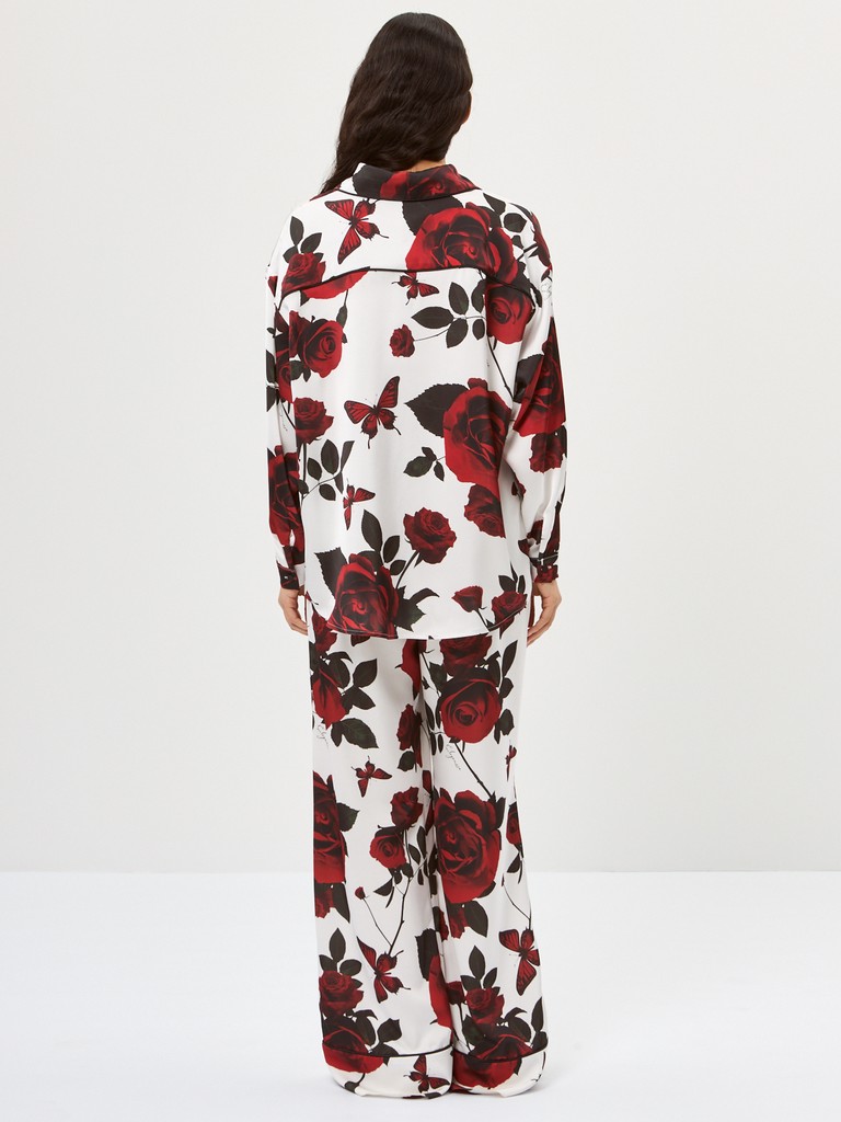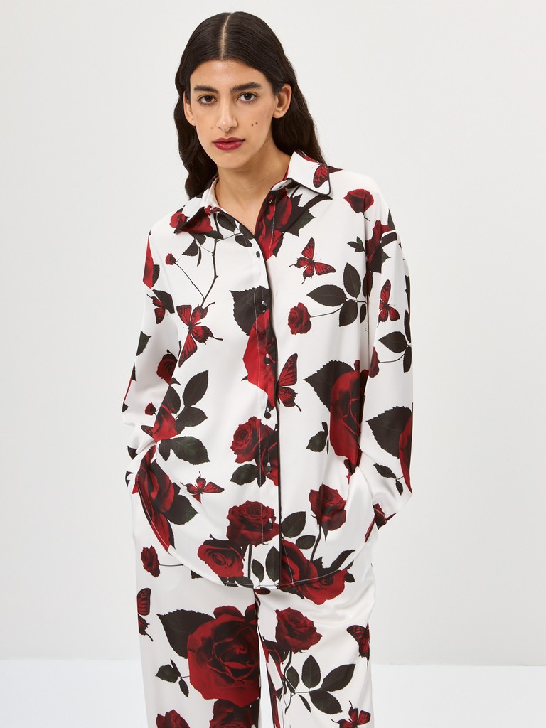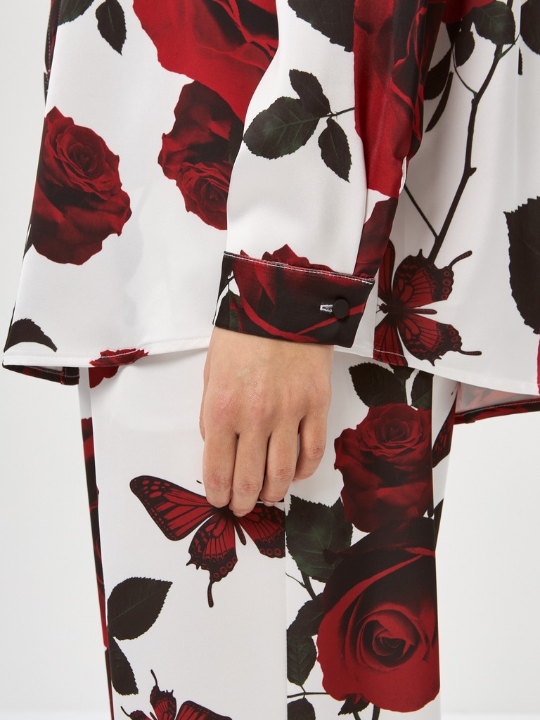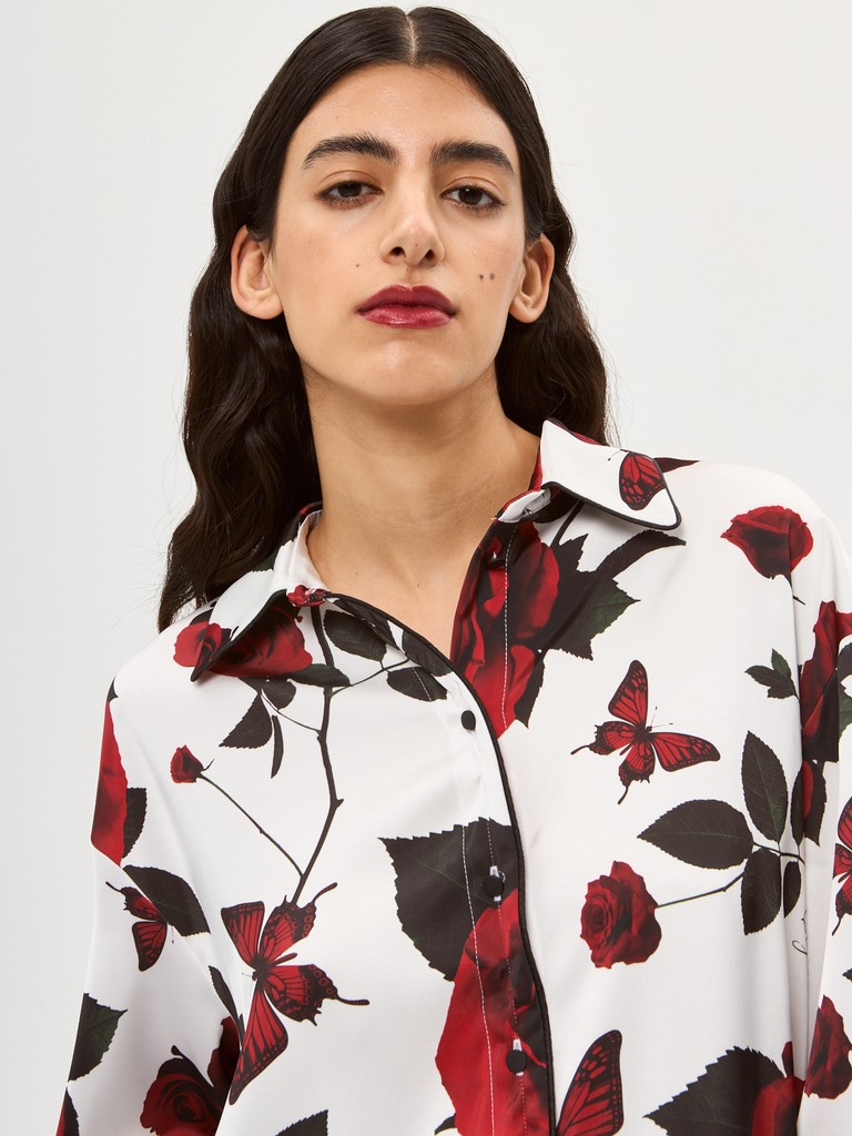 Рубашка Renaissance Flowers: легкость и изящество эпохи Возрождения! Свободный крой из струящейся ткани дарит комфорт. Уникальный цветочный принт и элегантный черный кант создают неповторимый образ. Застежка на пуговицы, отложной воротник на стойке и фигурный низ подчеркивают внимание к деталям. Ощутите дух искусства в каждой линии!