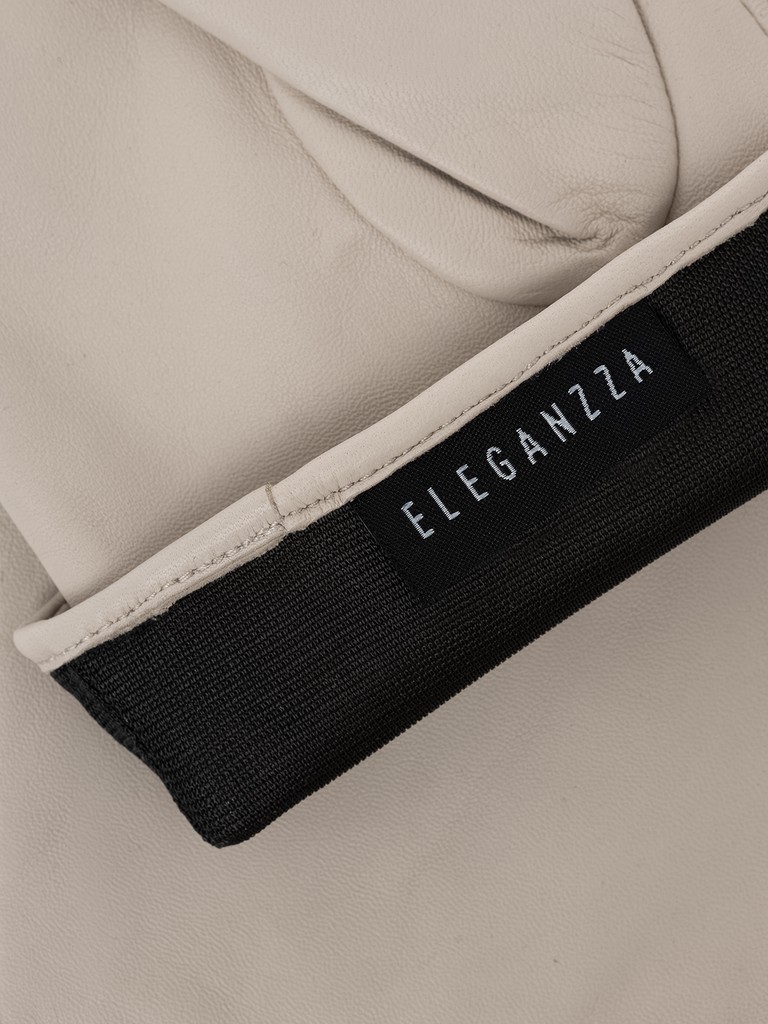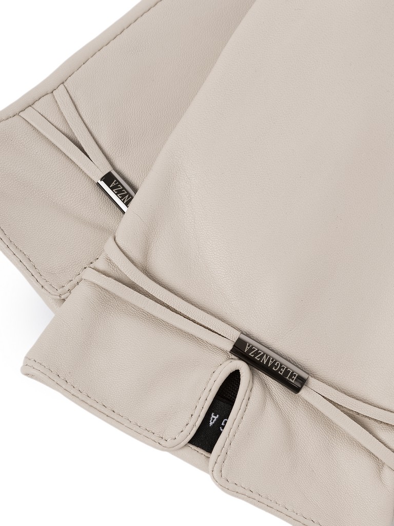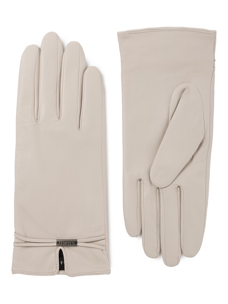Перчатки торговой марки ELEGANZZA производства Китай выполнены из кожи ягнёнка. Шёлковая подкладка. Декоративные элементы - фирменная фурнитура на узких кожаных ремнях. Нижний край перчатки и разрез на лицевой стороне окантованы. Длина манжеты от нижней точки большого пальца до края перчаток - 6 см. Длина пальцев - средняя.