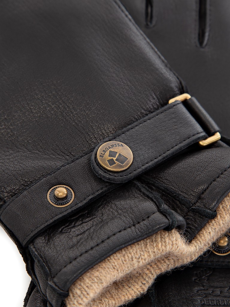 Перчатки торговой марки ELEGANZZA производства Китай выполнены из кожи оленя чёрного цвета. Подкладка: 100% шерсть. Швы - наружные машинные нитью в тон кожи. Отделка - на наружной стороне горячее тиснение знака оленя, разрез с глухим клапаном и рабочий ремень. Цвет фурнитуры (рамка, кнопка) - тёмный металлик. Вкладыш выступает на 5 мм за нижний край перчатки. Длина манжеты от нижней точки большого пальца до края перчаток - 5 см.