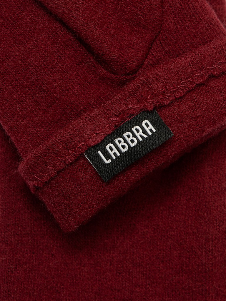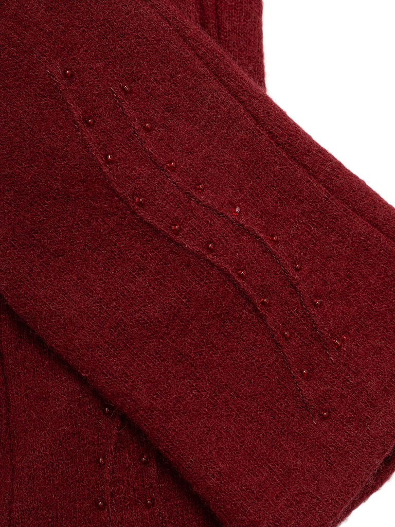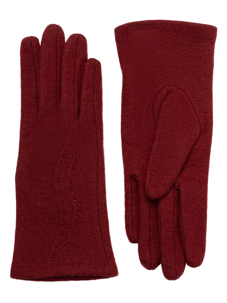 Перчатки торговой марки LABBRA производства Китай выполнены из трикотажной шерсти. Состав трикотажа: 80% шерсть, 20% нейлон. Без подкладки. На лицевой стороне перчатки декоративная отстрочка и бисер. Длина манжеты от нижней точки большого пальца до края перчатки - 5,5 см. Длина пальцев - средняя.