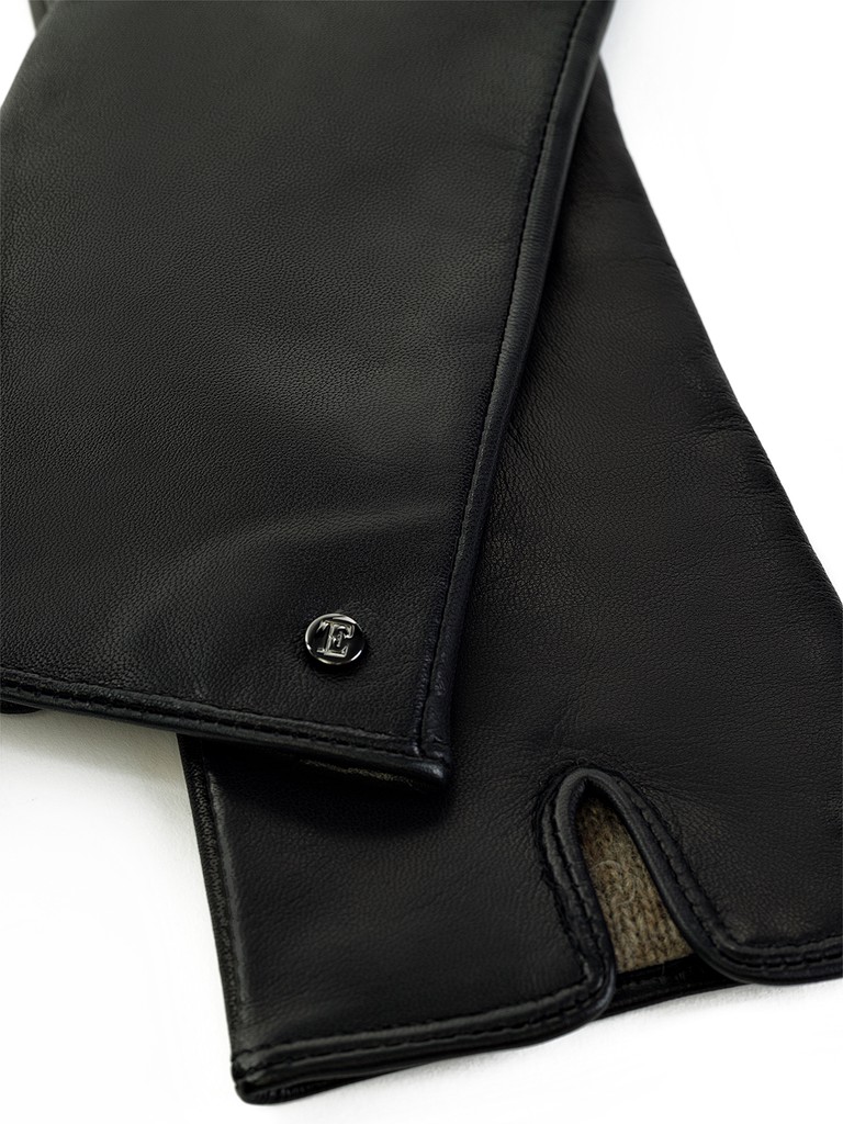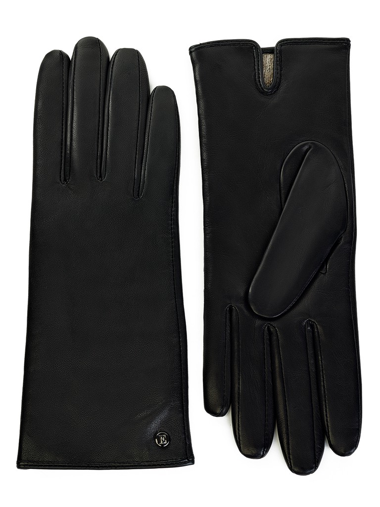 Перчатки женские торговой марки ELEGANZZA производства Китай изготовлены из натуральной кожи ягненка. Декоративная отделка - металлические фурниутра с фирменной символикой на лицевой стороне. Подкладка: 100% шерсть. Длина манжеты от нижней точки большого пальца до края перчаток - 6 см. Длина пальцев - средняя.