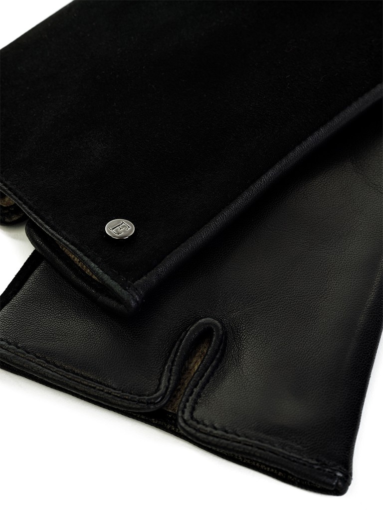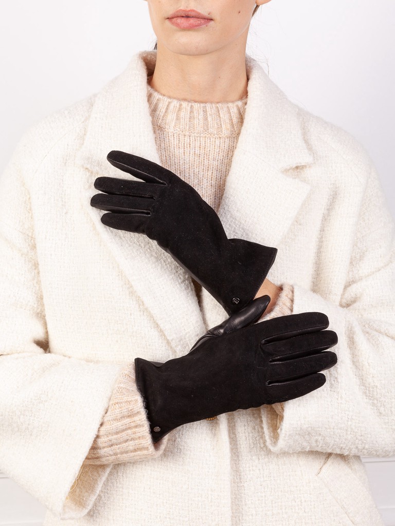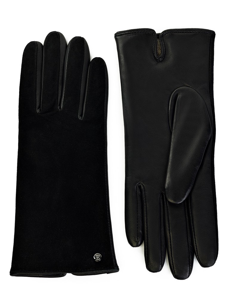 Перчатки женские торговой марки ELEGANZZA производства Китай изготовлены из натуральной кожи: верхняя часть - натуральный велюр, ладонная часть - натуральная кожа ягненка. Подкладка: 100% шерсть. Декоративная отделка - металлическая фурнитура с фирменной символикой. Длина манжеты от нижней точки большого пальца до края перчаток составляет 6 см. Длина пальцев - средняя.
