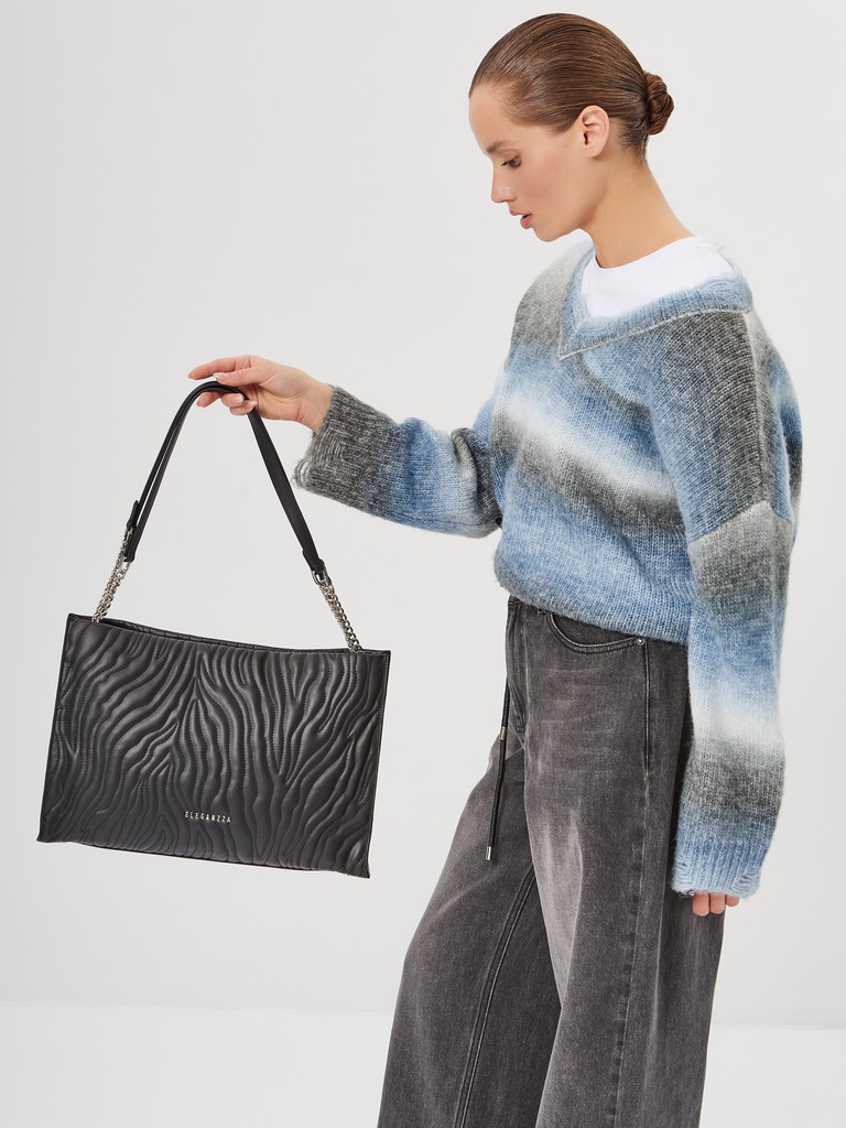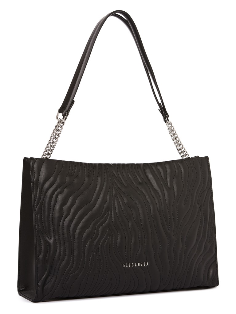 Женская сумка торговой марки Eleganzza из натуральной кожи. Внутри одно отделение с карманом на молнии и двумя открытыми карманами. Высота ручек - 27 см. Модель имеет ножки на дне. Вмещает формат А4.