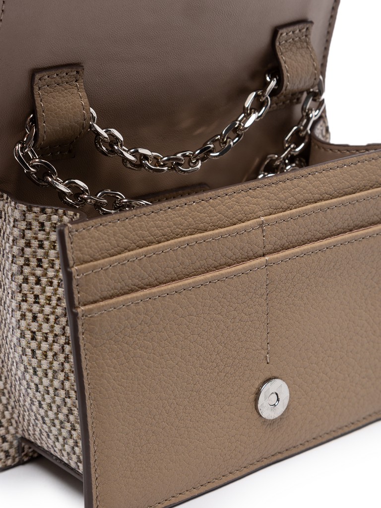 Женский органайзер торговой марки Labbra из натуральной кожи. Принт изделия отражает мировой тренд на натуральность и природные мотивы. Он нанесен на лицевую сторону натуральной кожи с использованием сеточной технологии, создавая эффект ткани из натурального льна. Тиснение подчеркивает текстуру, усиливая реалистичность рисунка. Модель закрывается клапаном на магнитную кнопку. Содержит внутри один отдел, под клапаном имеются четыре кармашка для пластиковых карт. Длина металлического наплечного ремня-цепочки - 103 см., ширина - 1 см. Модель не имеет ножки на дне. Не вмещает формат А4.