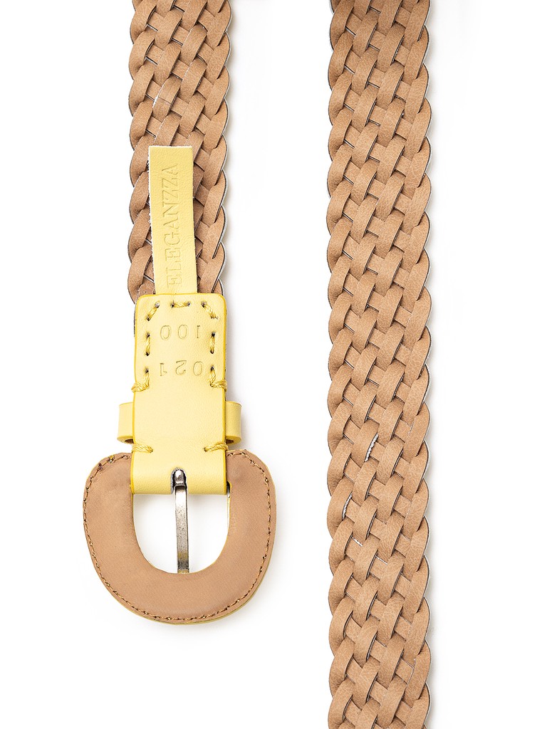 Женский ремень торговой марки ELEGANZZA из натуральной гладкой кожи. Внутренняя сторона ремня выполнена из микрофибры (современный материал, обладающий пластическими свойствами кожи и повышенной износостойкостью). Пряжка, имеющая металлическую основу, обтянута кожей. Лента ремня сплетена из тонких кожаных шнуров, что позволяет комфортно регулировать ремень по размеру. Кожаные шлёвки позволят аккуратно зафиксировать свободную часть ремня. Модель представлена в трёх длинах - 100 см., 110см. и 120 см.