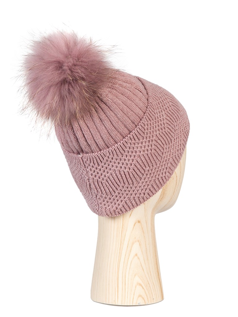 Классическая форма шапки-бини с отворотом из тонкой пряжи с добавлением шерсти и вискозы. Ажурная вязка, яркие цвета и натуральный съемный помпон из меха енота делают сделают ее любимым аксессуаром Вашего гардероба!