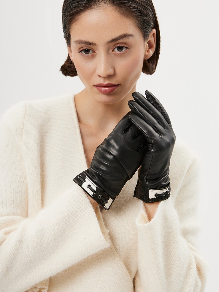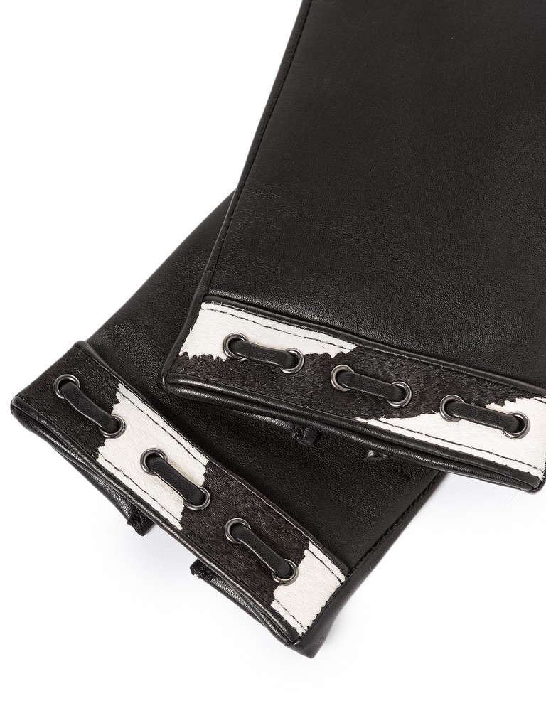 Перчатки женские торговой марки ELEGANZZA. Выполнены из высококачественной натуральной кожи ягненка на подкладе из мягкой шерсти. Трендовая анималистичная отделка: манжета из стриженного меха контрастного цвета, украшенная продержкой из тонкого кожаного шнурка, выполнена вручную и с особой тщательностью. Подгибка изделия выполнена с помощью уникальной технологии, объединяющей в себе преимущества ручной техники - эластичность и удобство посадки и машинной - эстетика и безупречная внутренняя отделка. Технология, по которой выполнена подгибка на манжете этих перчаток - эксклюзивная разработка и фирменное отличие бренда Eleganzza. Модель со средней длиной пальцев и длиной манжеты от нижней точки большого пальца до края перчаток - 4.5 см.