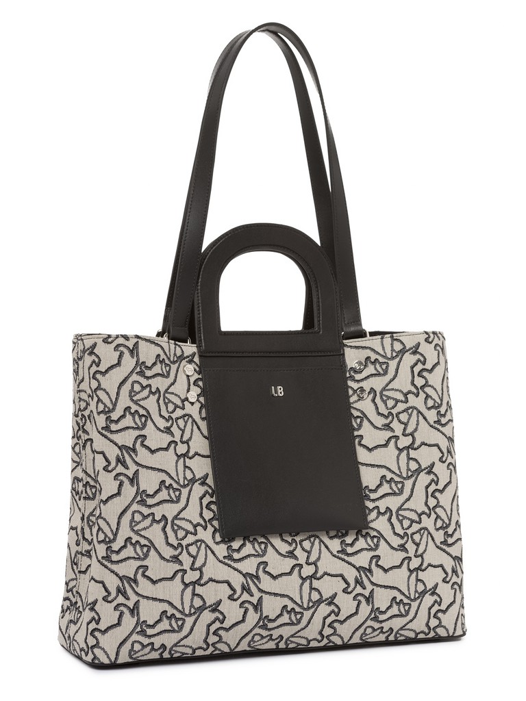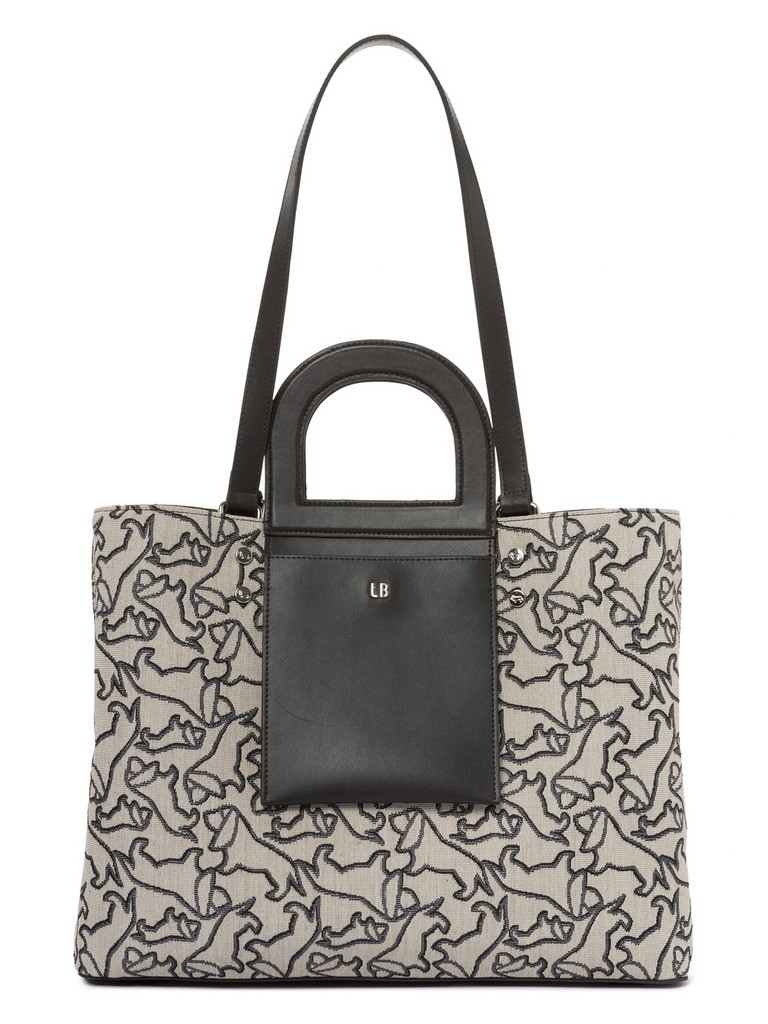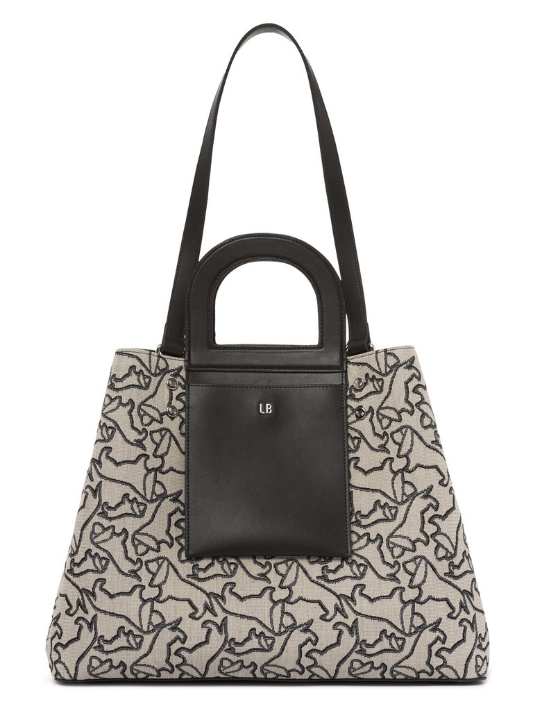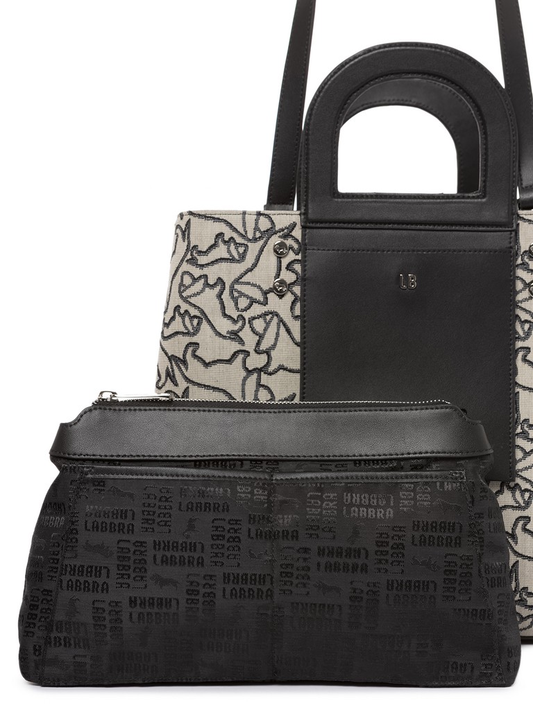 Женская сумка торговой марки Labbra из плотного жаккардового полиэстера с отделкой из натуральной кожи, декорированная эксклюзивным авторским принтом с символикой бренда - собачкой. Модель застегивается на магнитную кнопку и хлястик. Внутри одно отделение с карманом на молнии, открытым карманом и вкладной косметичкой. Косметичка имеет два внешних открытых кармана и внутренний карман на молнии. На передней стенке сумки есть открытый карман. Высота ручек - 27 см. Модель не имеет ножек на дне. Вмещает формат А4.