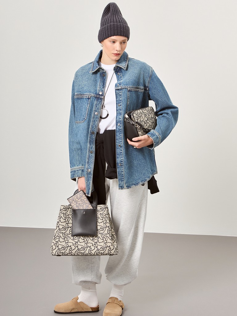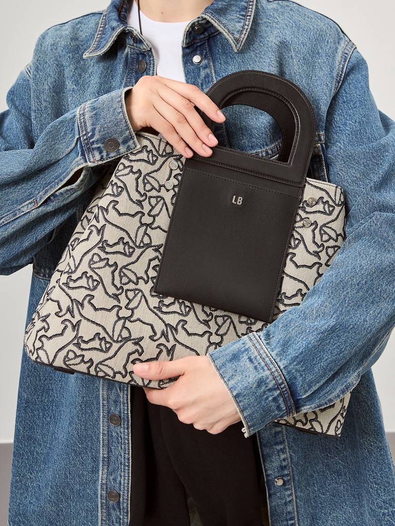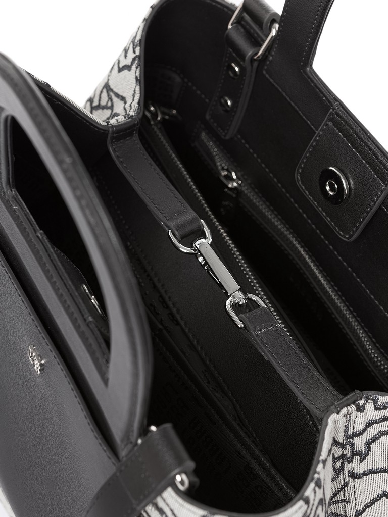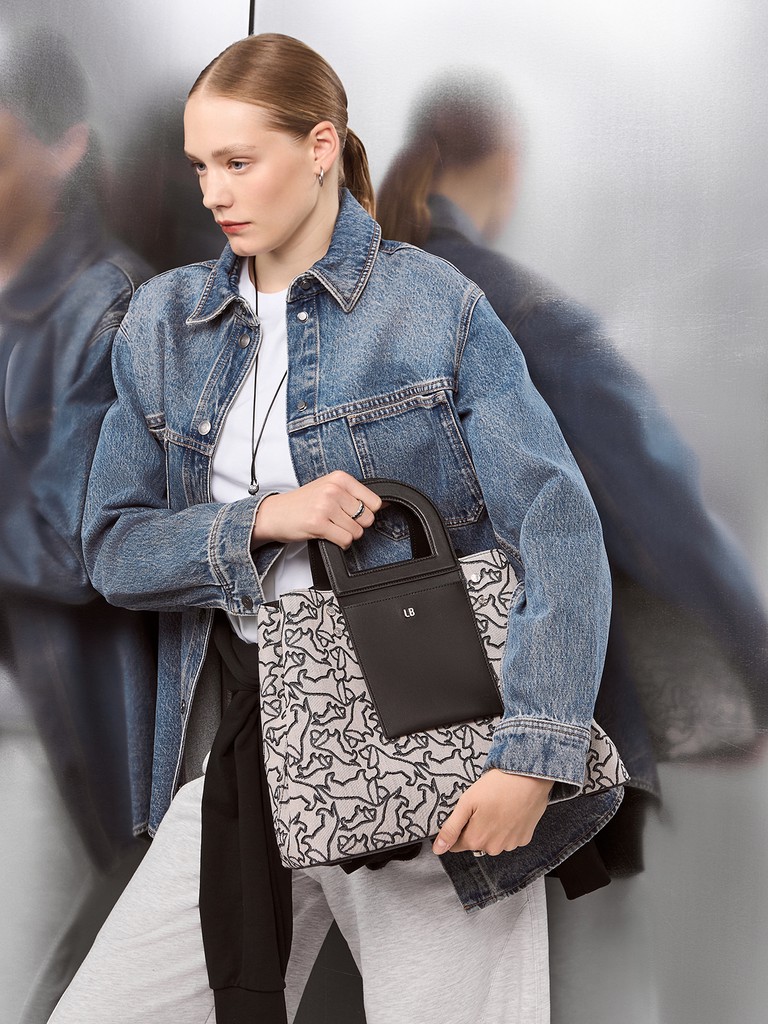 Женская сумка торговой марки Labbra из плотного жаккардового полиэстера с отделкой из натуральной кожи, декорированная эксклюзивным авторским принтом с символикой бренда - собачкой. Модель застегивается на магнитную кнопку и хлястик. Внутри одно отделение с карманом на молнии, открытым карманом и вкладной косметичкой. Косметичка имеет два внешних открытых кармана и внутренний карман на молнии. На передней стенке сумки есть открытый карман. Высота ручек - 27 см. Модель не имеет ножек на дне. Вмещает формат А4.