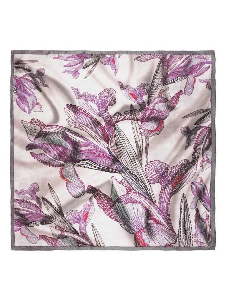 Платок женский торговой марки ELEGANZZA из натурального шелка. Авторский принт имитирует ирисы, вышитые на бархате, объединяя при этом два актуальных тренда: роскошь бархатной текстуры и ценность ручной работы. Ручная подгибка на лицевую сторону. В пару к платку предлагается зонт-автомат в том же дизайне.