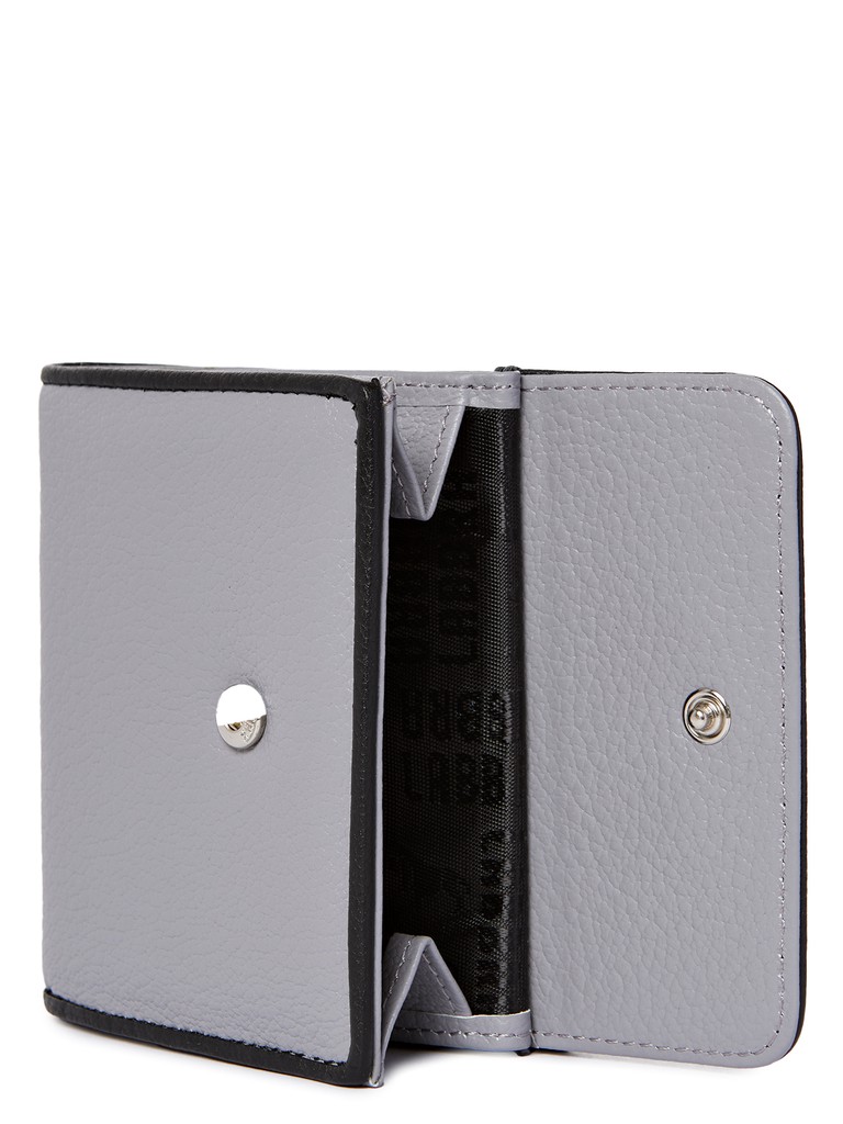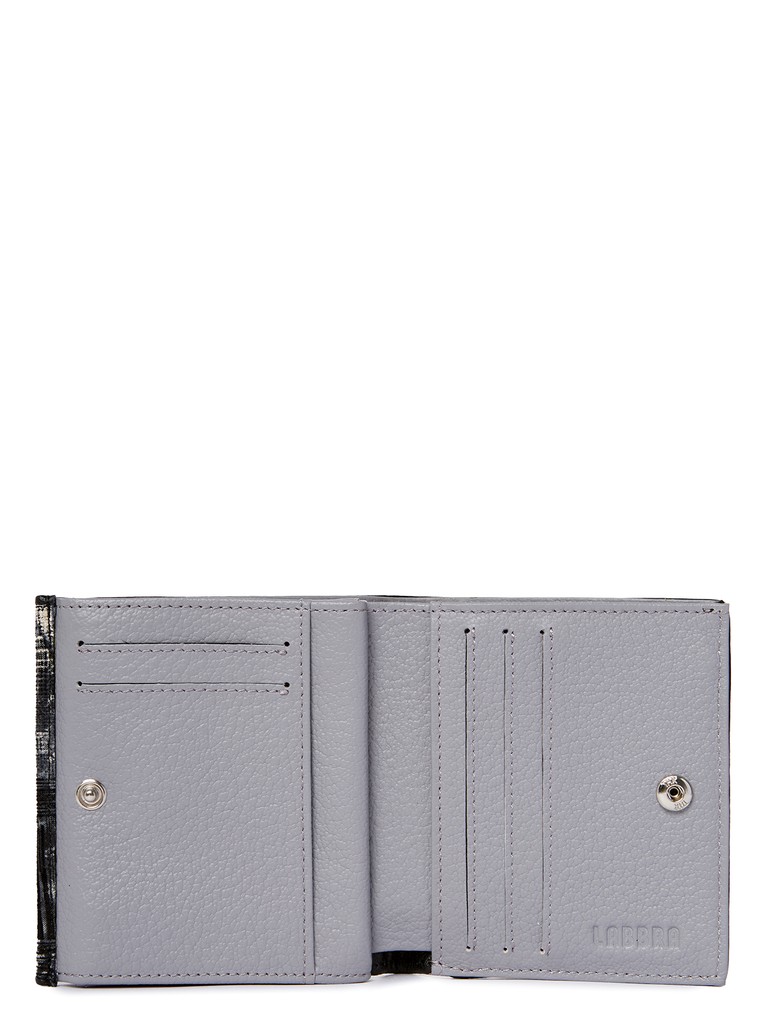 Женский кошелёк торговой марки LABBRA из натуральной кожи. Основное отделение закрывается на кнопку. Внутри: два складывающихся отделения для купюр, одно из которых закрывается на дополнительную пластиковую молнию; пять карманов для карточек и два дополнительных плоских кармана. Снаружи кошелька имеется отделение для мелочи, которое закрывается клапаном с кнопкой.