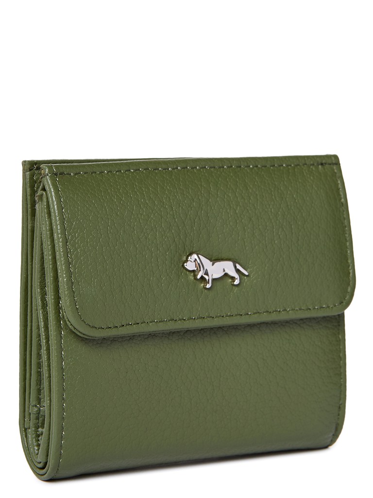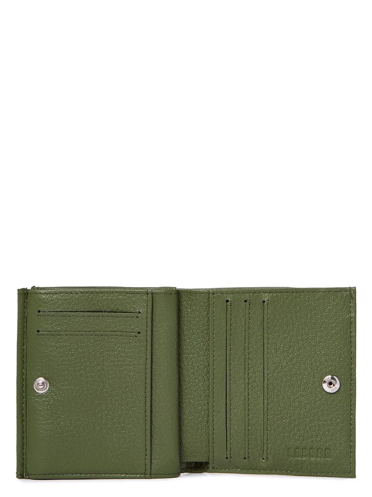 Женский кошелёк торговой марки LABBRA из нейлона. Основное отделение закрывается на кнопку. Внутри: два складывающихся отделения для купюр, одно из которых закрывается на дополнительную пластиковую молнию; пять карманов для карточек и два дополнительных плоских кармана. Снаружи кошелька имеется отделение для мелочи, которое закрывается клапаном с кнопкой.